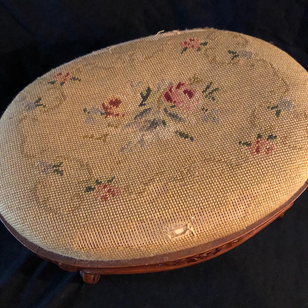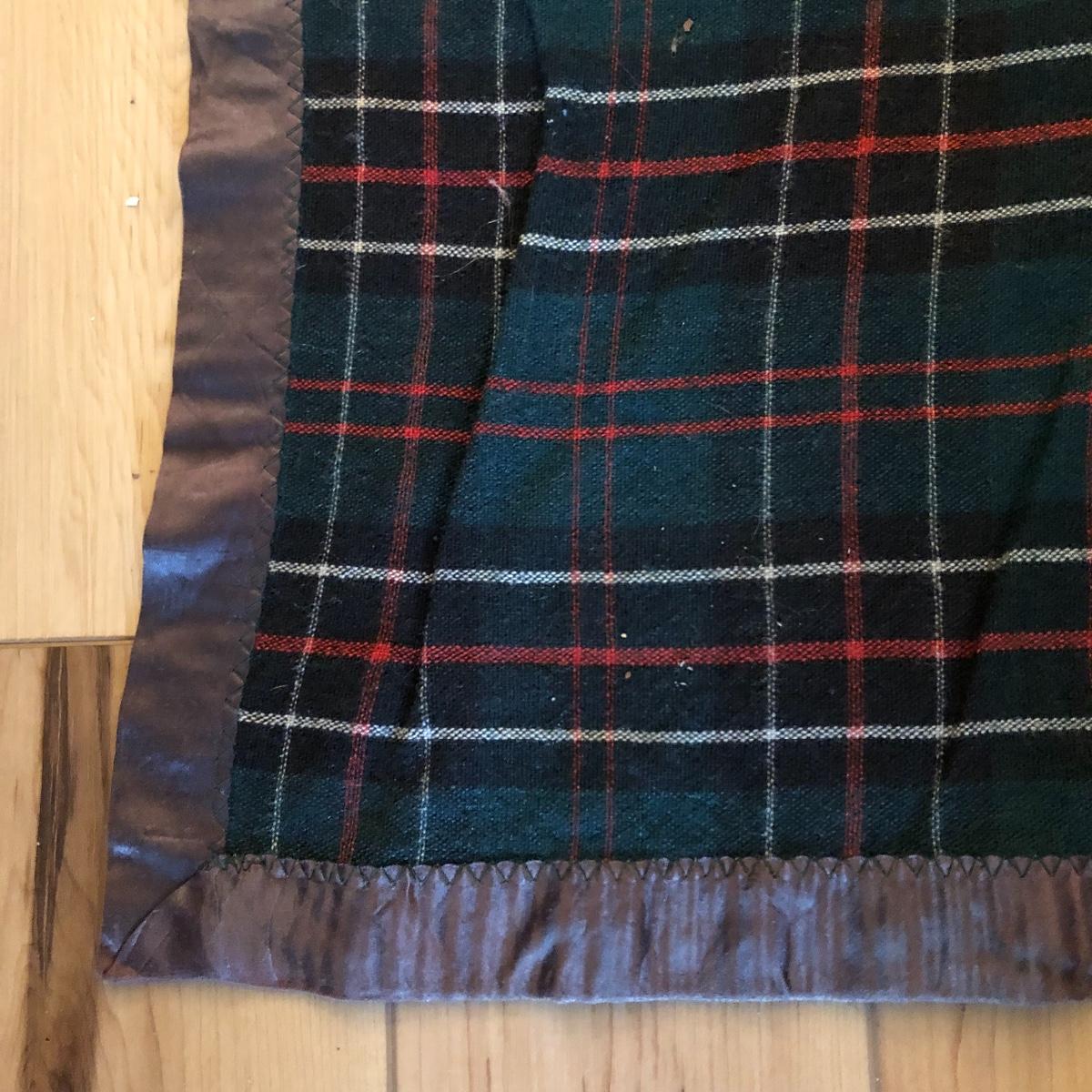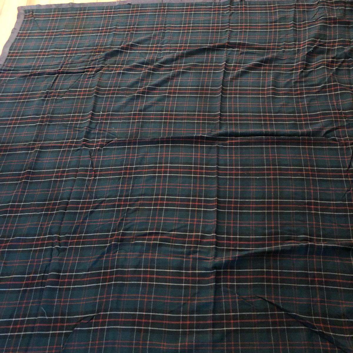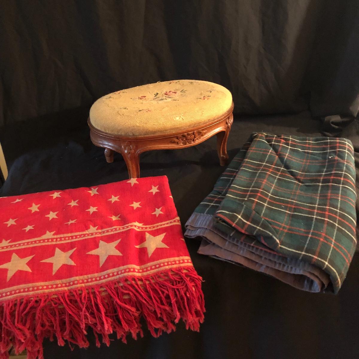 Footstool dimensions are 15.5” x 11” x 7.5”. Please note holes in the embroidered top. The base is solid wood. The red throw is approximately 51” x 68”. It has no tags and is a woven fabric. The plaid blanket feels as if it is wool and is labeled “Fieldcrest.” It is about 85” x 70”. Shipping Available.