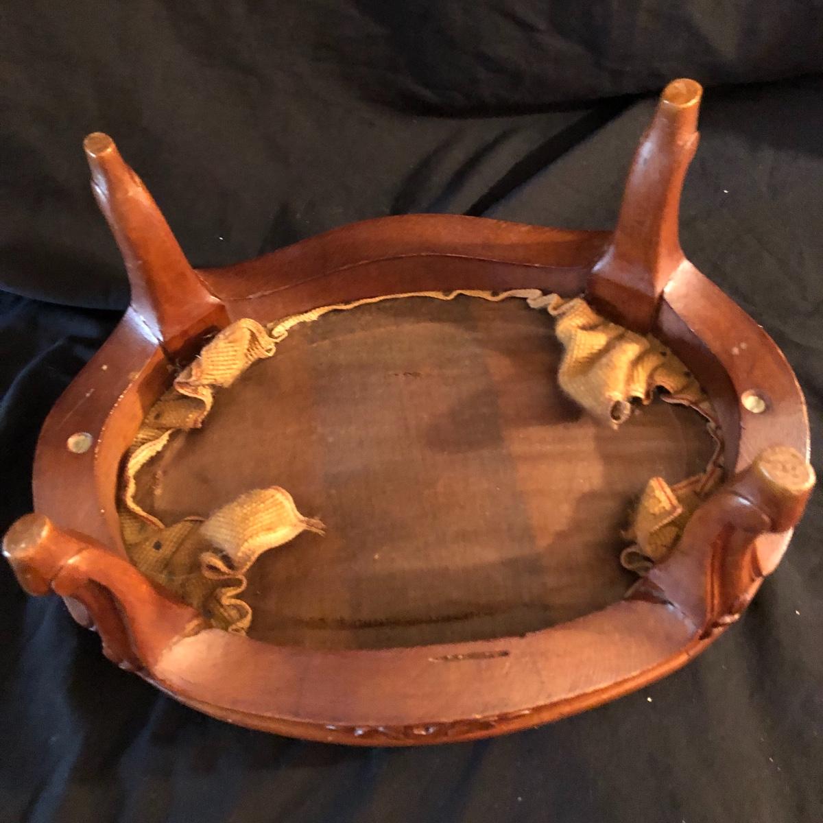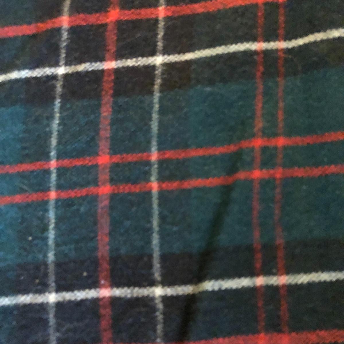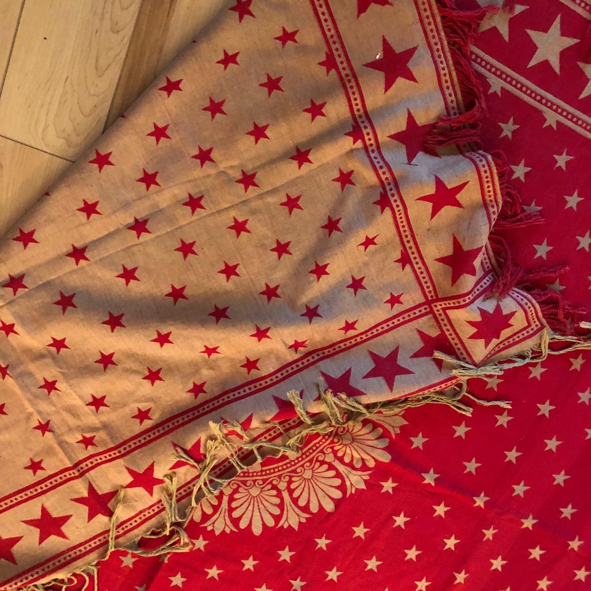 Footstool dimensions are 15.5” x 11” x 7.5”. Please note holes in the embroidered top. The base is solid wood. The red throw is approximately 51” x 68”. It has no tags and is a woven fabric. The plaid blanket feels as if it is wool and is labeled “Fieldcrest.” It is about 85” x 70”. Shipping Available.