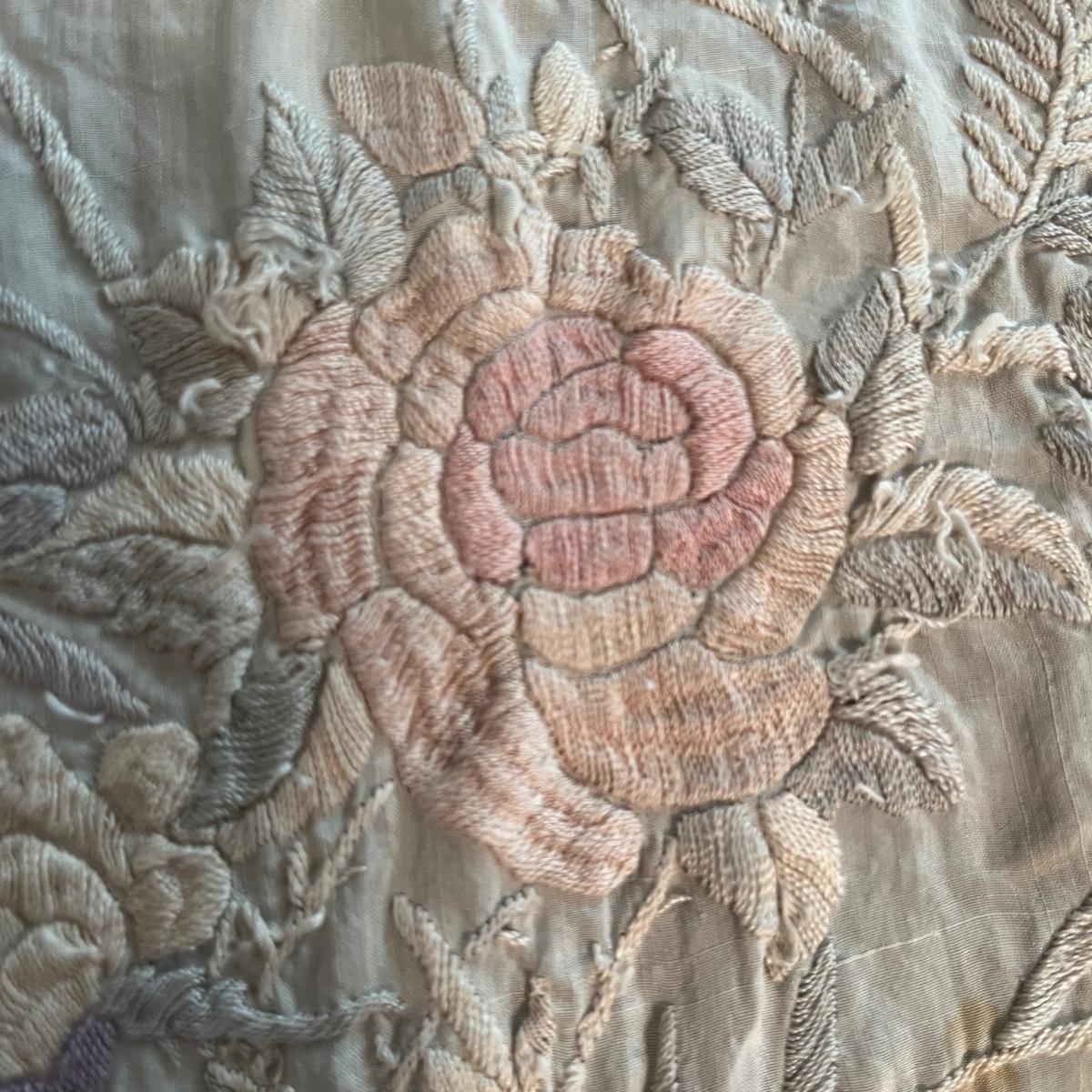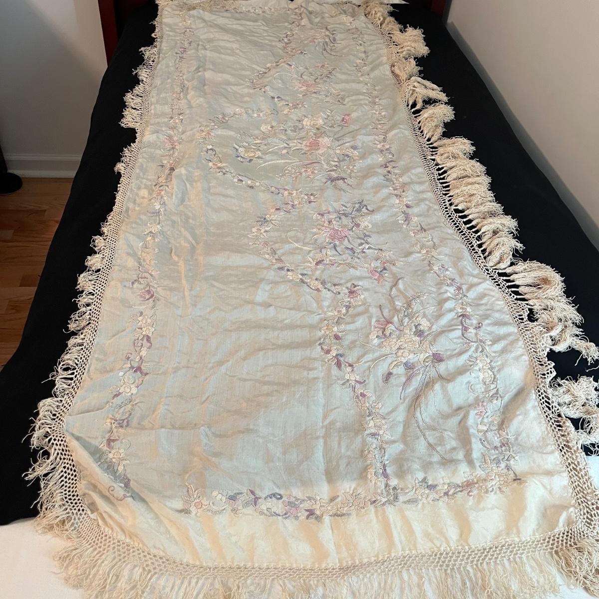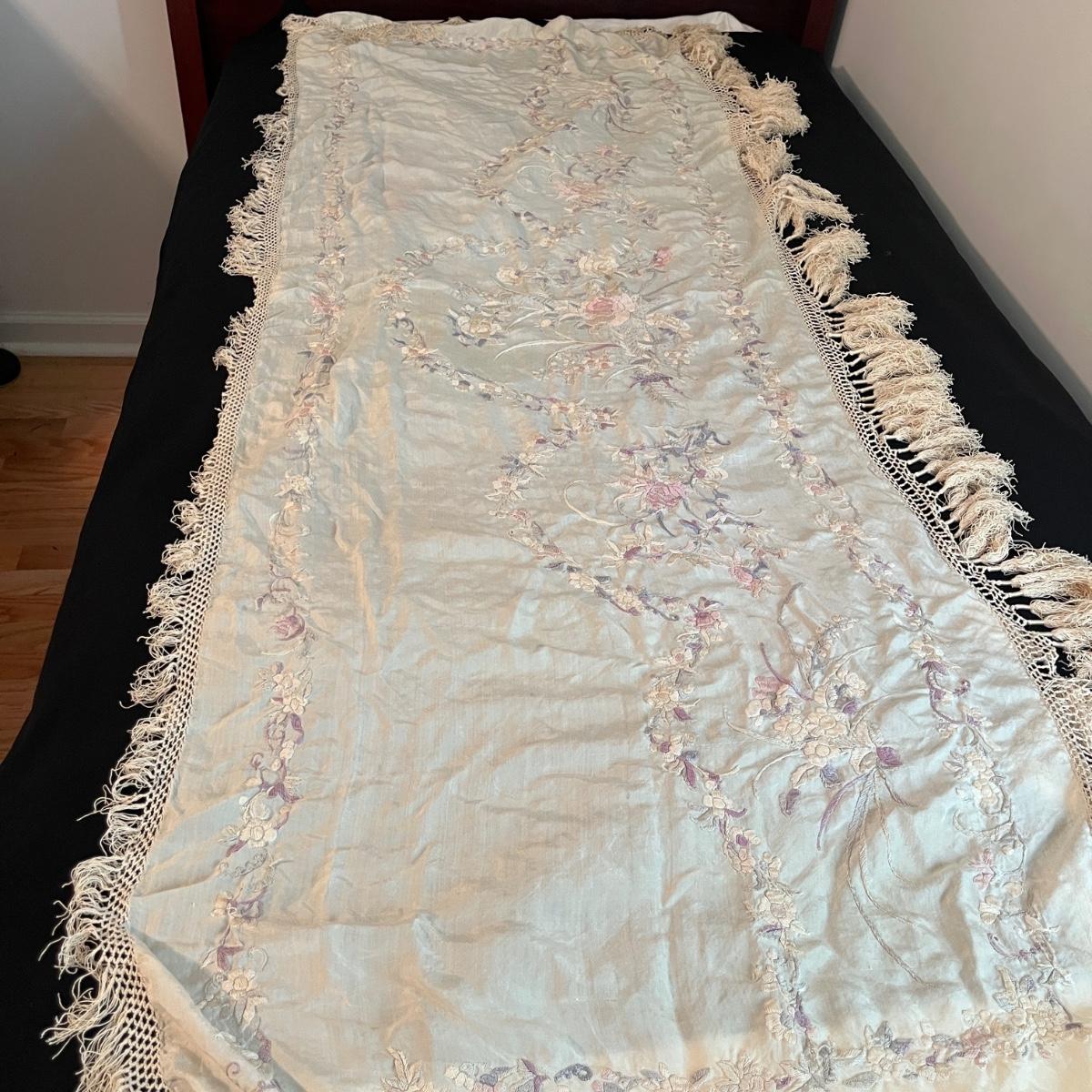 Lot includes an embroidered fringed shawl that measures 28” x 71”. Also includes a round hand painted linen, eight matching small circular linens and a matching piece on paper. Large round linen measures 26”D.