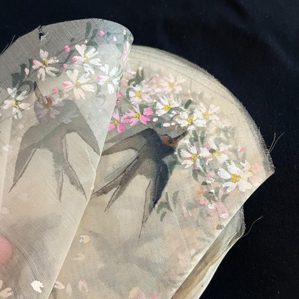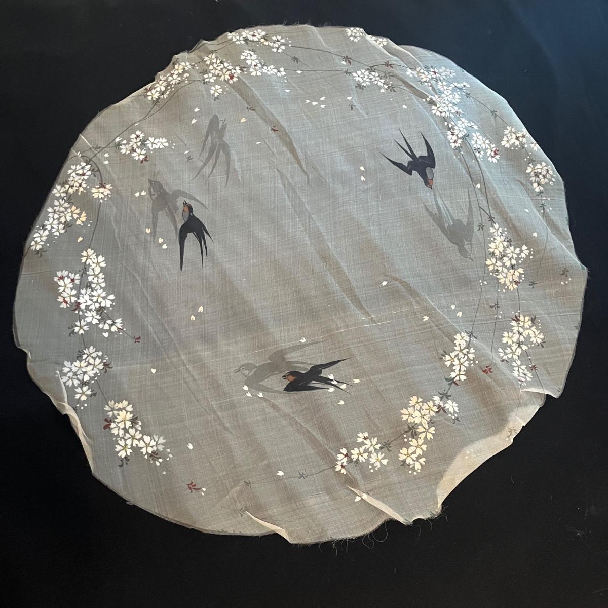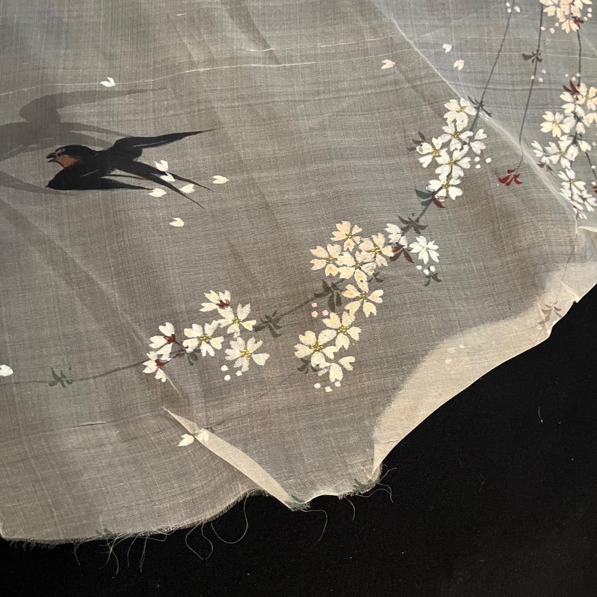 Lot includes an embroidered fringed shawl that measures 28” x 71”. Also includes a round hand painted linen, eight matching small circular linens and a matching piece on paper. Large round linen measures 26”D.