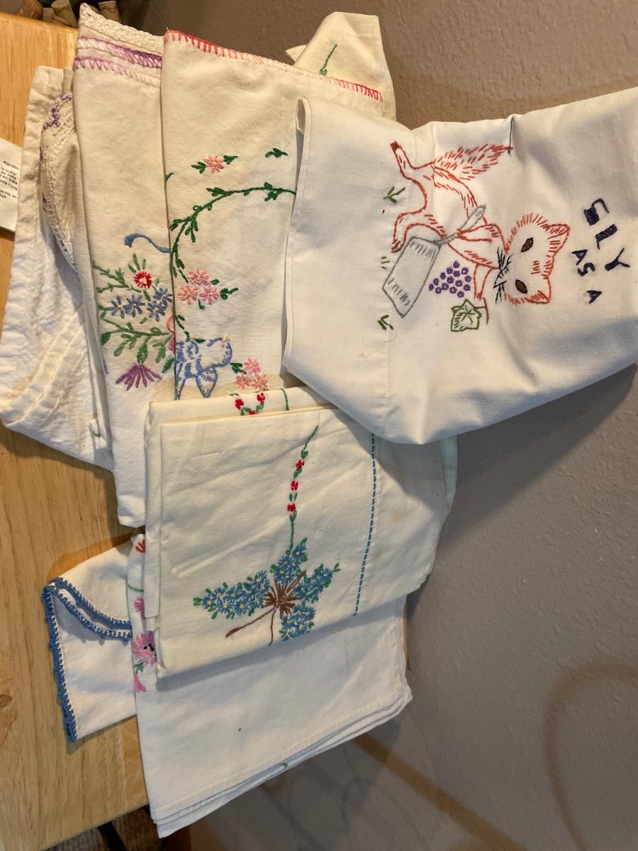 Embroidered pillowcases, table, runners, and holder