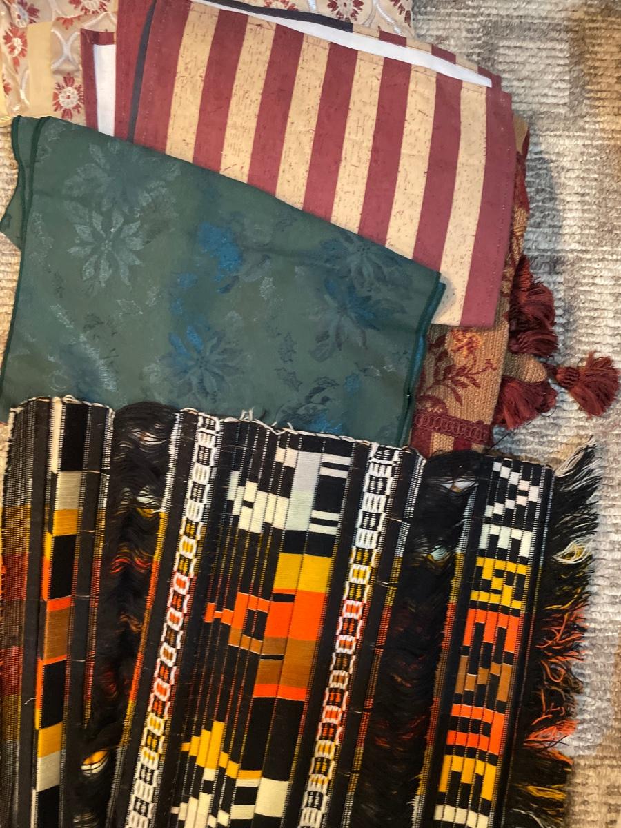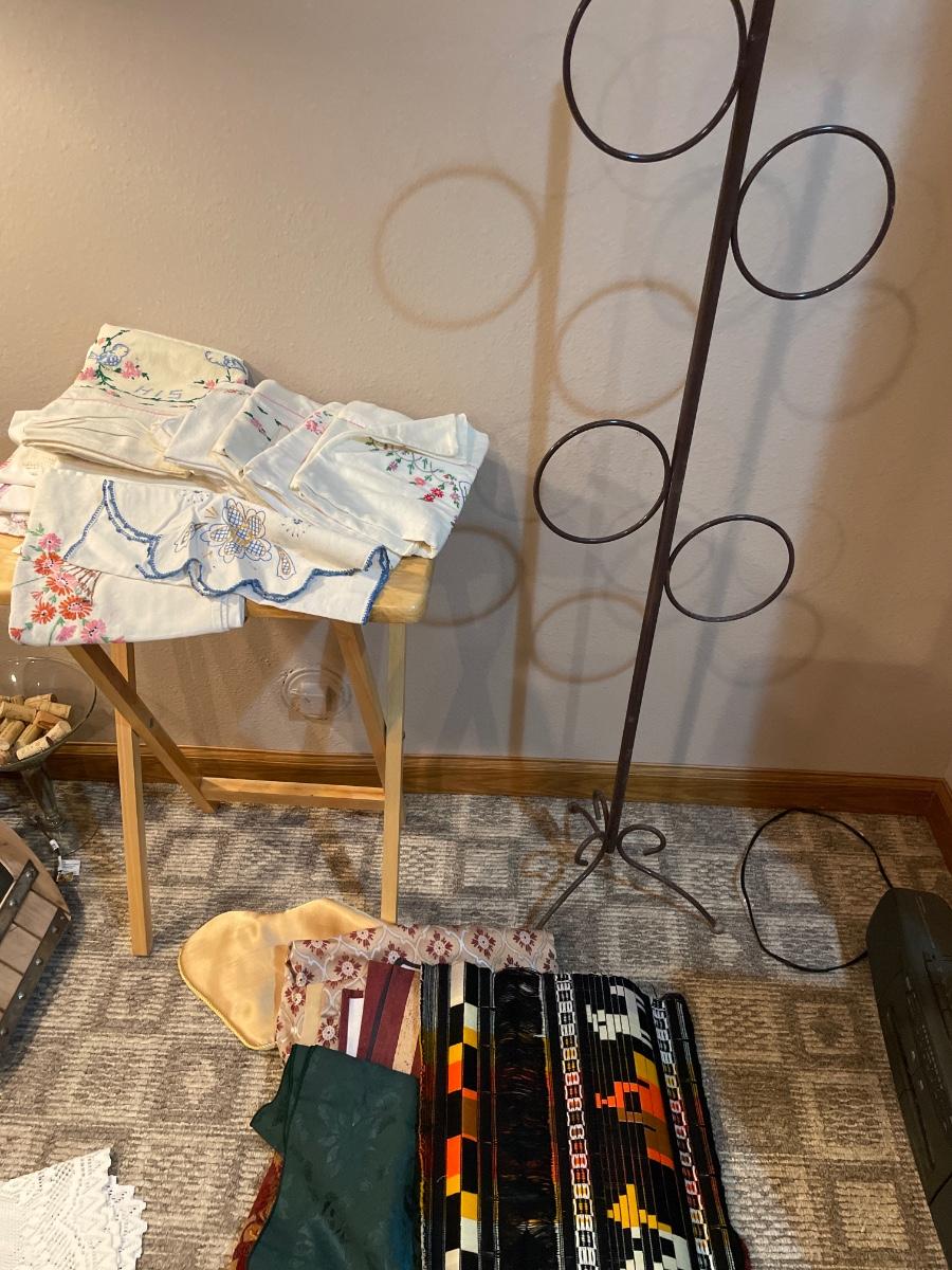Freestanding towel rack with many embroidered pillowcase and table runners