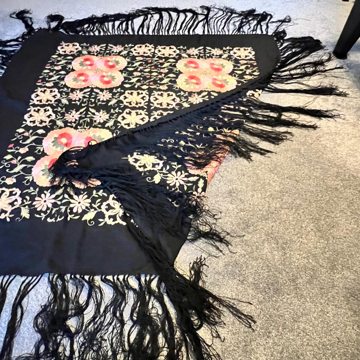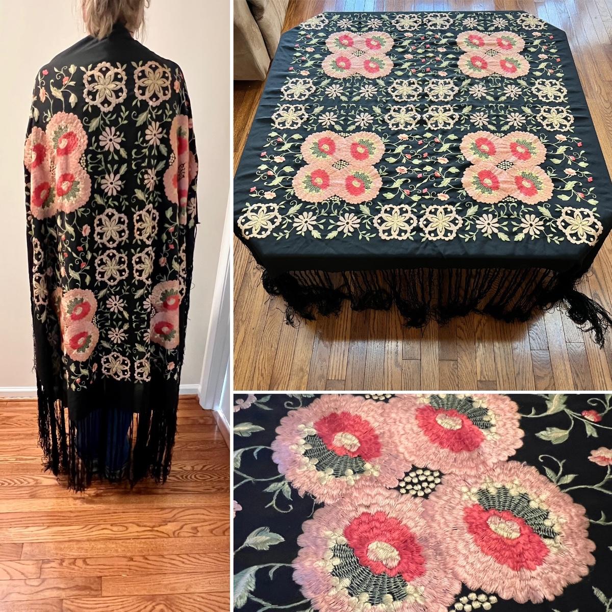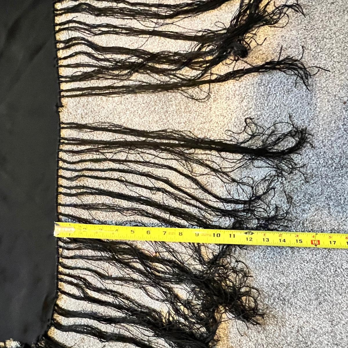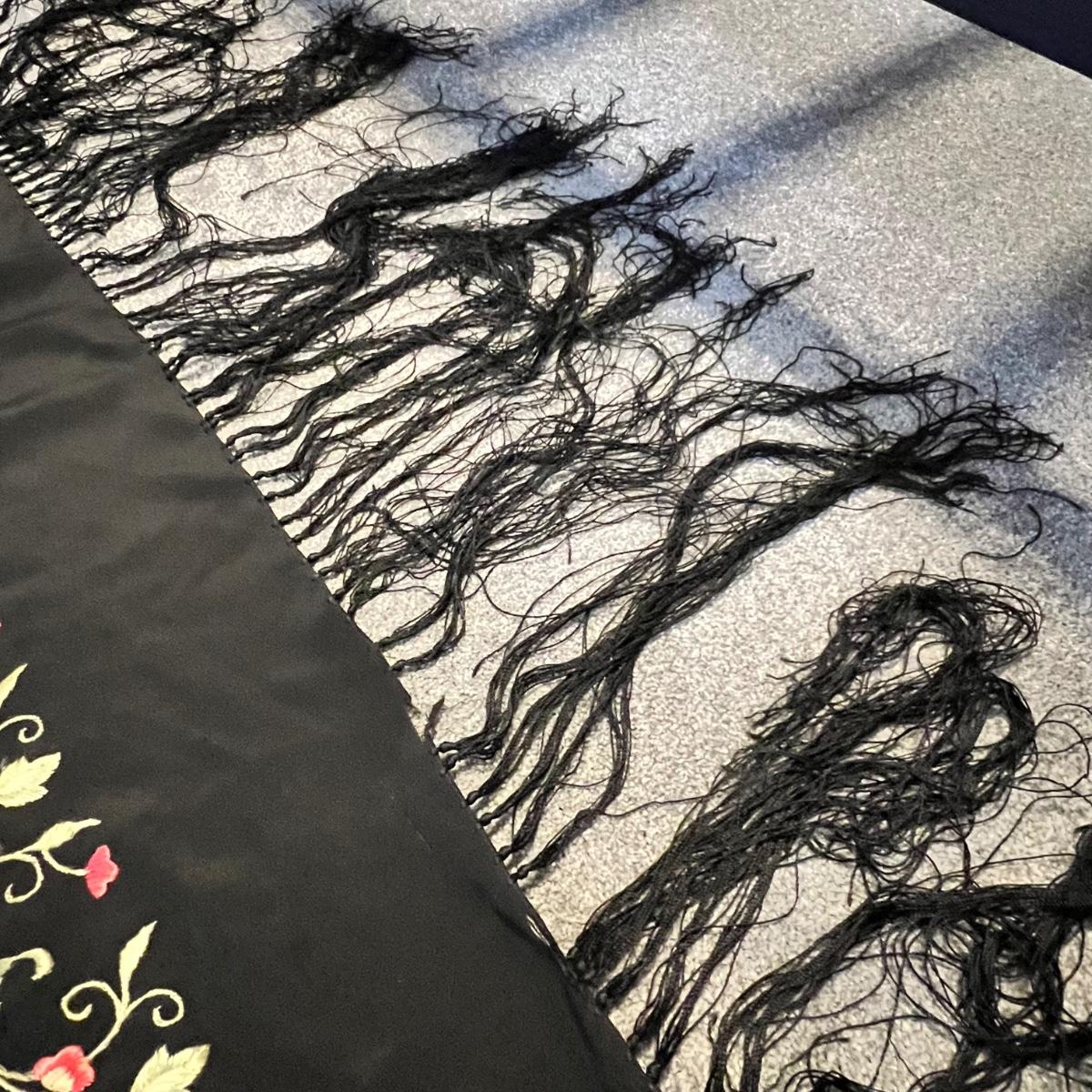 This shawl is simply stunning! It appears to be black silk with embroidered pink flowers. The long tassels appear to have been hand knotted. The scarf minus the tassels measures 48” square. It does have a few tassels missing and there is a small, approximately half inch rip, see photos.