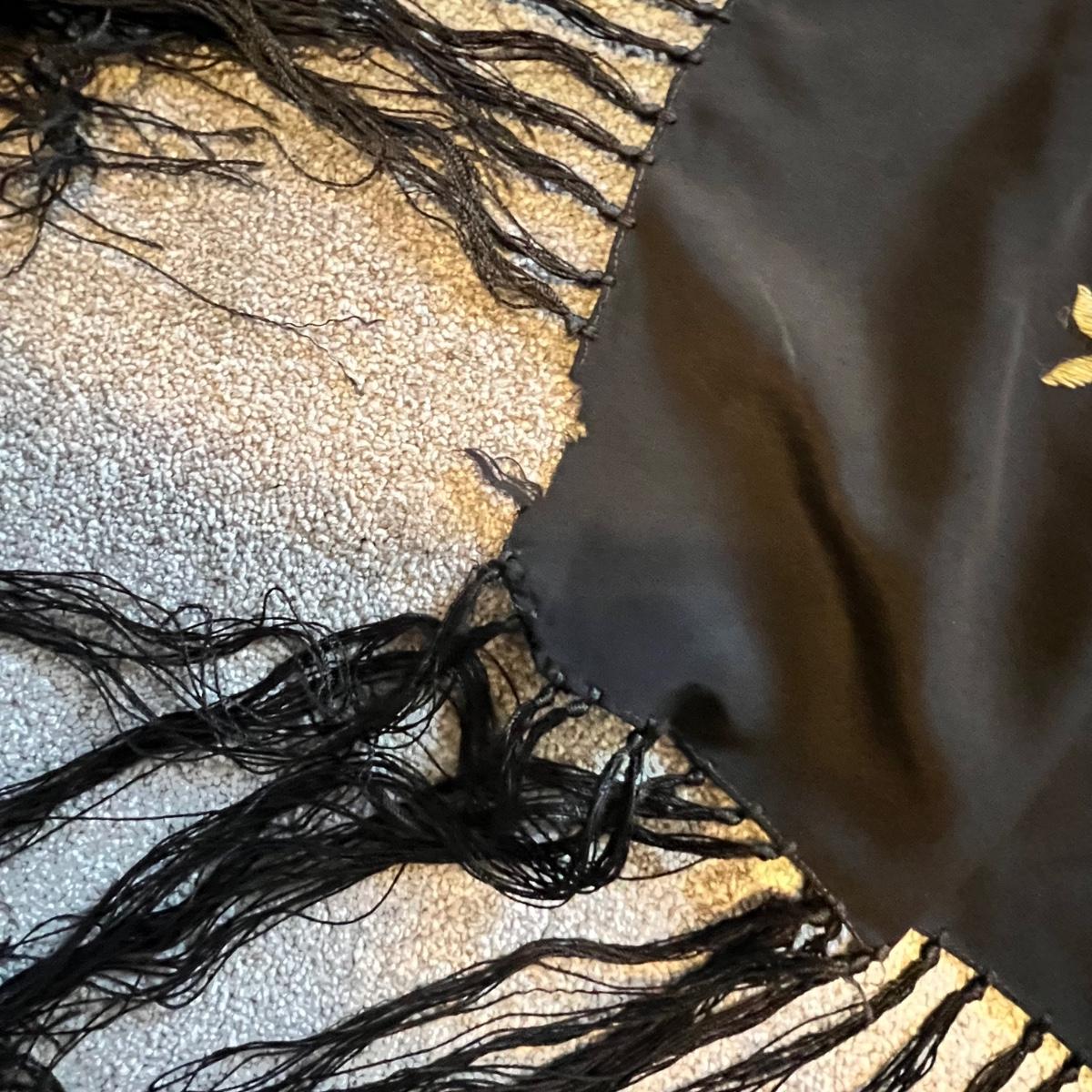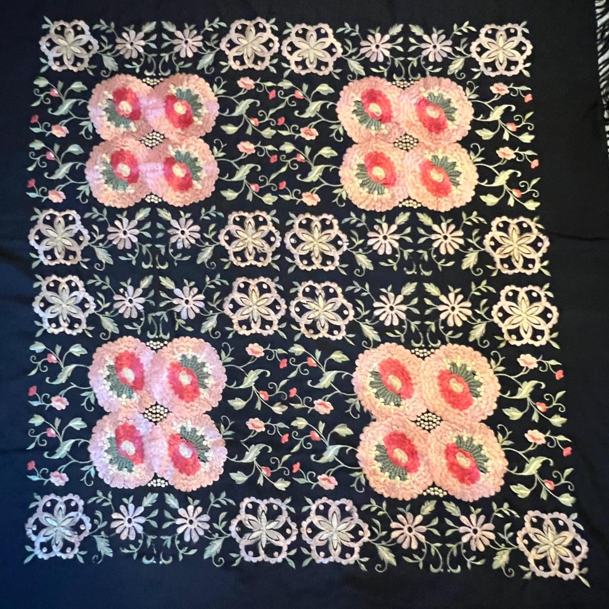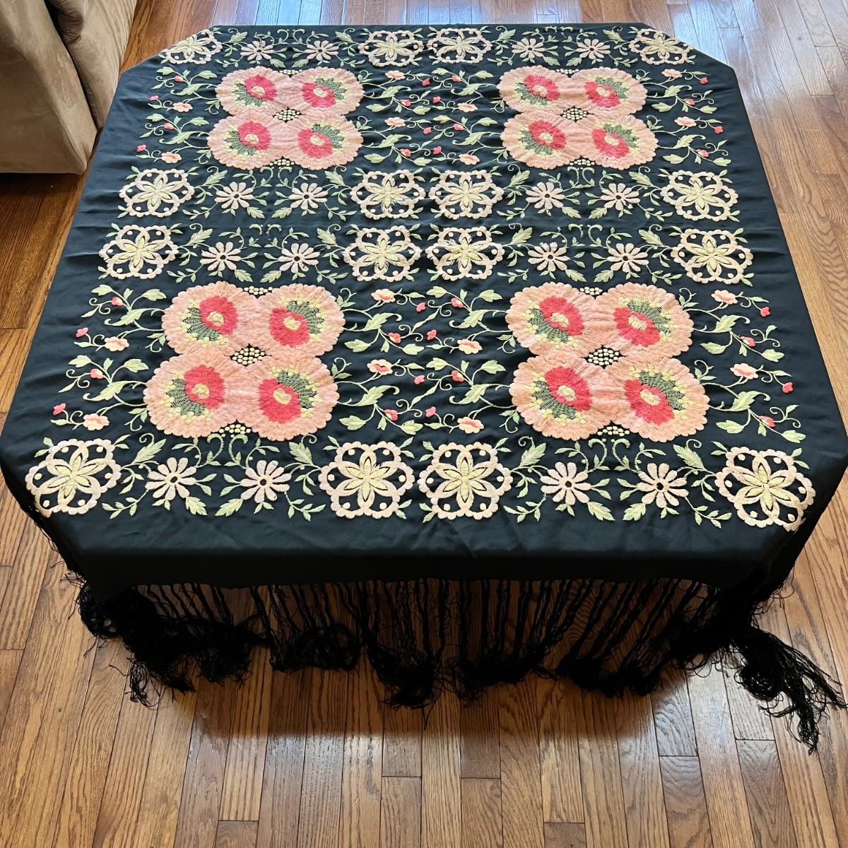 This shawl is simply stunning! It appears to be black silk with embroidered pink flowers. The long tassels appear to have been hand knotted. The scarf minus the tassels measures 48” square. It does have a few tassels missing and there is a small, approximately half inch rip, see photos.