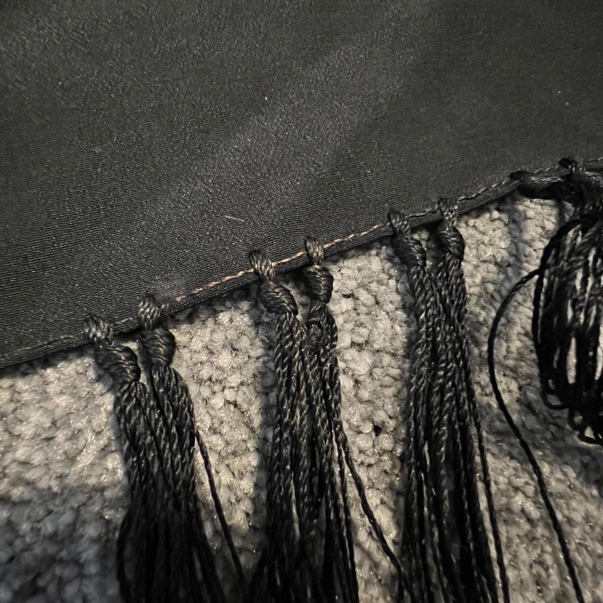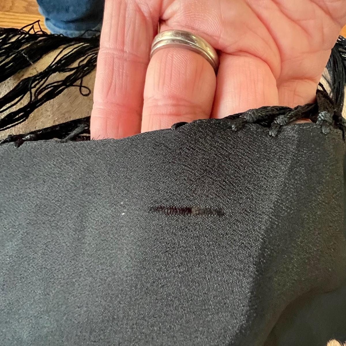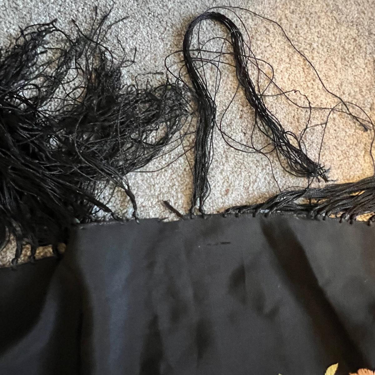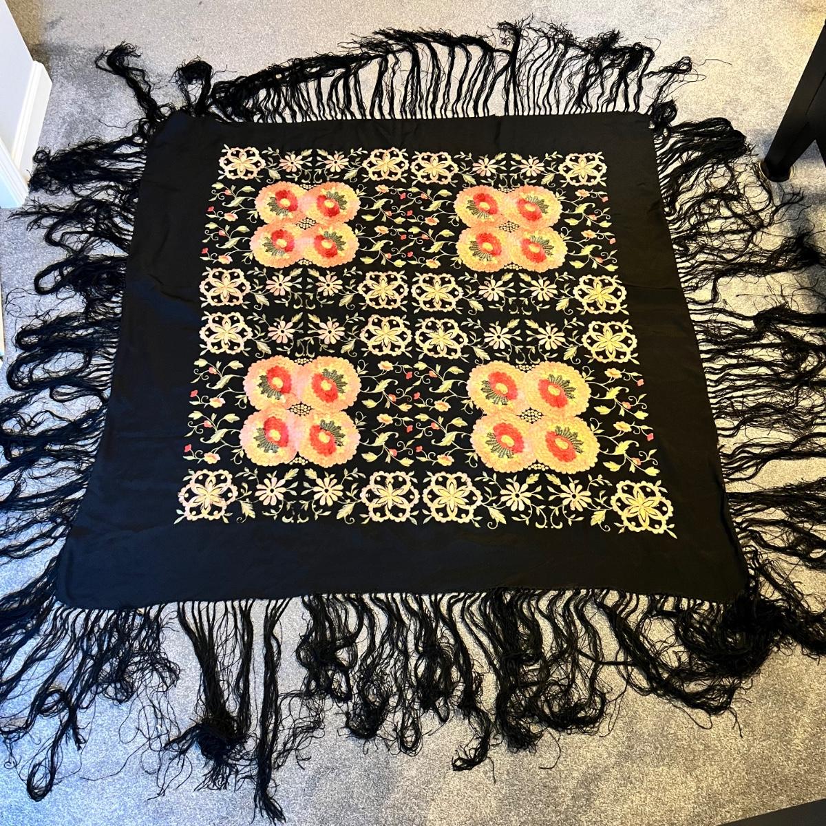This shawl is simply stunning! It appears to be black silk with embroidered pink flowers. The long tassels appear to have been hand knotted. The scarf minus the tassels measures 48” square. It does have a few tassels missing and there is a small, approximately half inch rip, see photos.