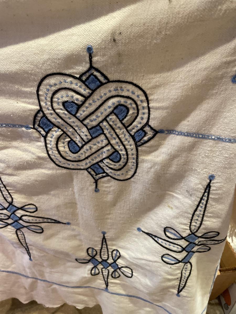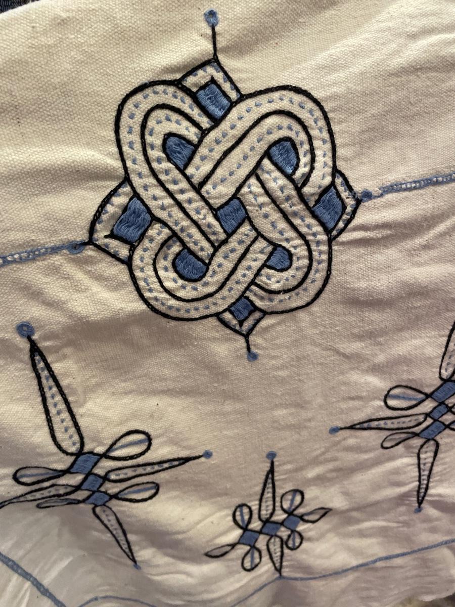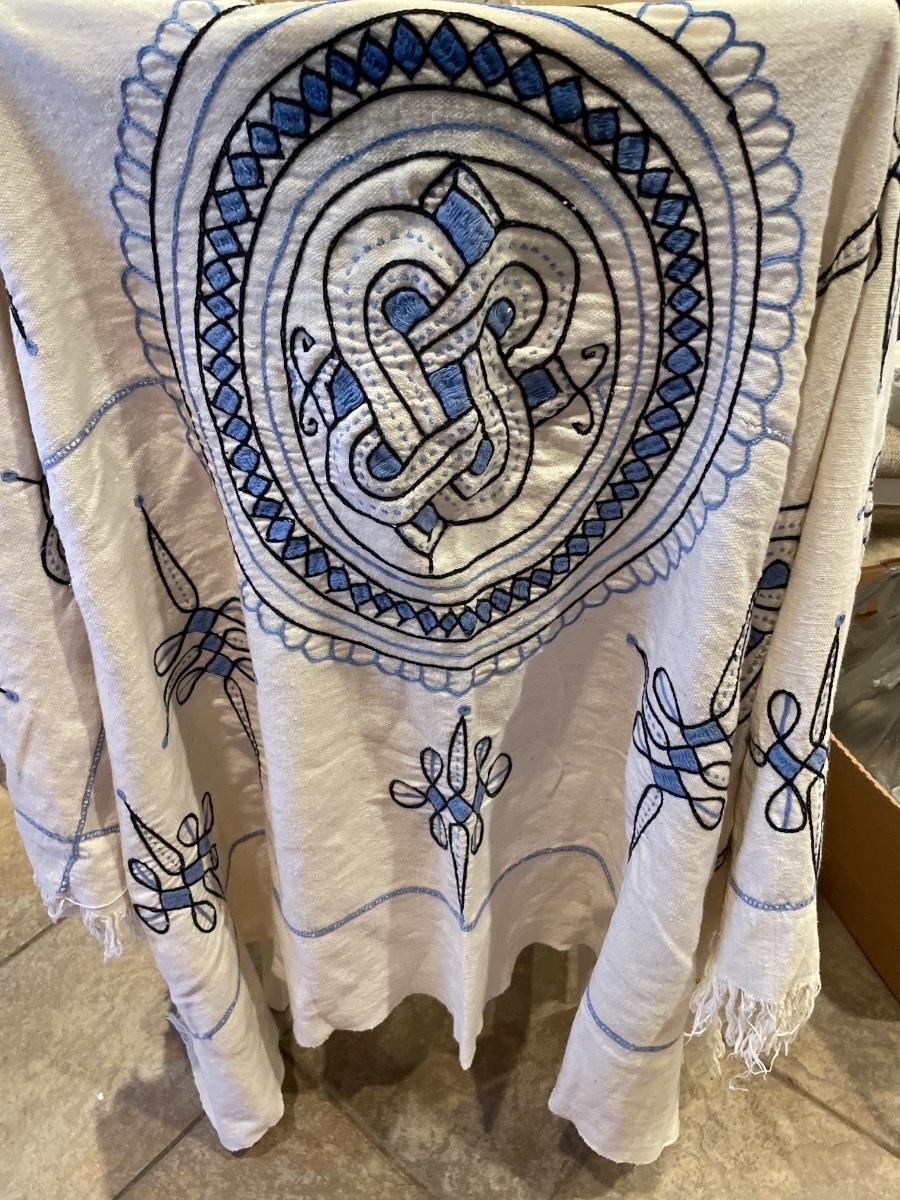 Lovely periwinkle blue and black designs on this fringe edge table covering