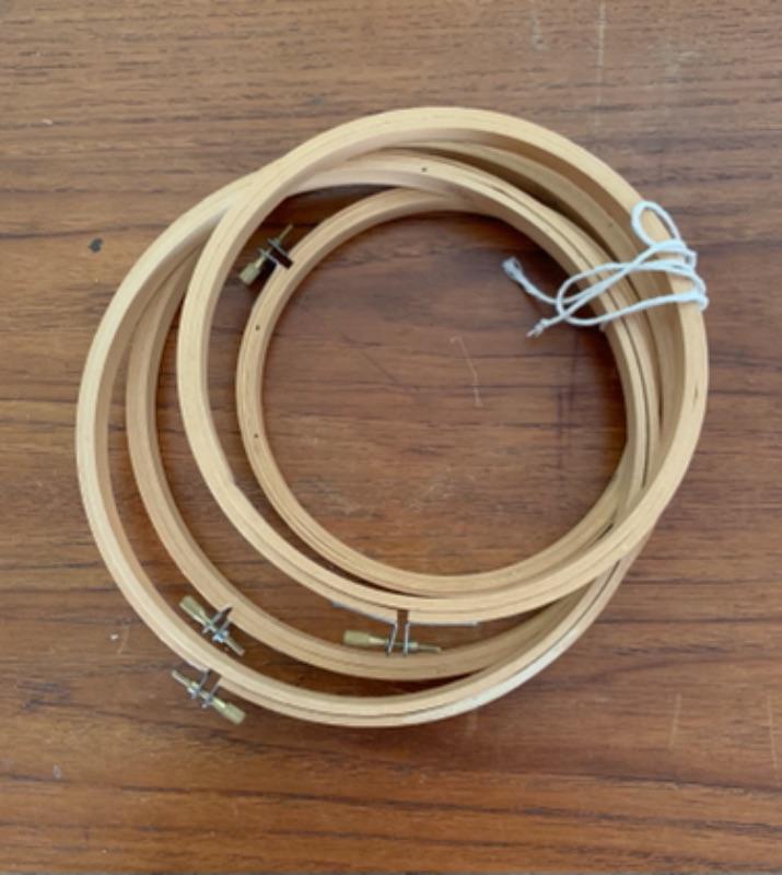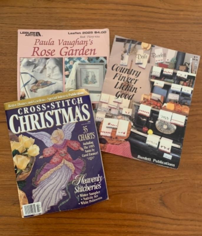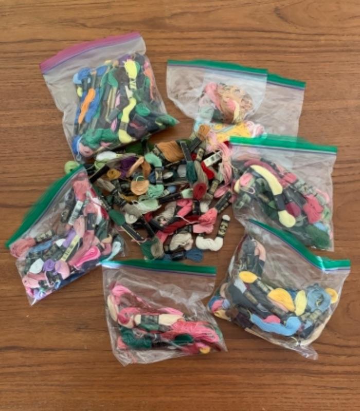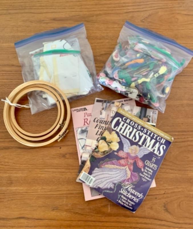Huge lot of embroidery floss. vintage cross stitch patterns, instruction booklets and a couple unfinished projects. Four wooden embroidery hoops.