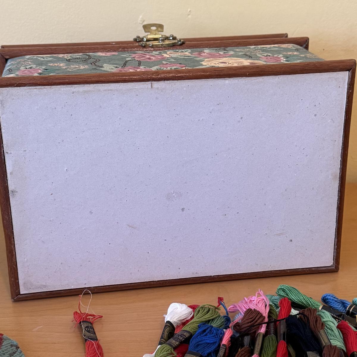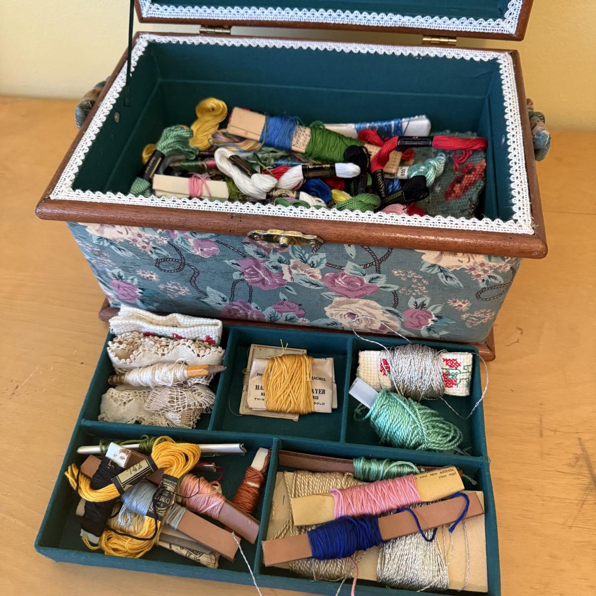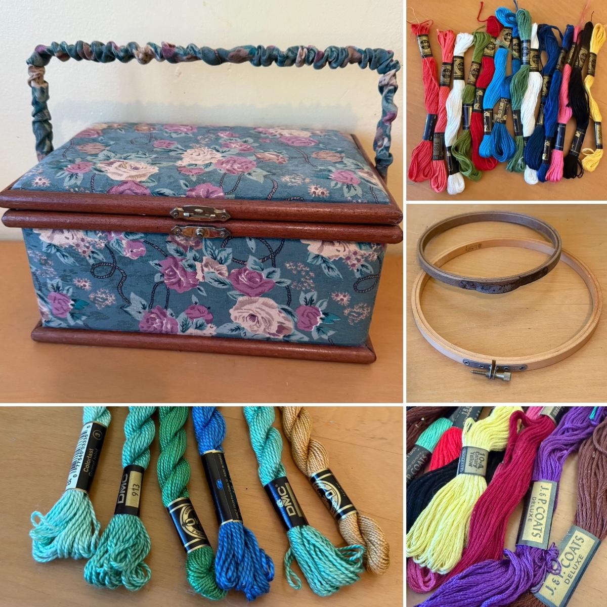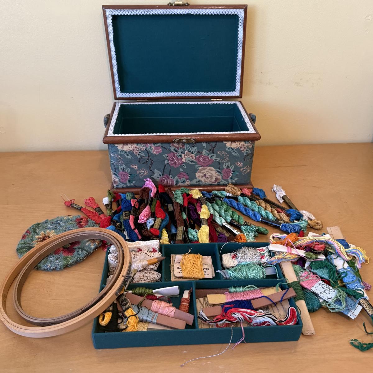 Over 45 unused or barely used skeins of embroidery floss from J & P Coates, DMC, and Lily Mills (Shelby, NC made). Also, a good handful of skeins are included that have some floss used from them. Two wooden embroidery hoops are 6”D and 7”D. A wood and cushioned fabric sewing basket is included as well; it is 11.5” x 7.5” x 6”H. A small blemish is seen in the wood on the back of the sewing basket.
