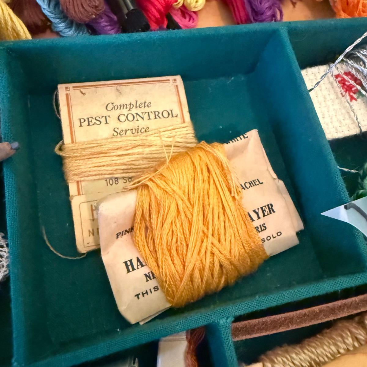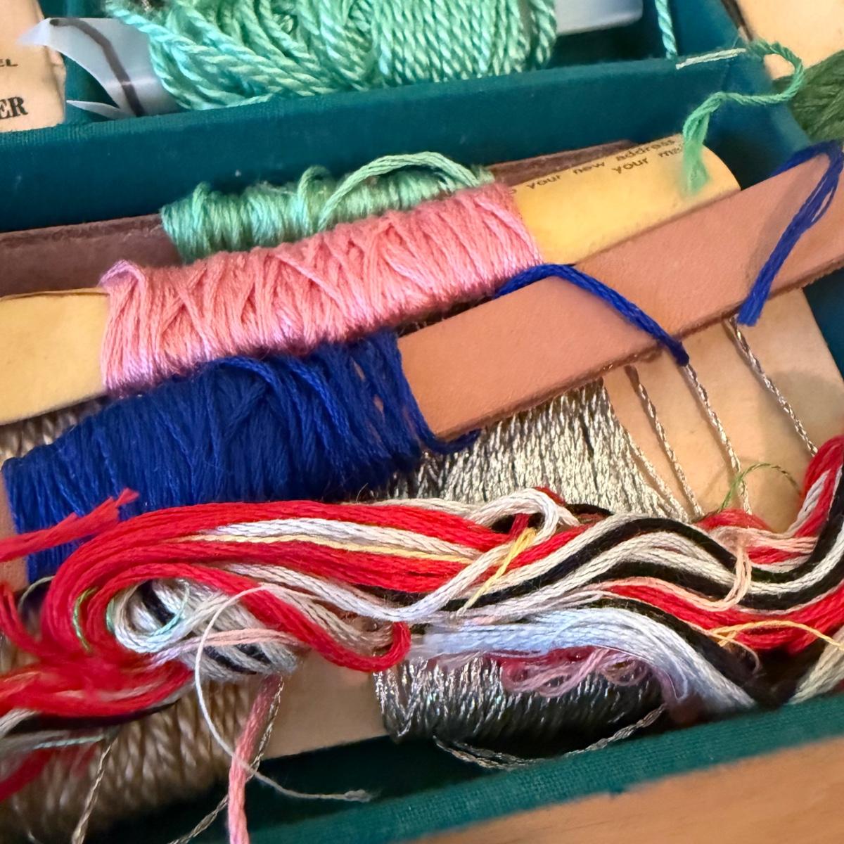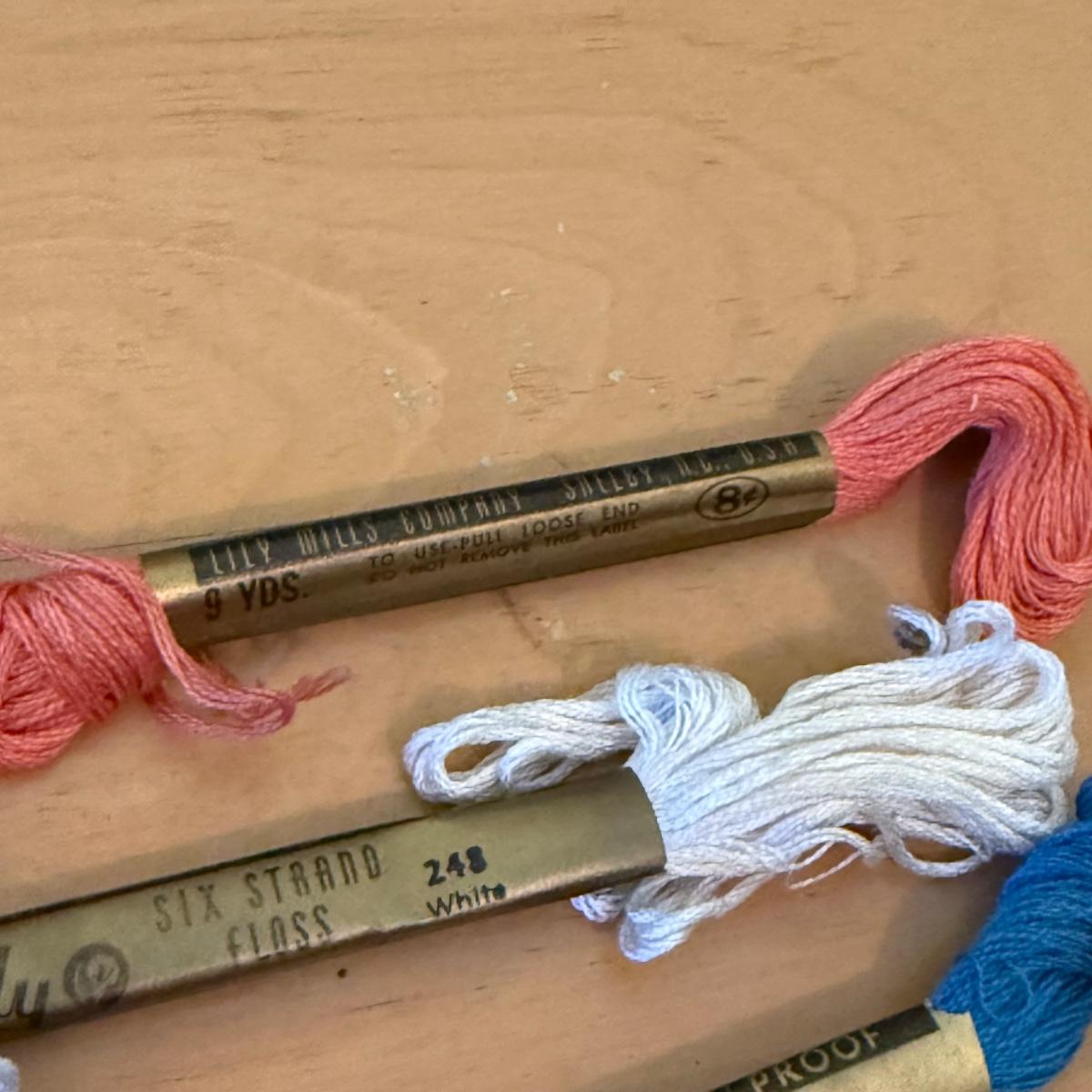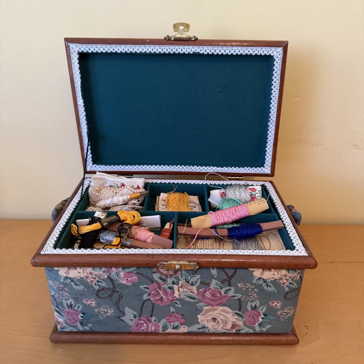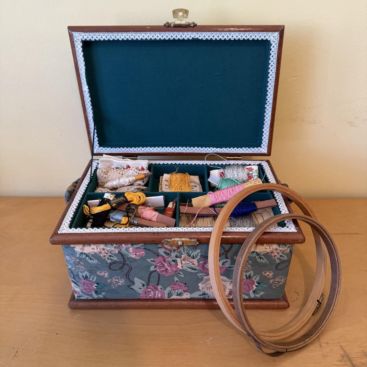 Over 45 unused or barely used skeins of embroidery floss from J & P Coates, DMC, and Lily Mills (Shelby, NC made). Also, a good handful of skeins are included that have some floss used from them. Two wooden embroidery hoops are 6”D and 7”D. A wood and cushioned fabric sewing basket is included as well; it is 11.5” x 7.5” x 6”H. A small blemish is seen in the wood on the back of the sewing basket.