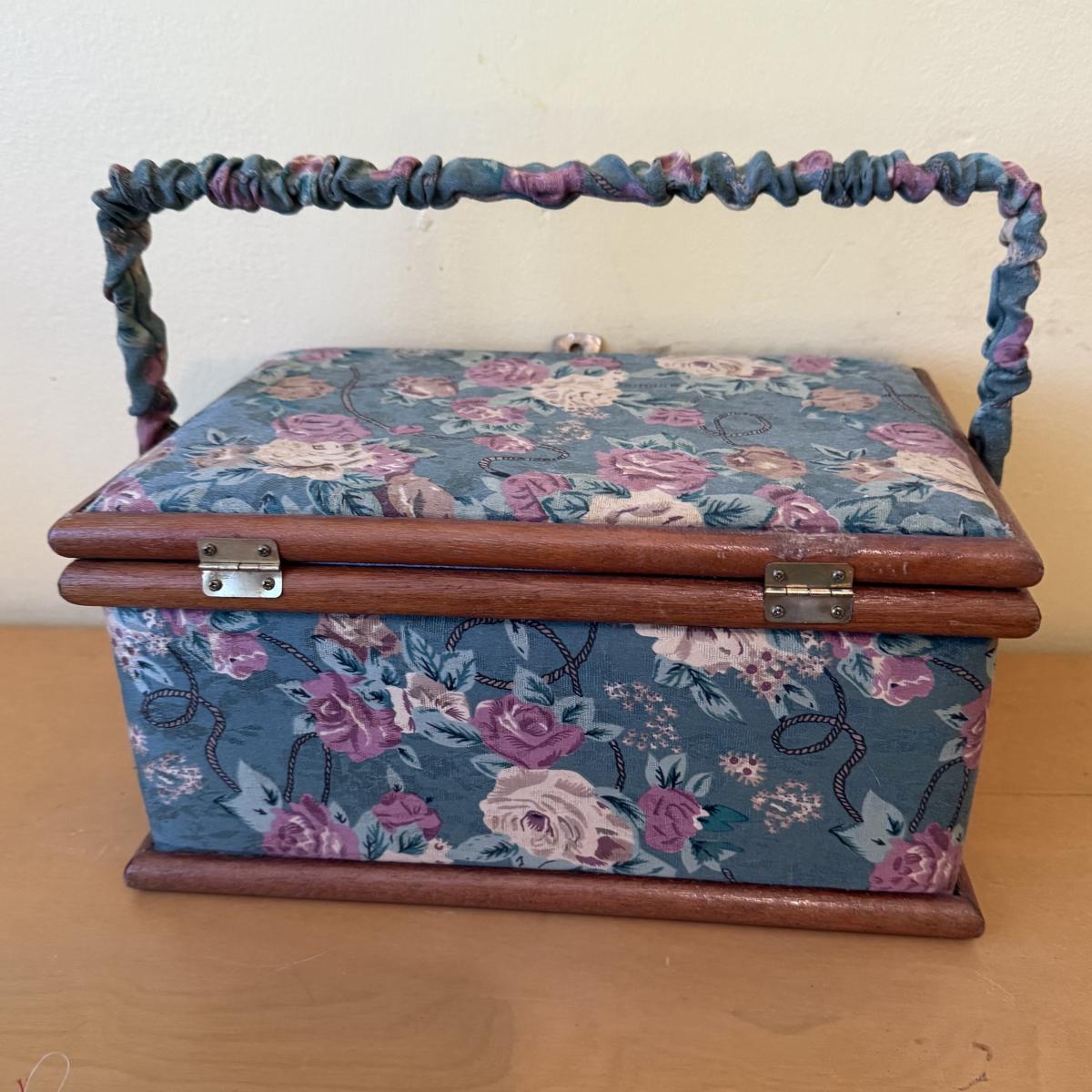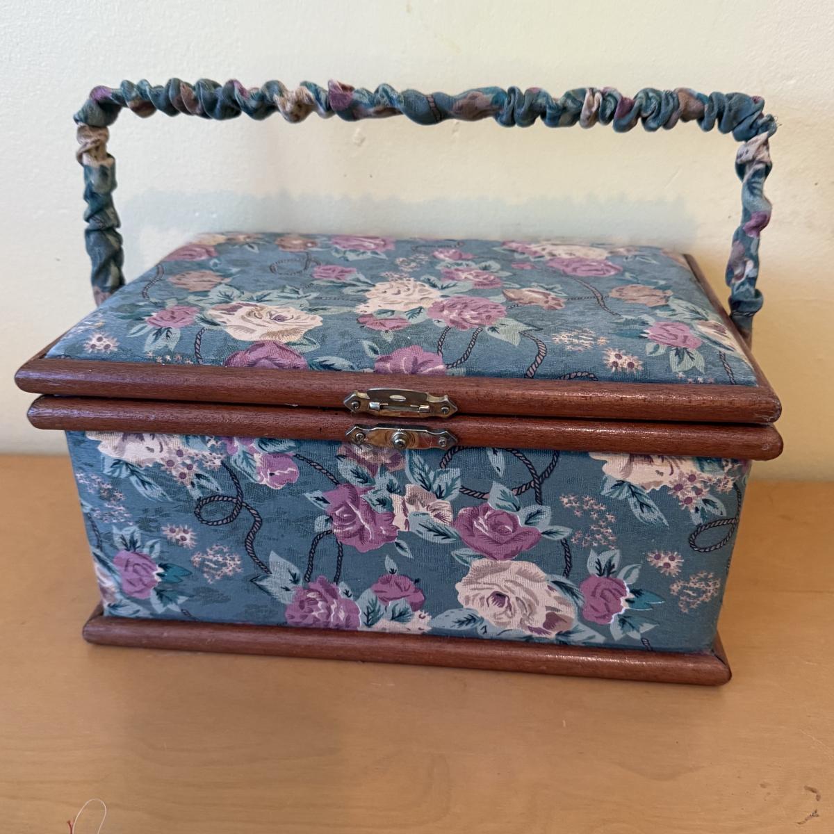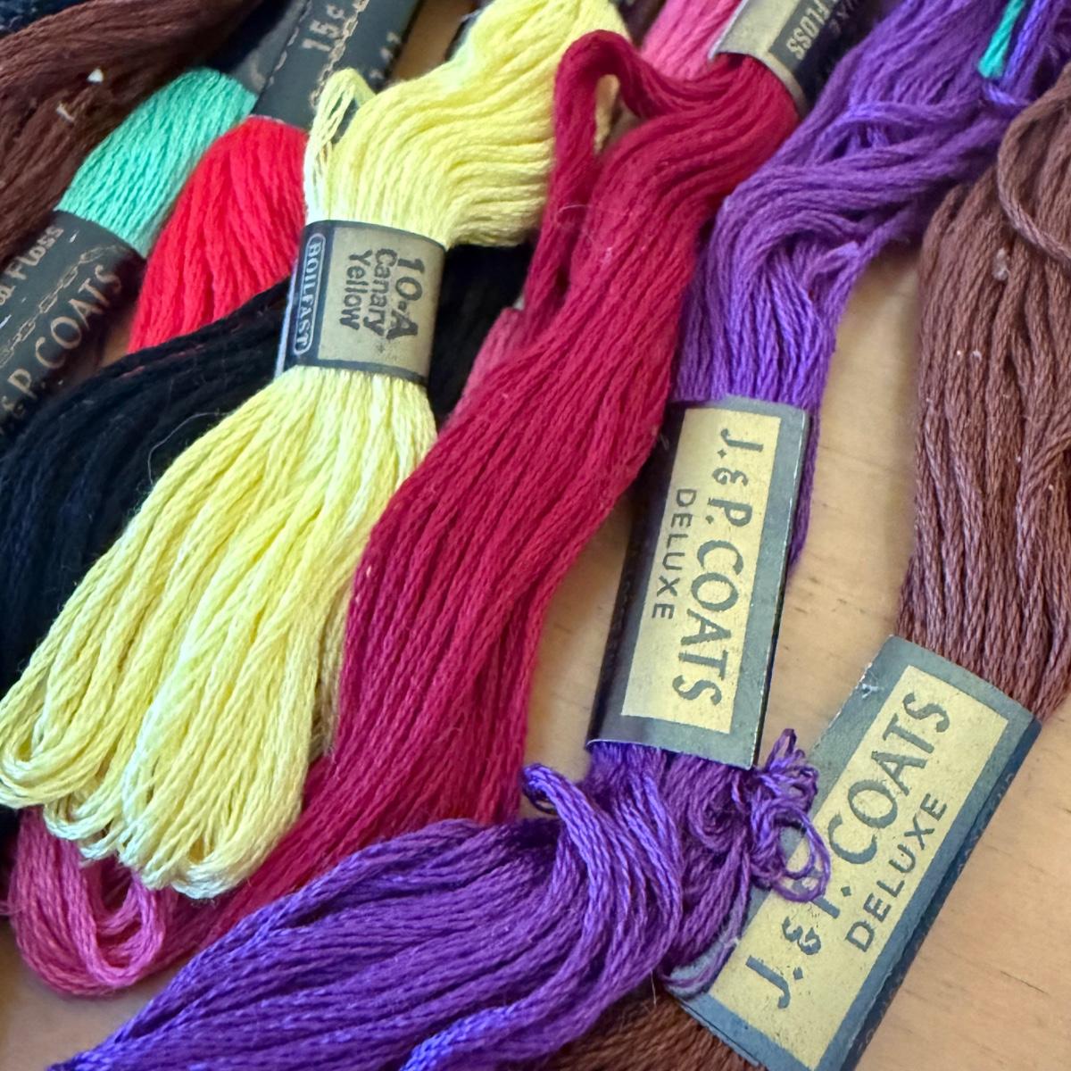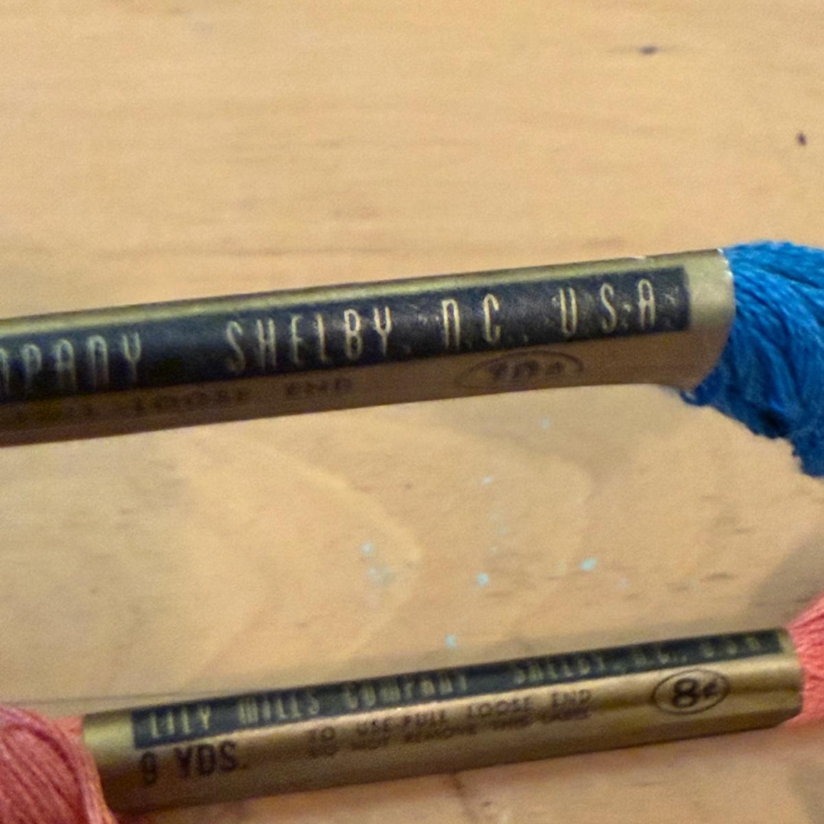 Over 45 unused or barely used skeins of embroidery floss from J & P Coates, DMC, and Lily Mills (Shelby, NC made). Also, a good handful of skeins are included that have some floss used from them. Two wooden embroidery hoops are 6”D and 7”D. A wood and cushioned fabric sewing basket is included as well; it is 11.5” x 7.5” x 6”H. A small blemish is seen in the wood on the back of the sewing basket.