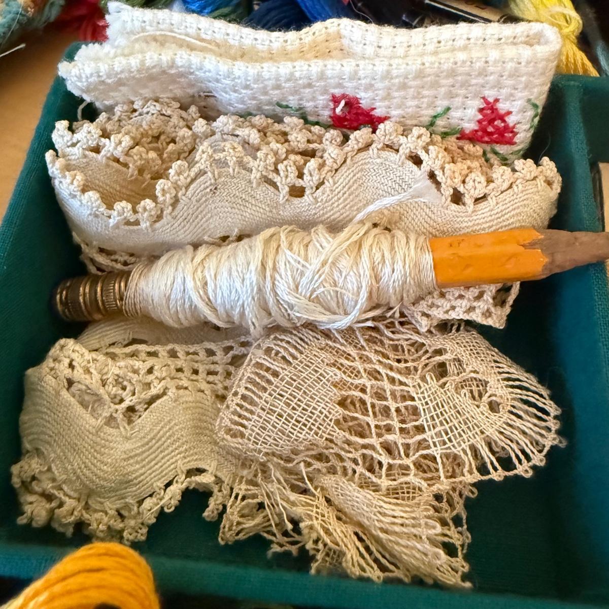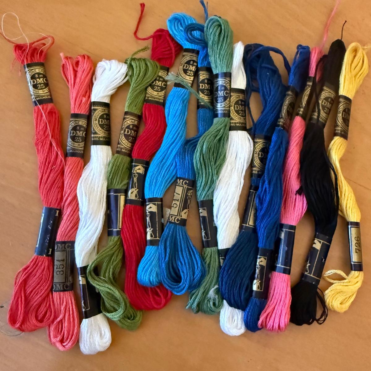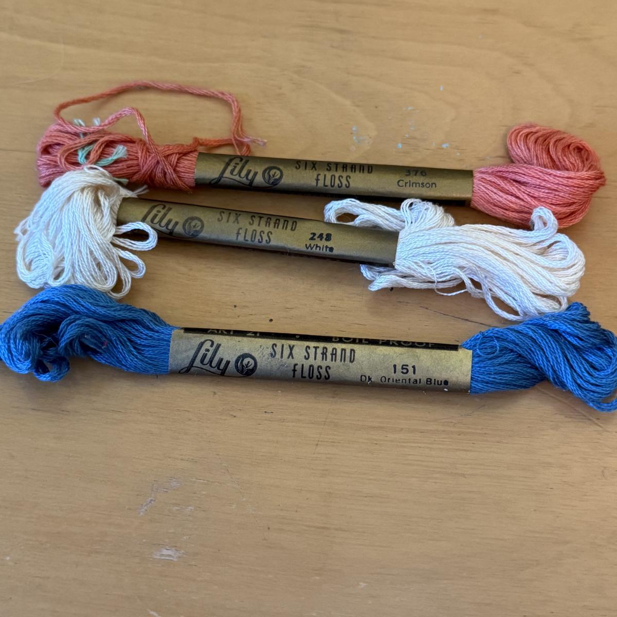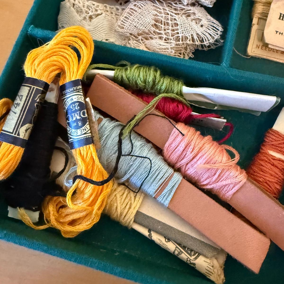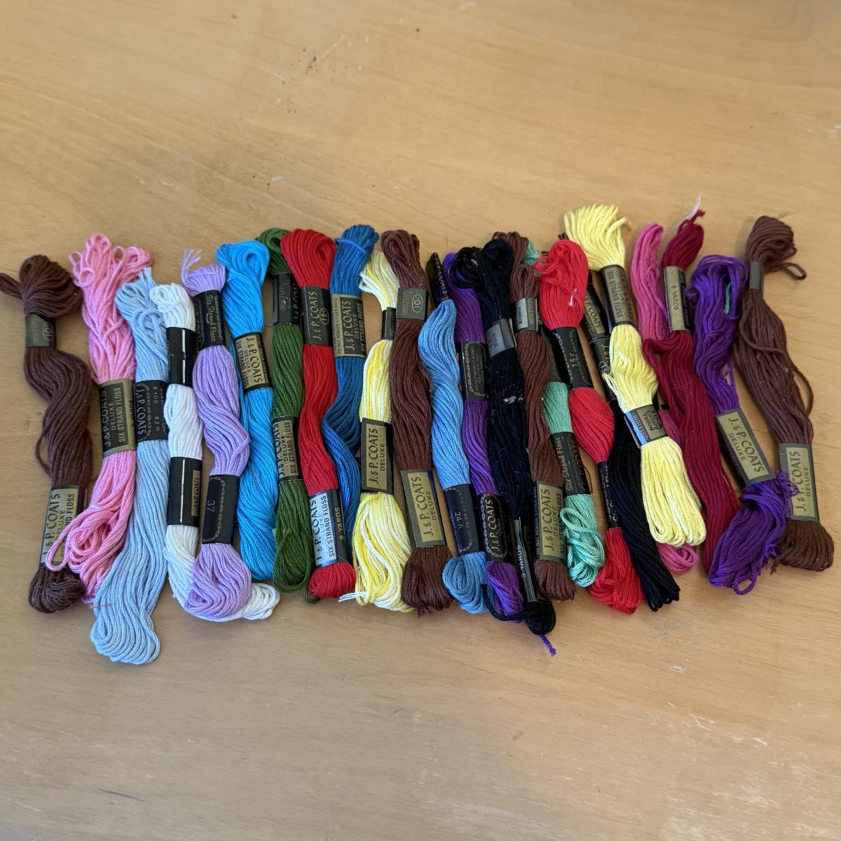 Over 45 unused or barely used skeins of embroidery floss from J & P Coates, DMC, and Lily Mills (Shelby, NC made). Also, a good handful of skeins are included that have some floss used from them. Two wooden embroidery hoops are 6”D and 7”D. A wood and cushioned fabric sewing basket is included as well; it is 11.5” x 7.5” x 6”H. A small blemish is seen in the wood on the back of the sewing basket.