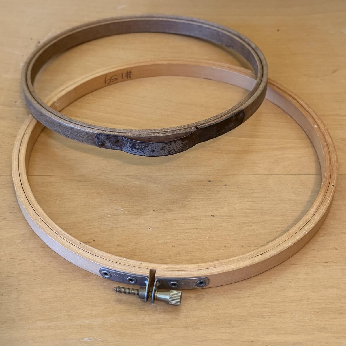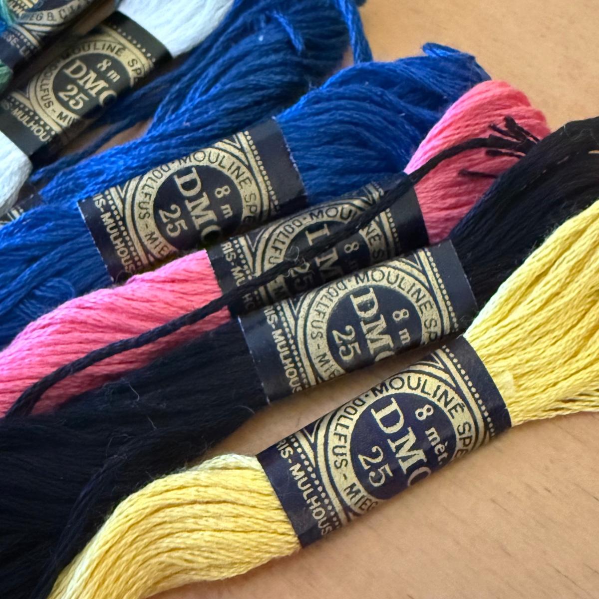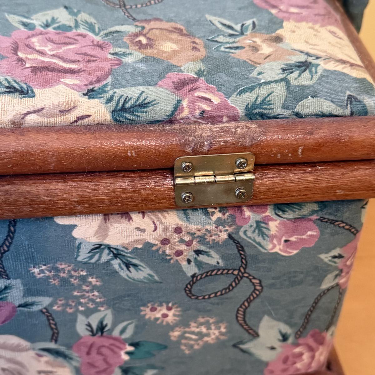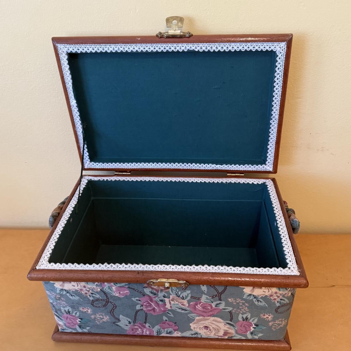 Over 45 unused or barely used skeins of embroidery floss from J & P Coates, DMC, and Lily Mills (Shelby, NC made). Also, a good handful of skeins are included that have some floss used from them. Two wooden embroidery hoops are 6”D and 7”D. A wood and cushioned fabric sewing basket is included as well; it is 11.5” x 7.5” x 6”H. A small blemish is seen in the wood on the back of the sewing basket.