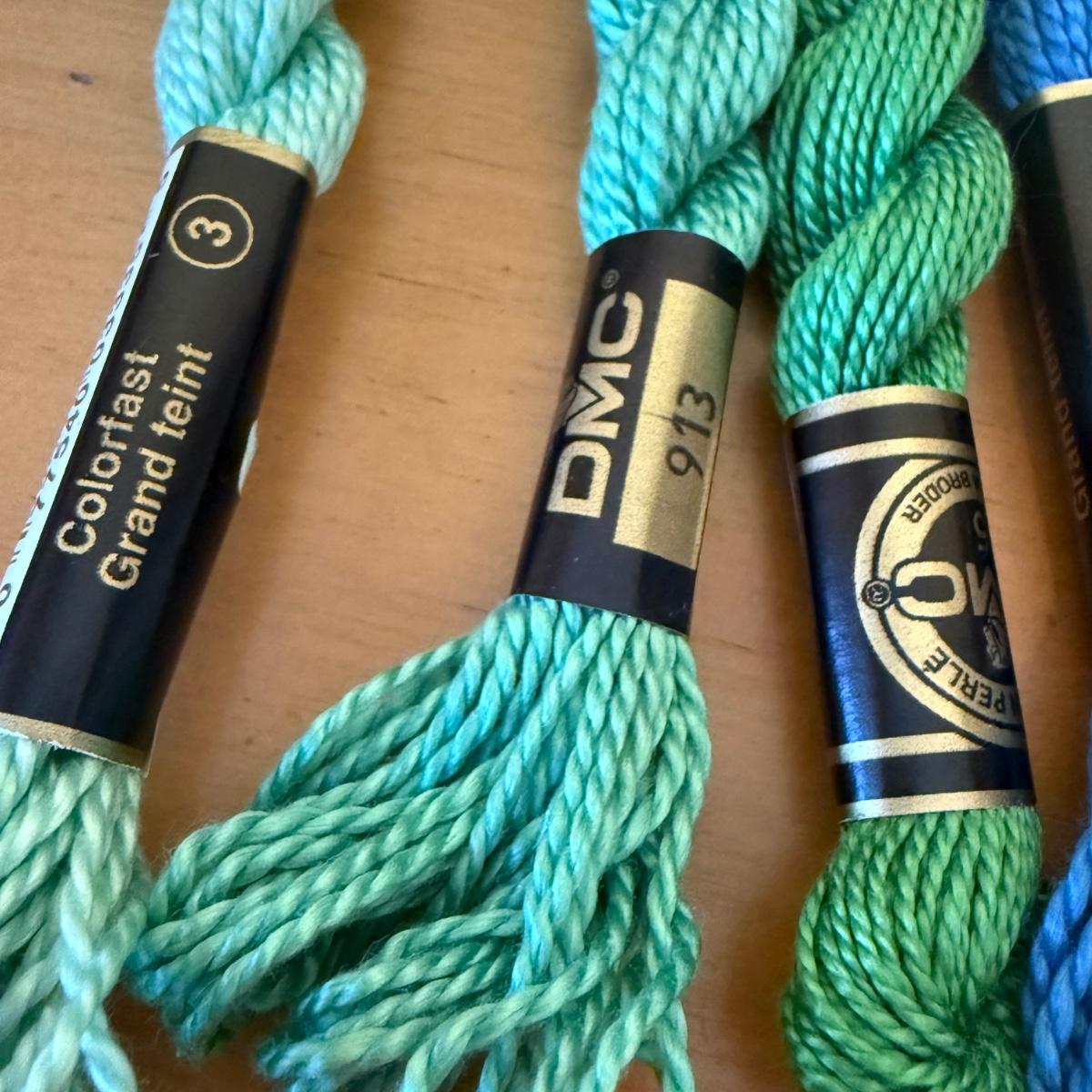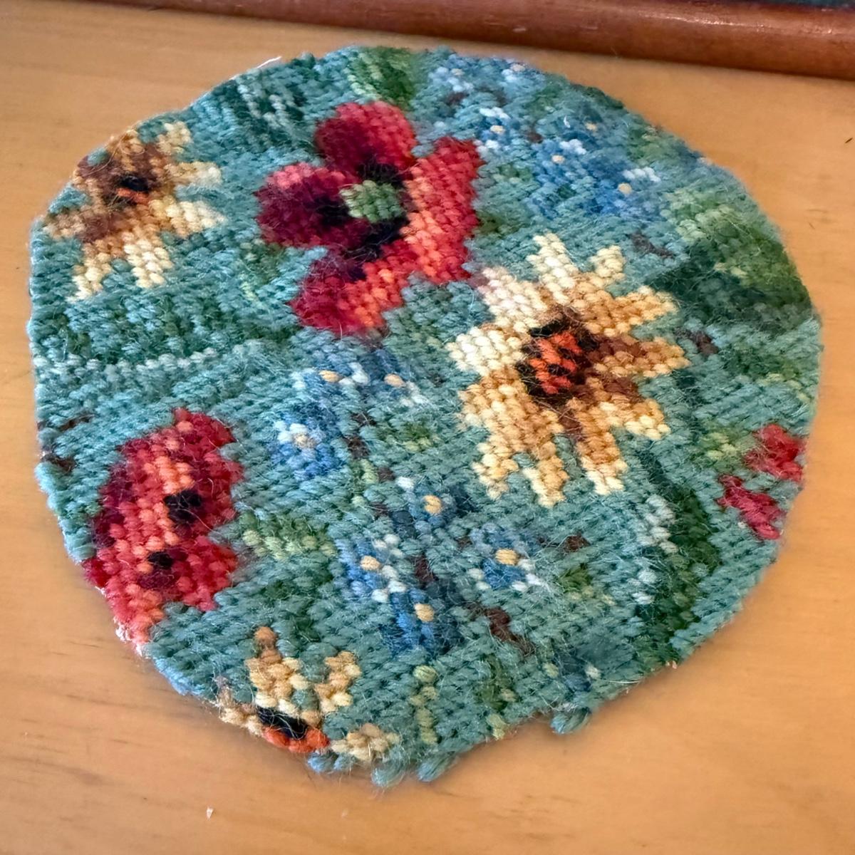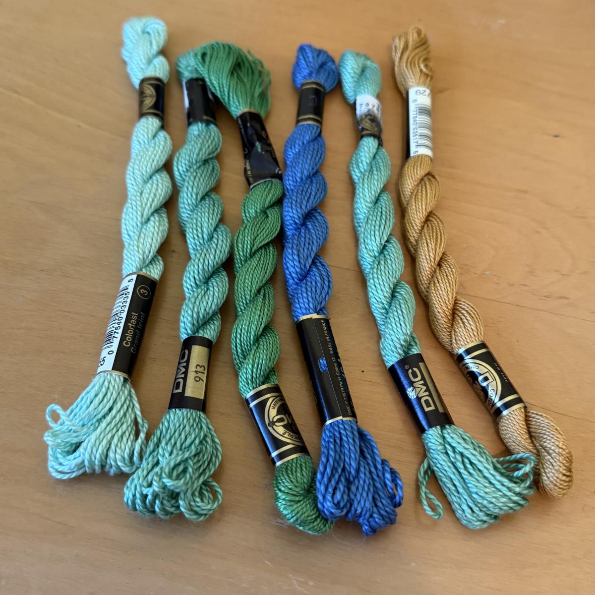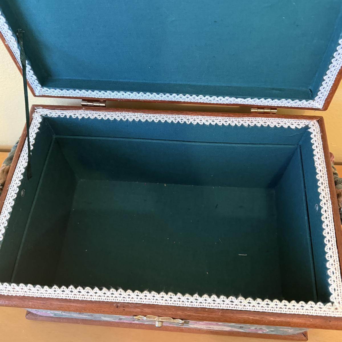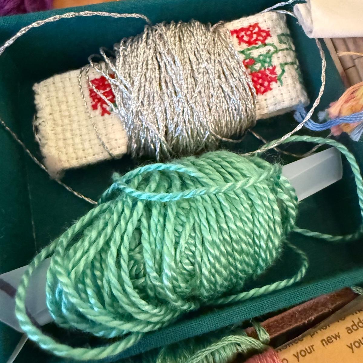 Over 45 unused or barely used skeins of embroidery floss from J & P Coates, DMC, and Lily Mills (Shelby, NC made). Also, a good handful of skeins are included that have some floss used from them. Two wooden embroidery hoops are 6”D and 7”D. A wood and cushioned fabric sewing basket is included as well; it is 11.5” x 7.5” x 6”H. A small blemish is seen in the wood on the back of the sewing basket.
