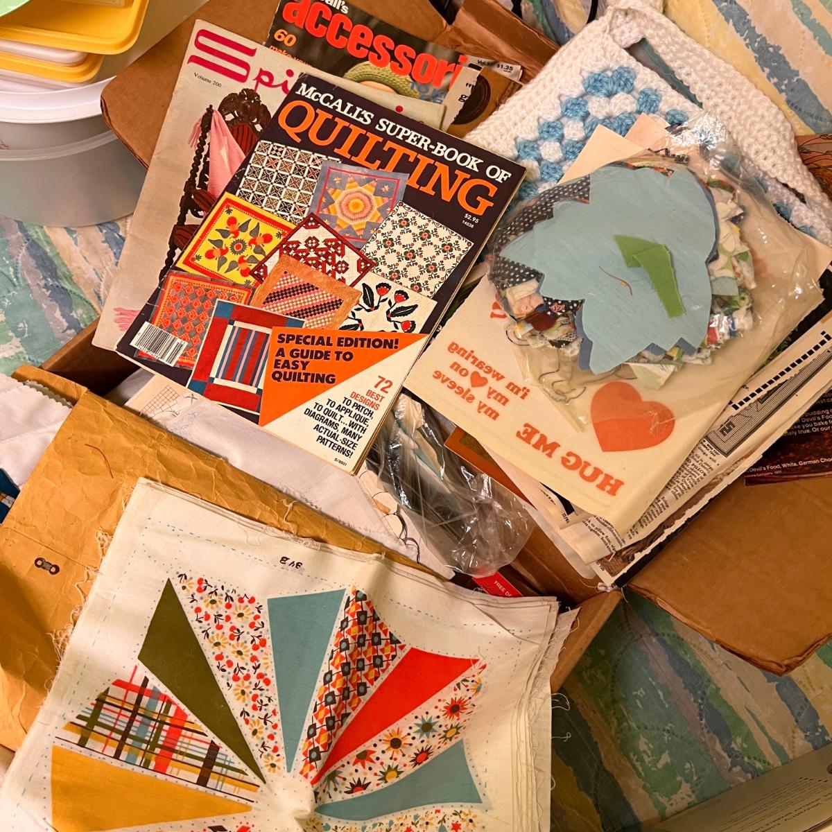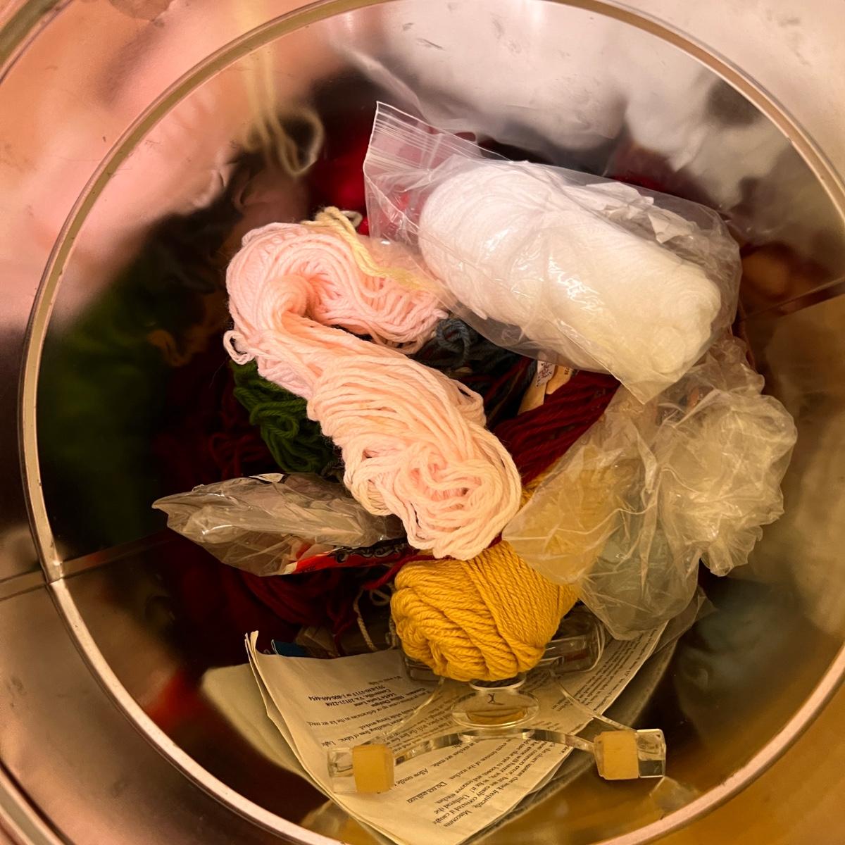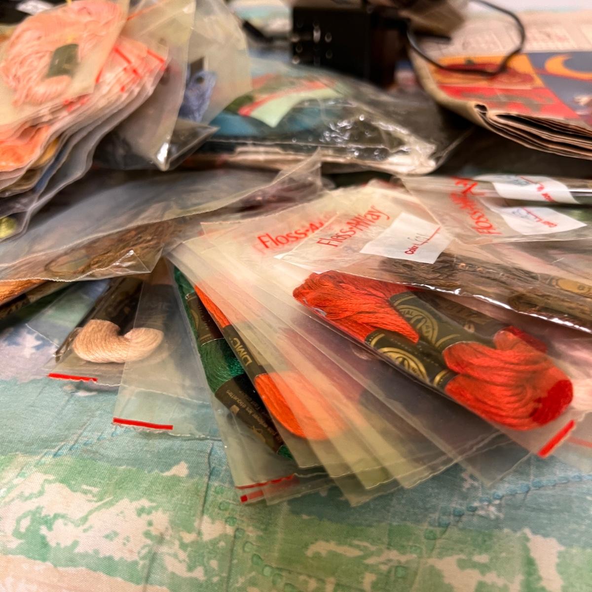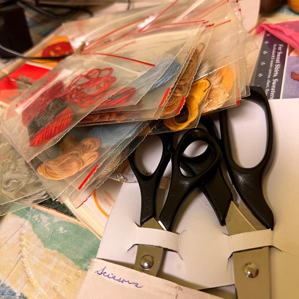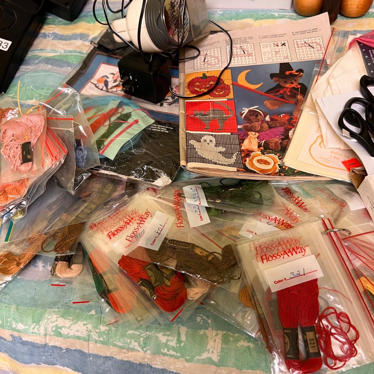Embroidery thread, books, yarn, scissors, material. One large canister and one box full.