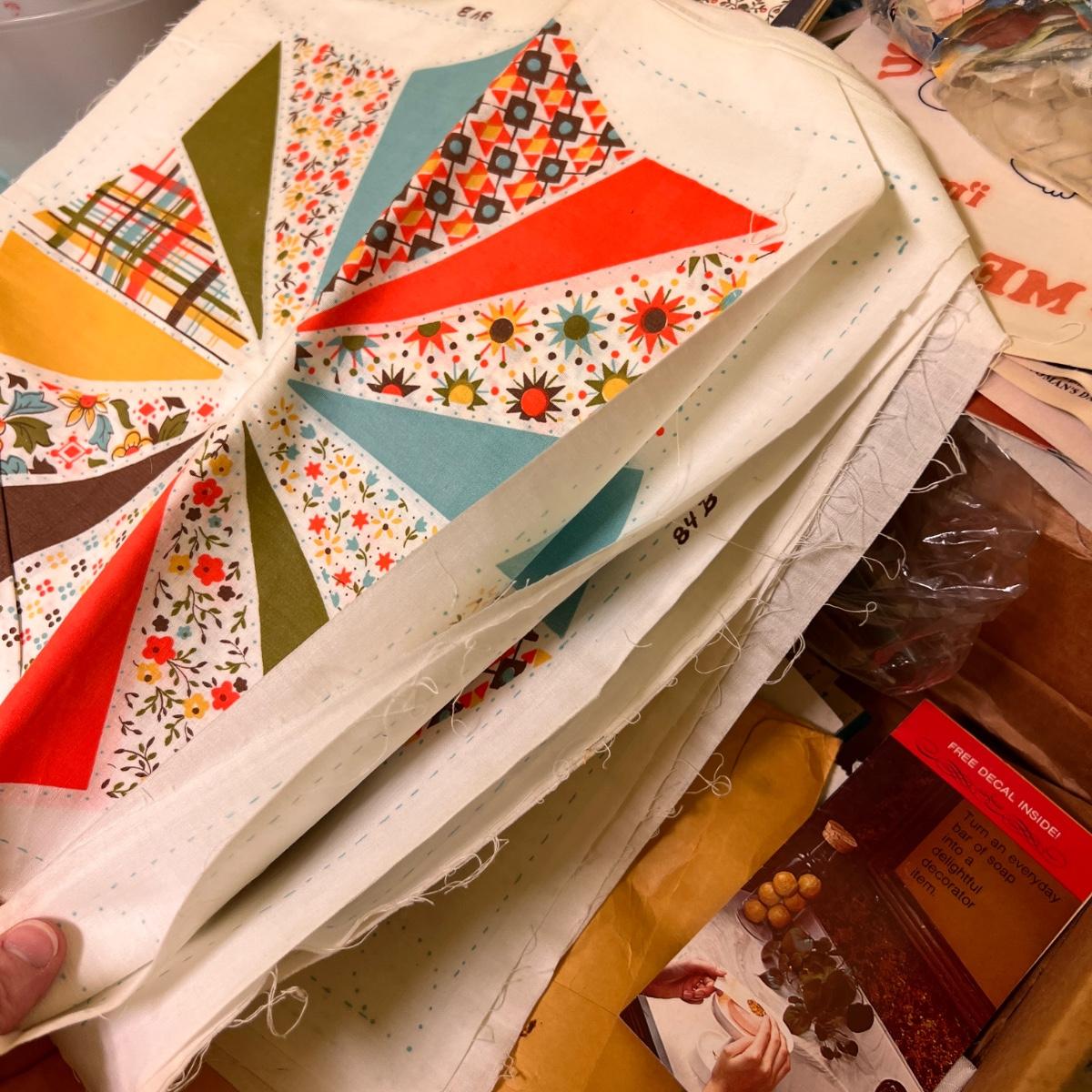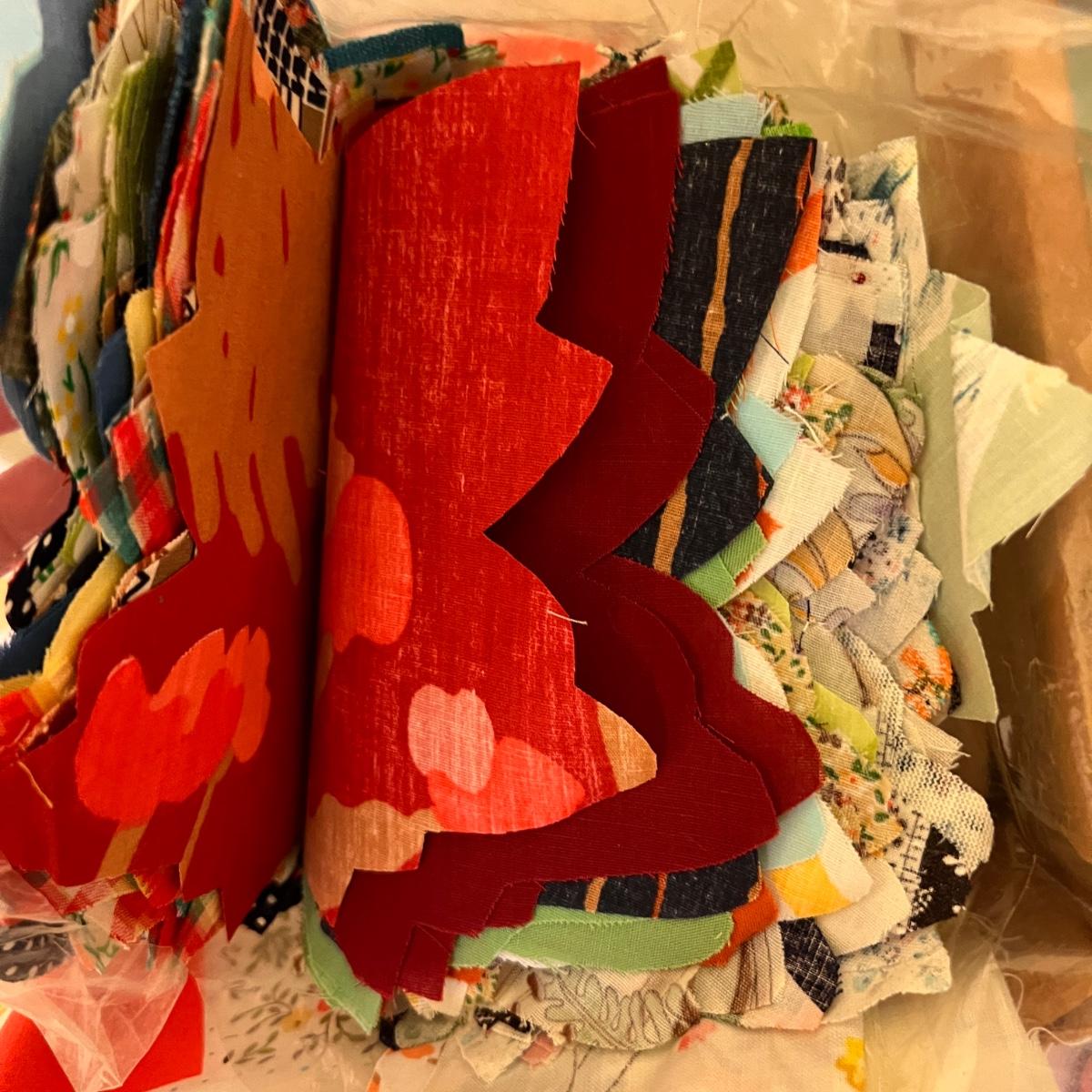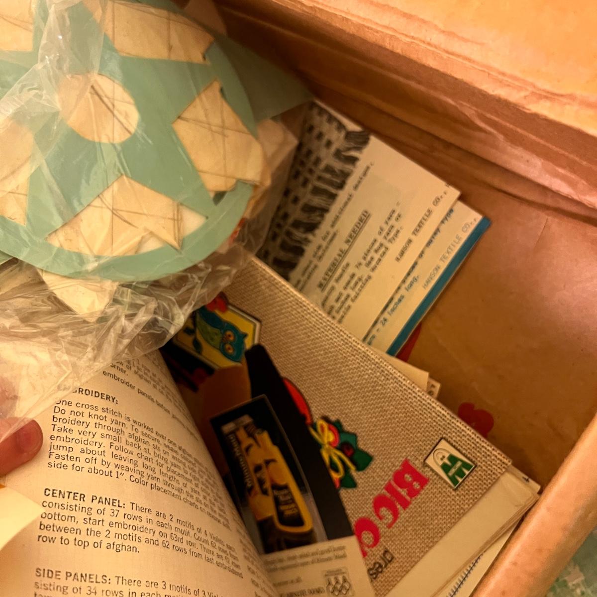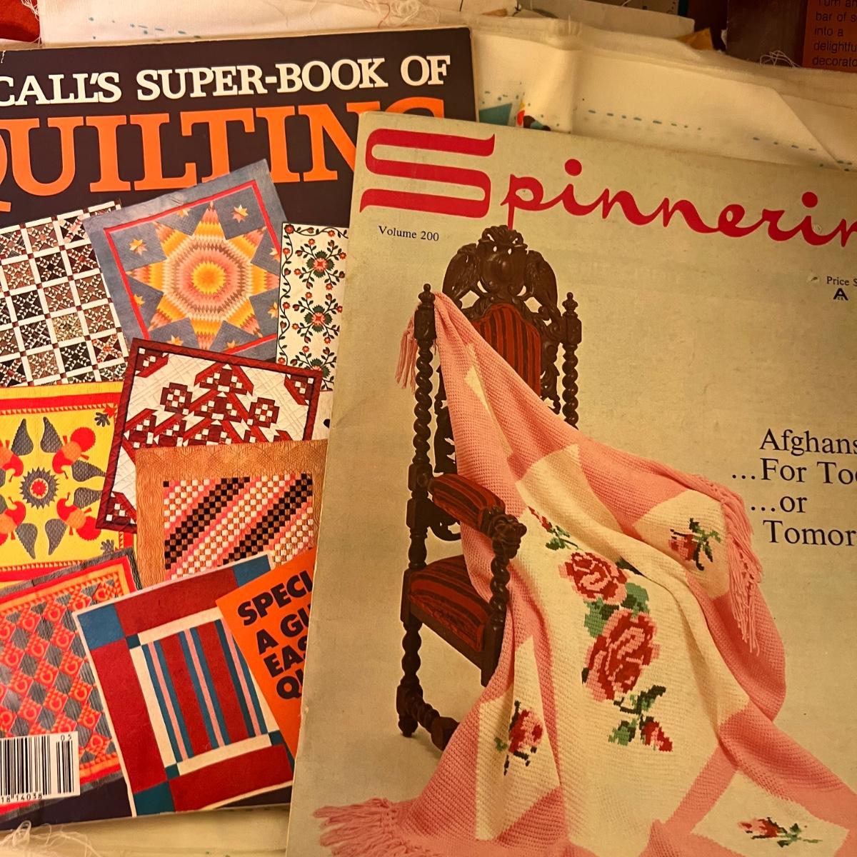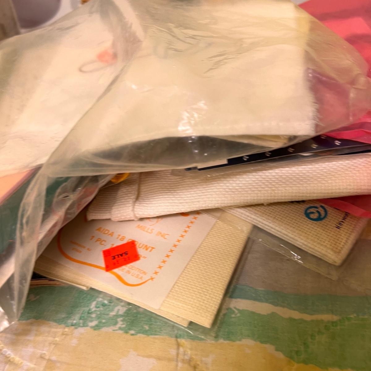 Embroidery thread, books, yarn, scissors, material. One large canister and one box full.
