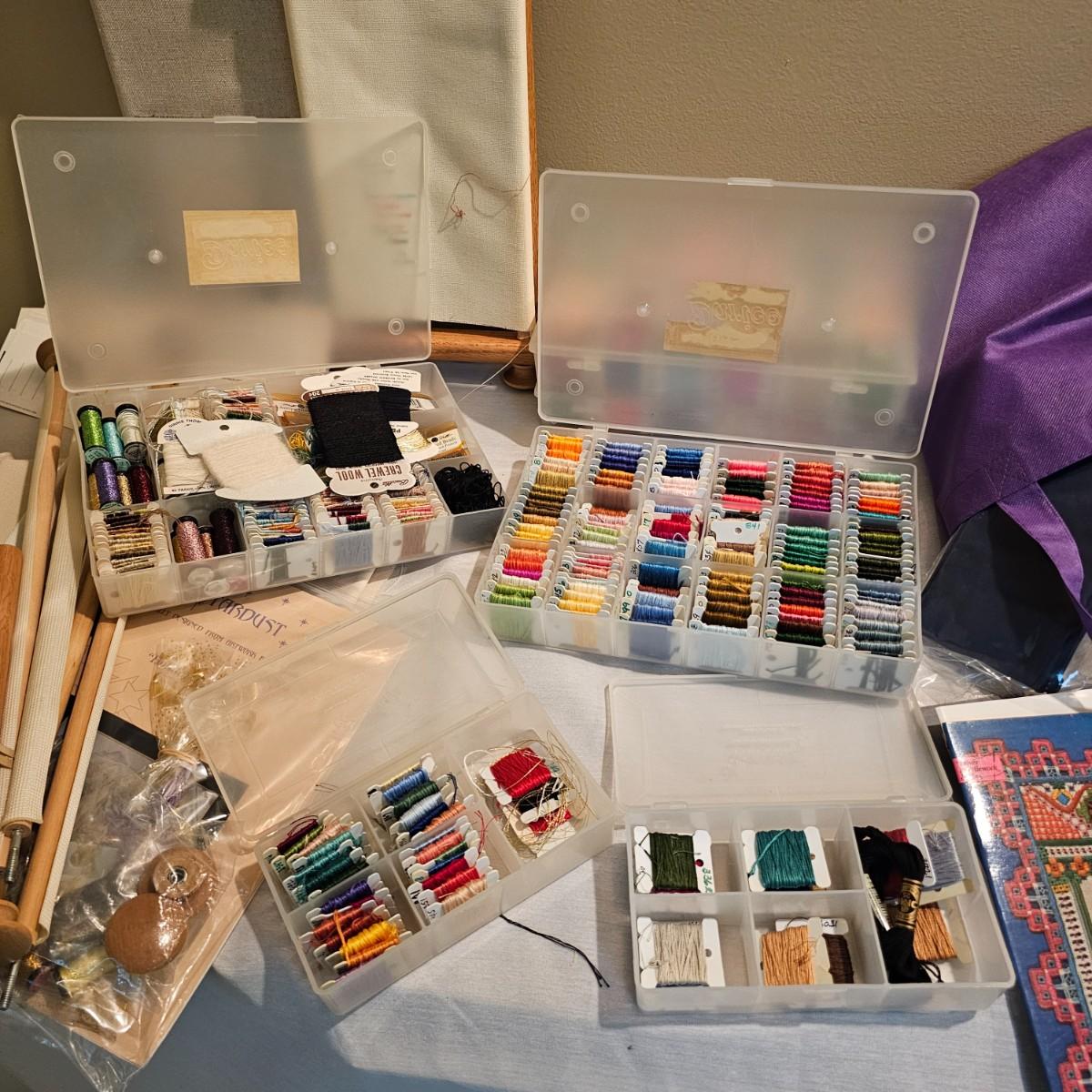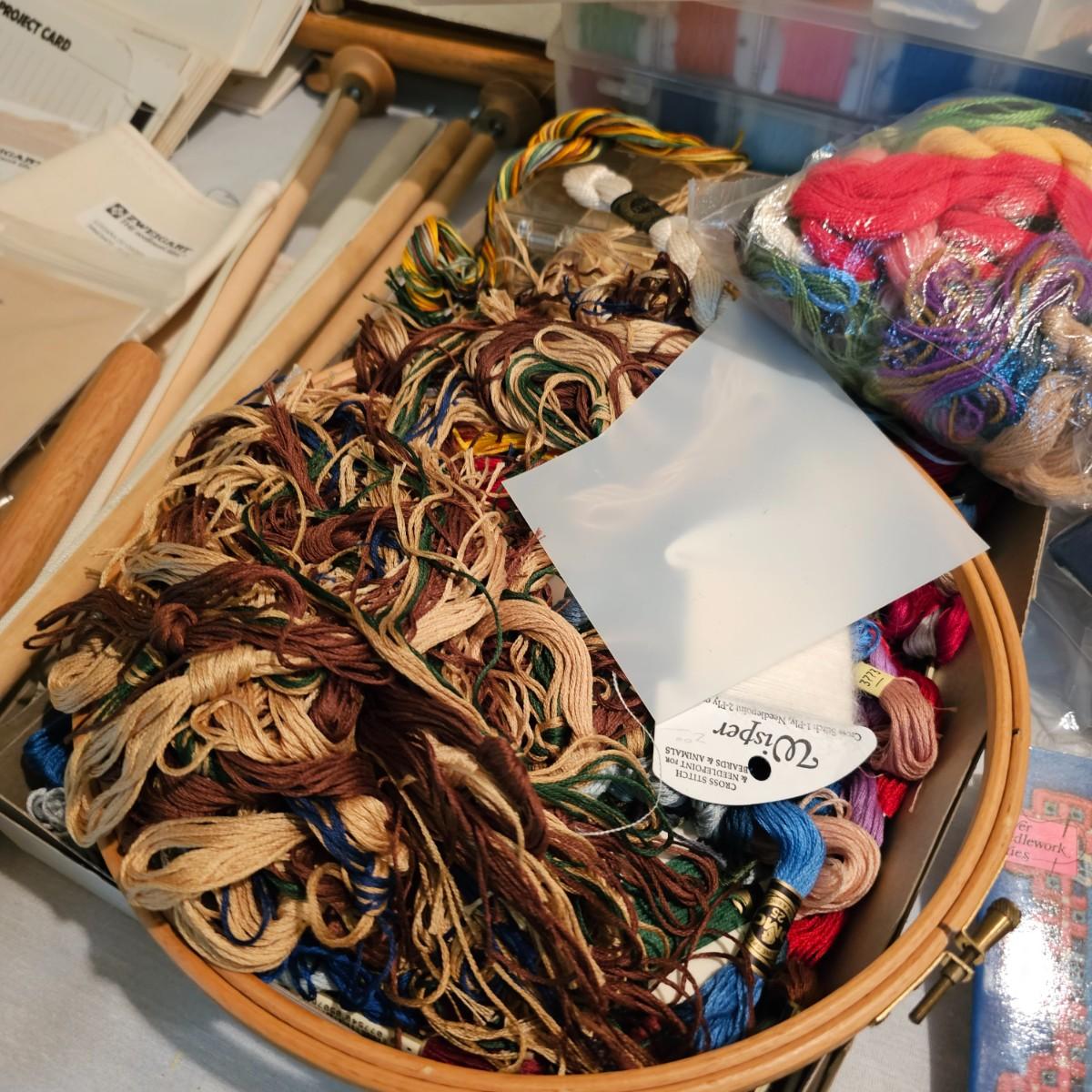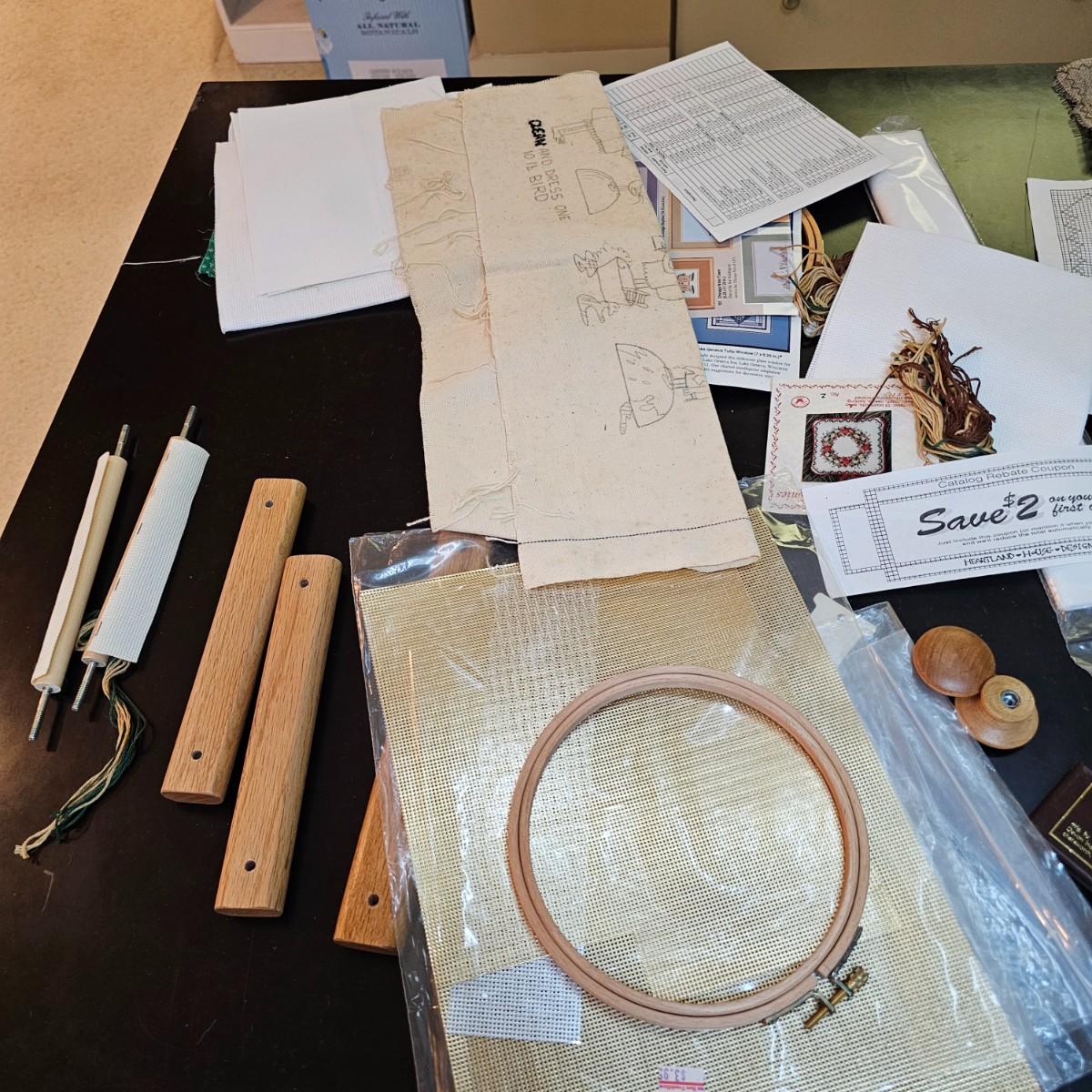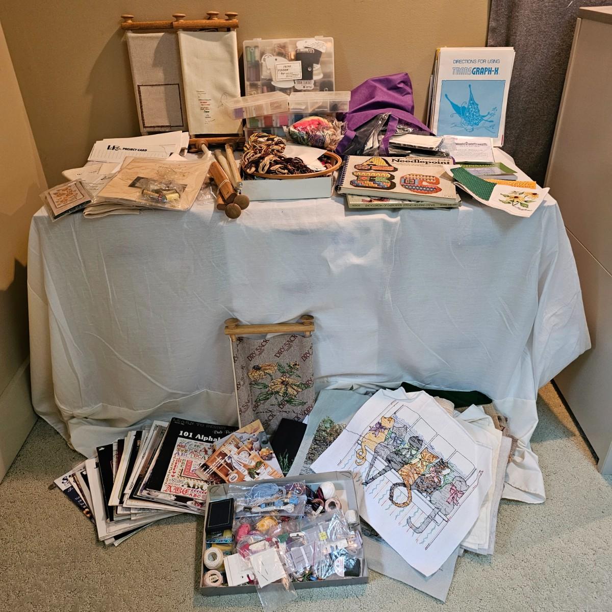 Supplies, fabric, floss, needles, patterns. Everything you need to work on embroidery and needlepoint crafts. Stretchers, yarn, transfer paper, etc. Many gorgeous started or completed projects are included. See photos for details. Local pickup only.