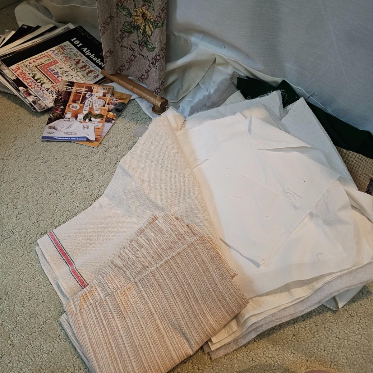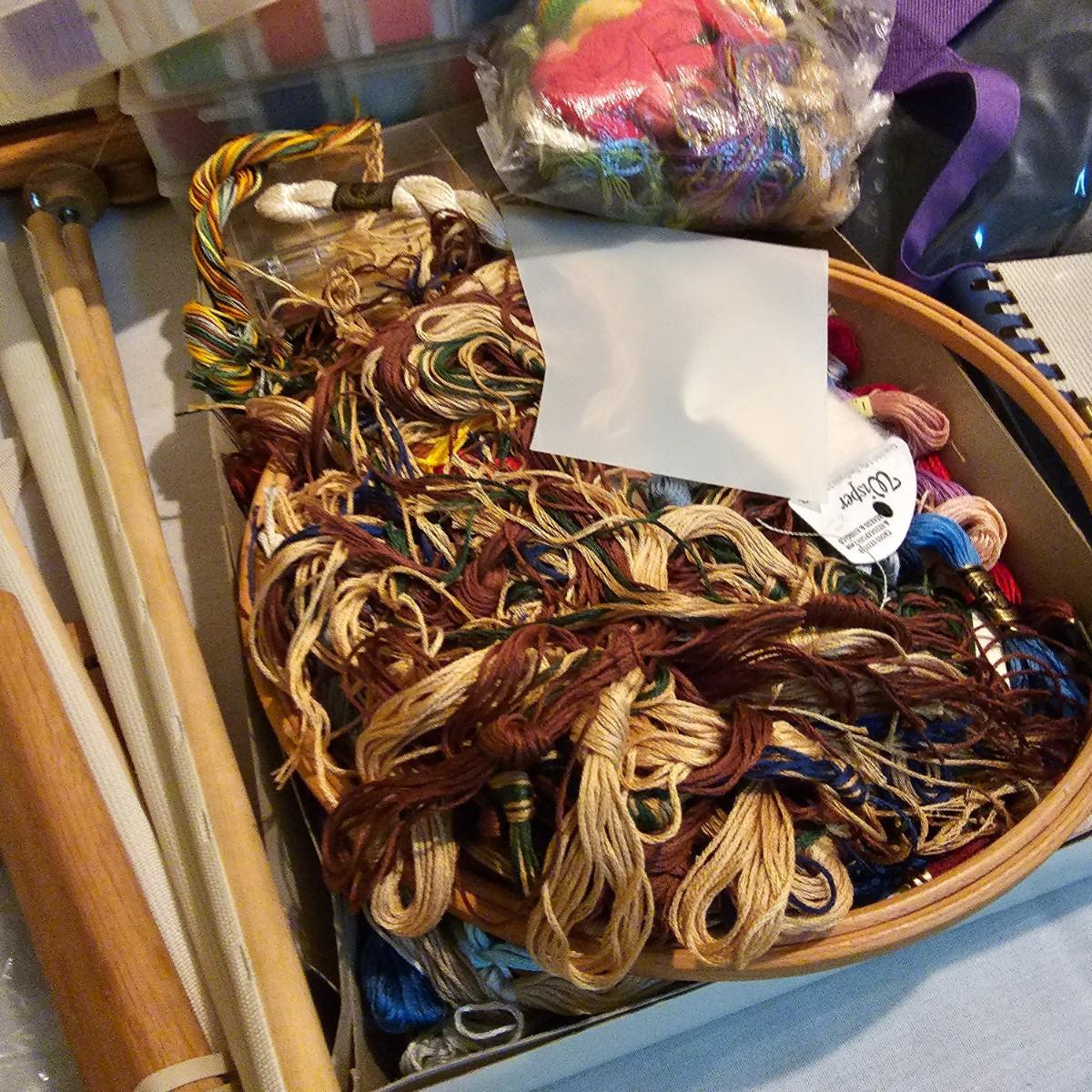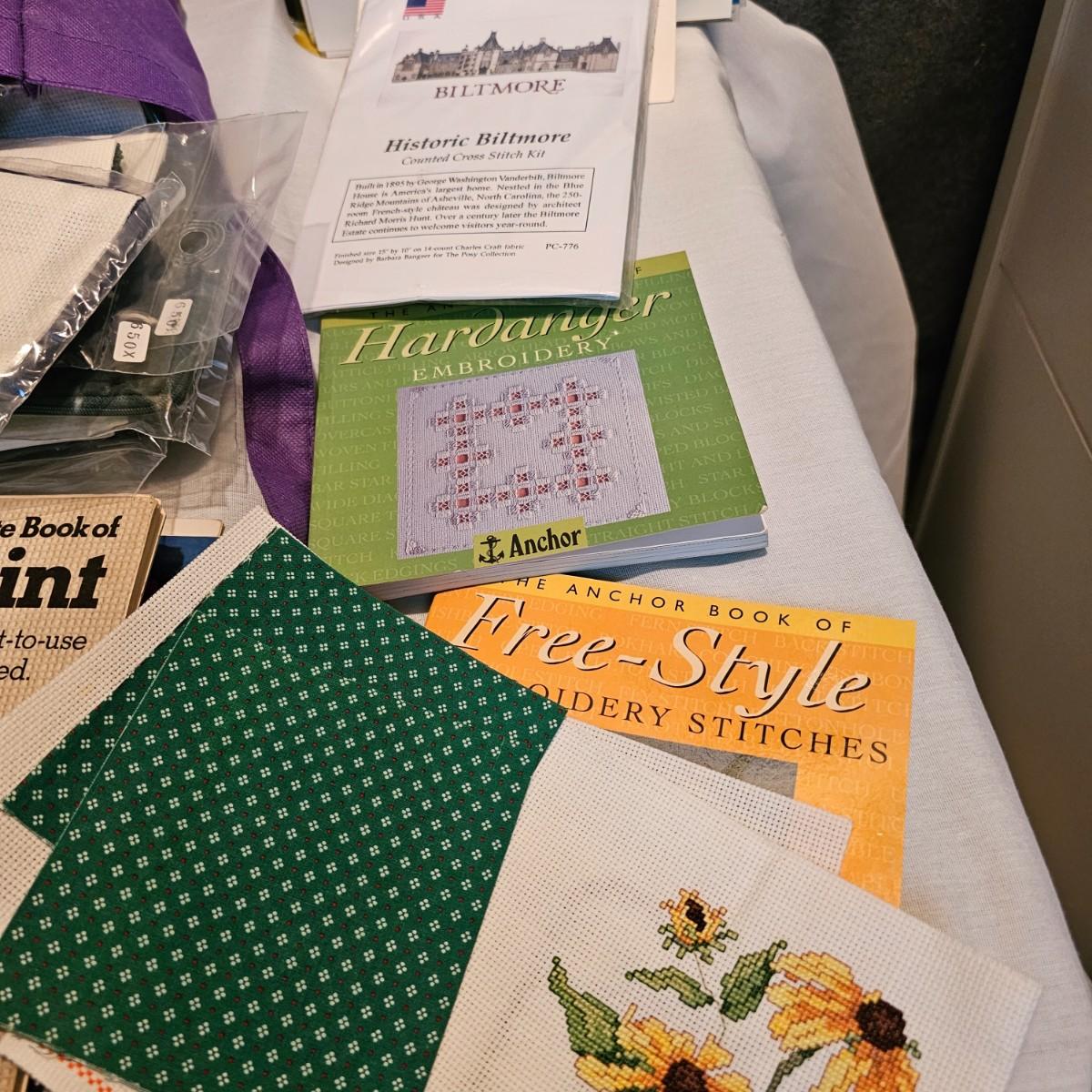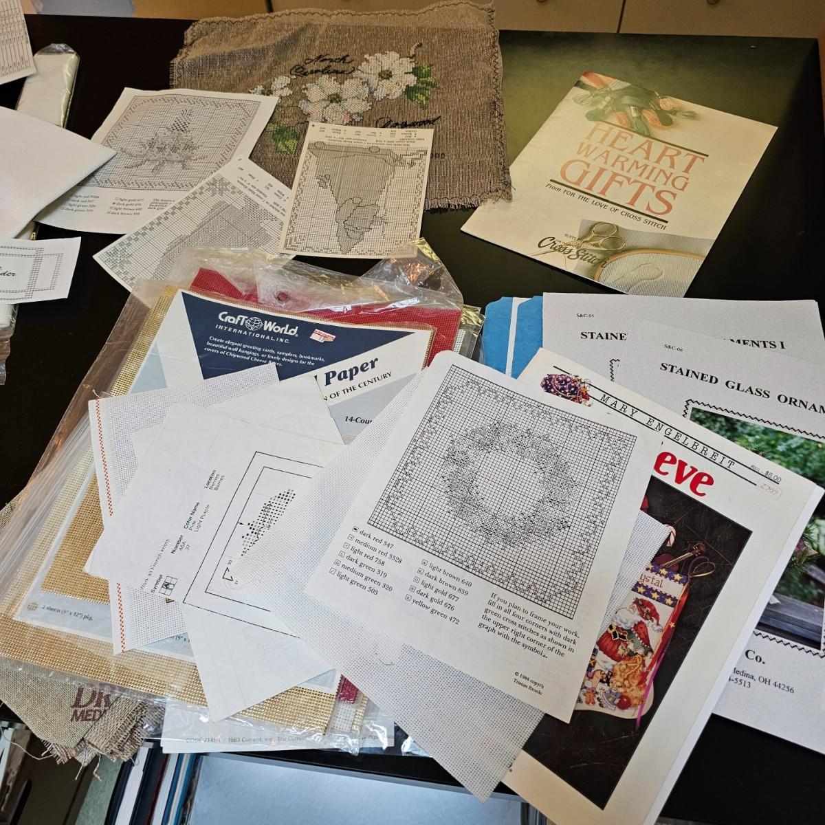Supplies, fabric, floss, needles, patterns. Everything you need to work on embroidery and needlepoint crafts. Stretchers, yarn, transfer paper, etc. Many gorgeous started or completed projects are included. See photos for details. Local pickup only.