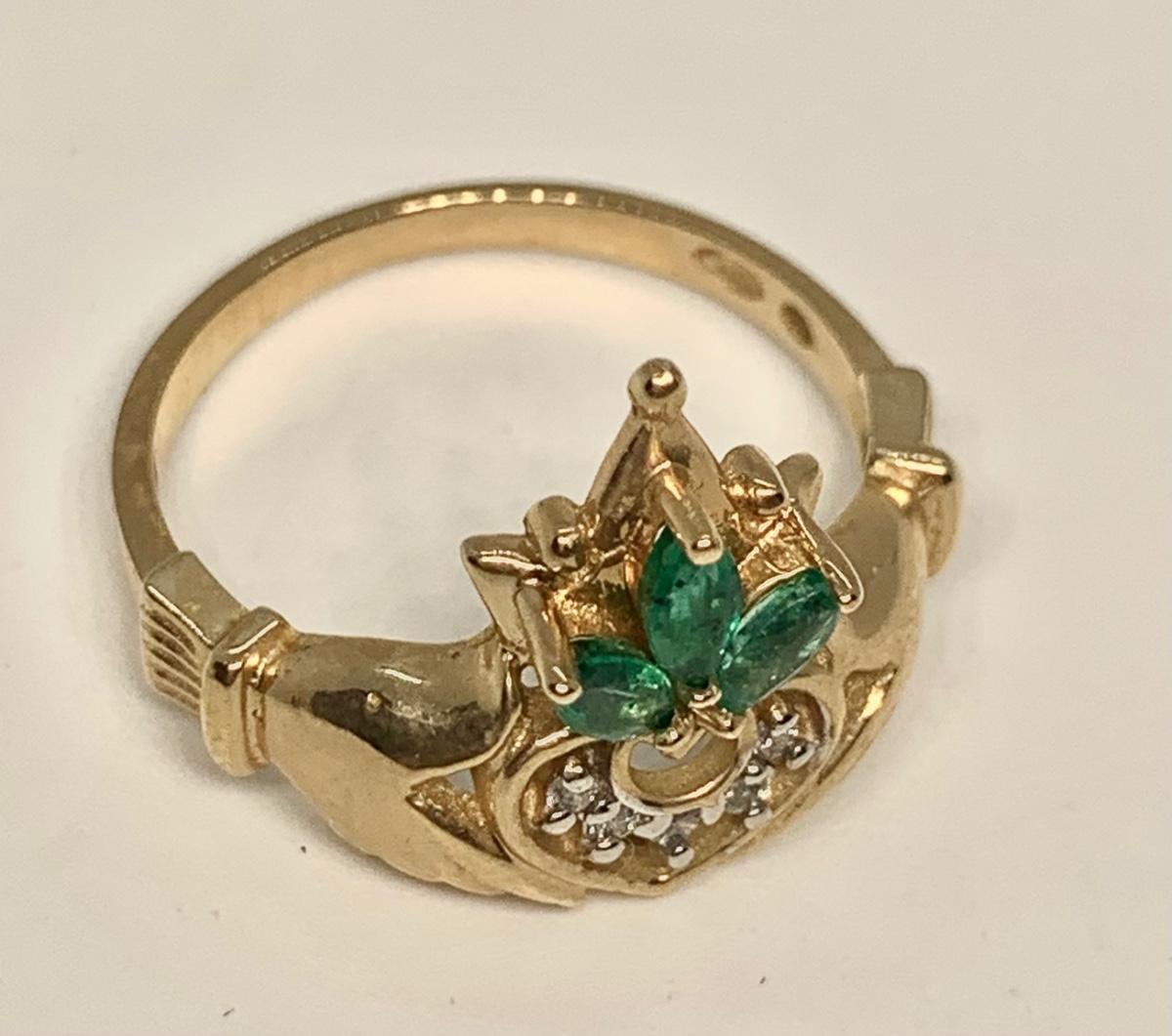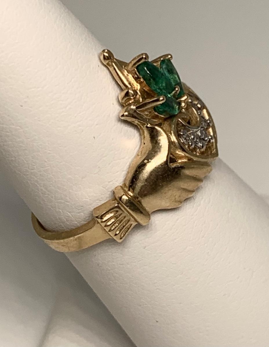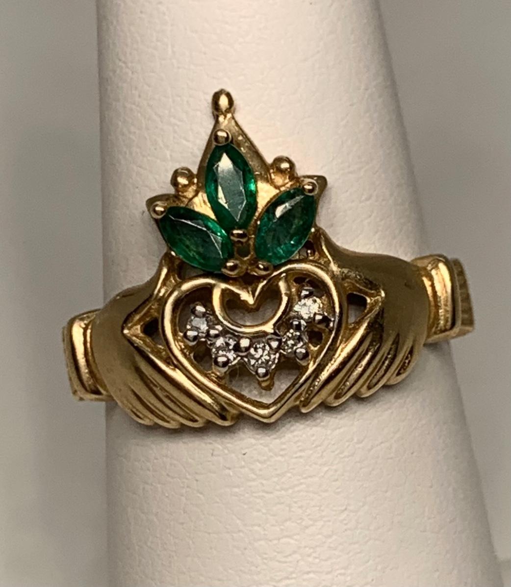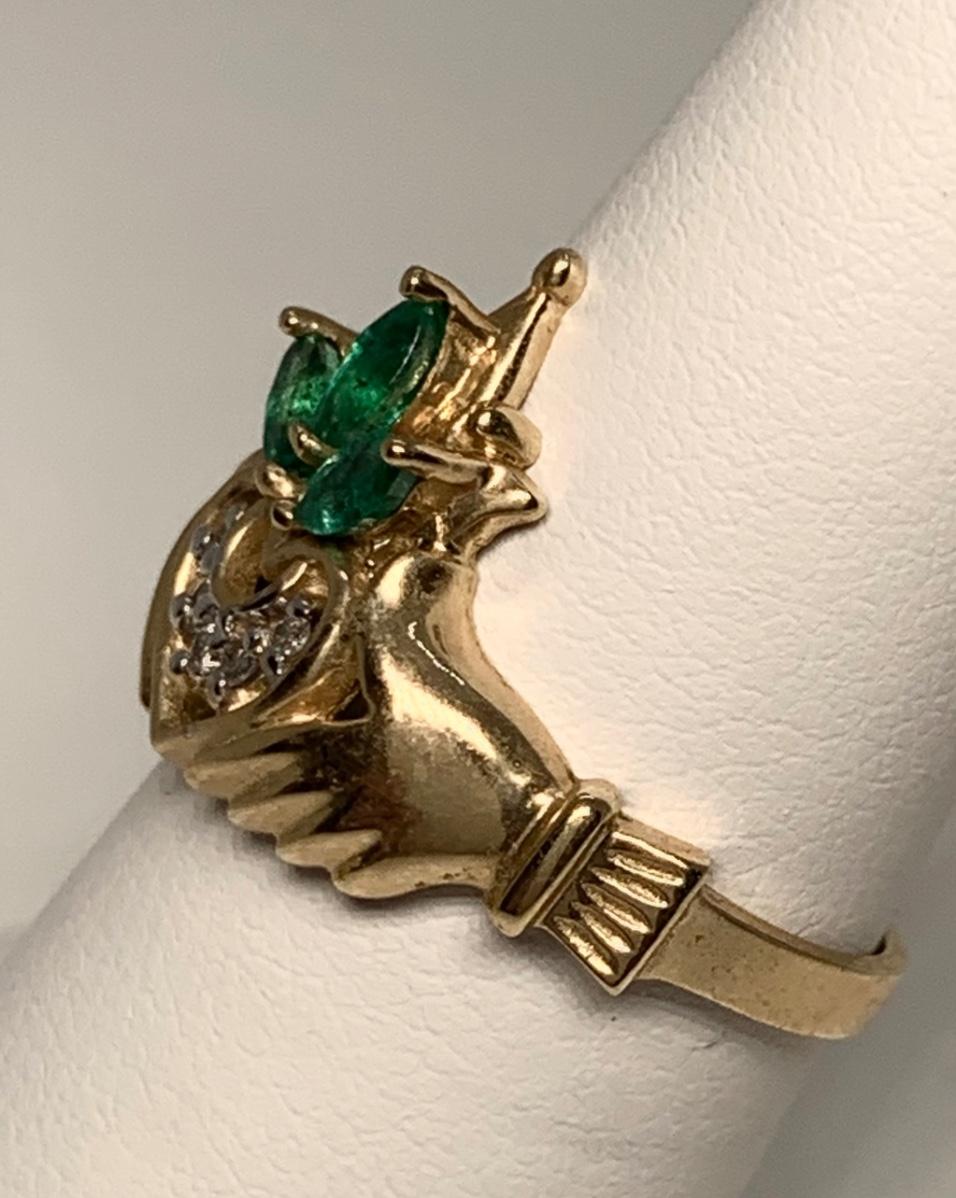Tw 3.3g 14k Yellow Gold Emerald & Diamond Irish Claddagh Ring sz6.5
