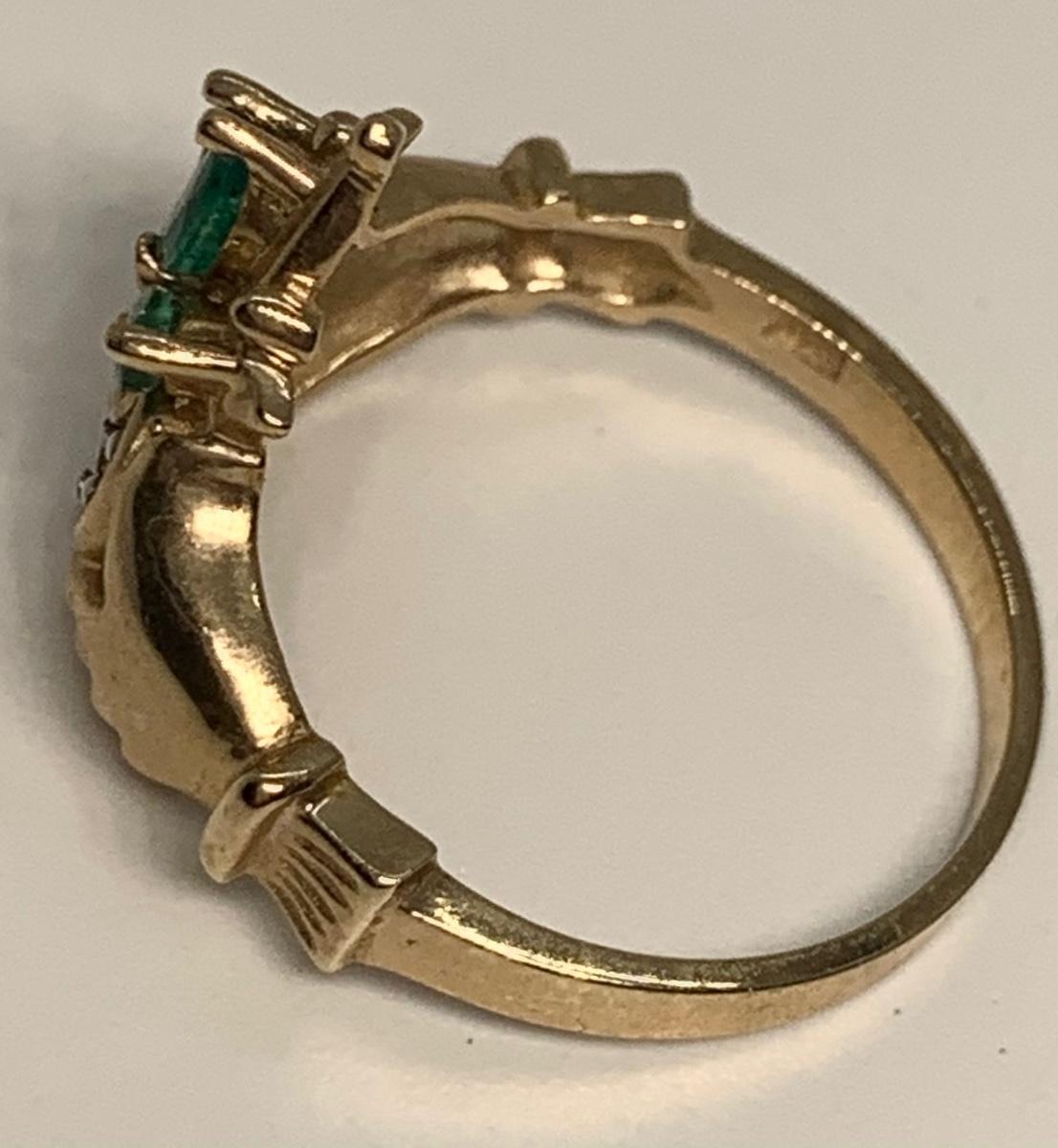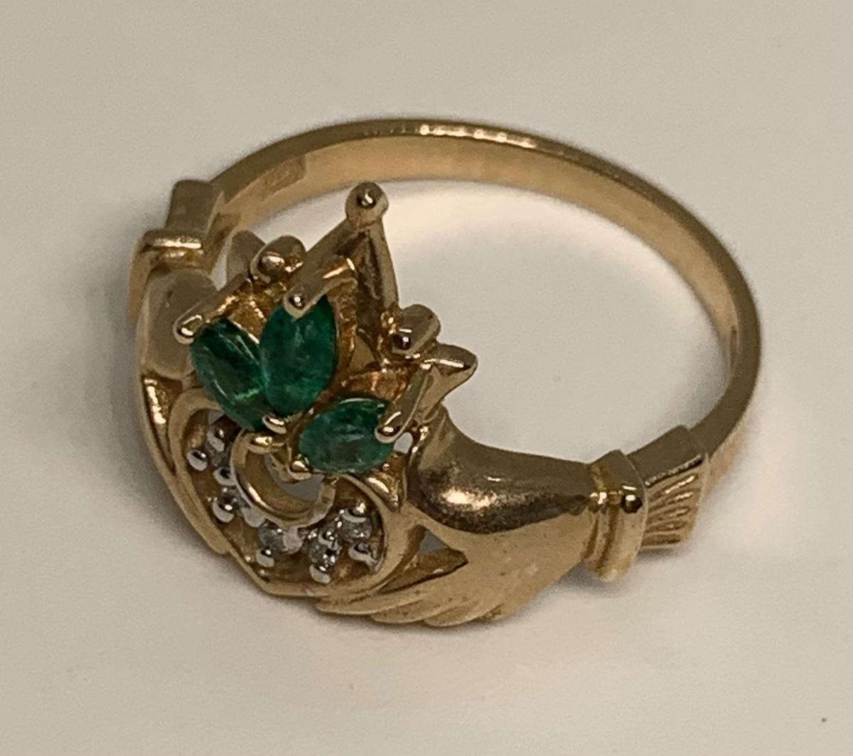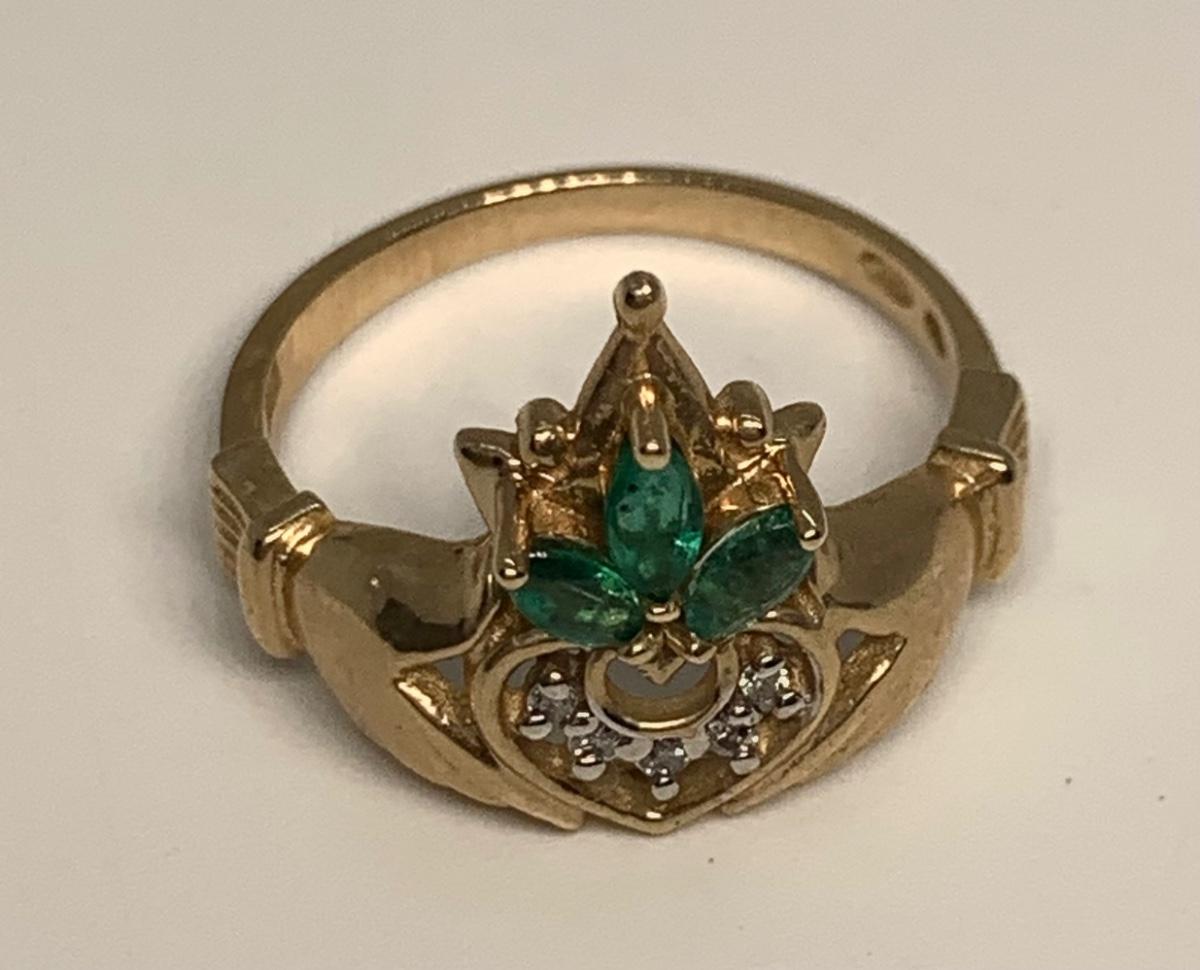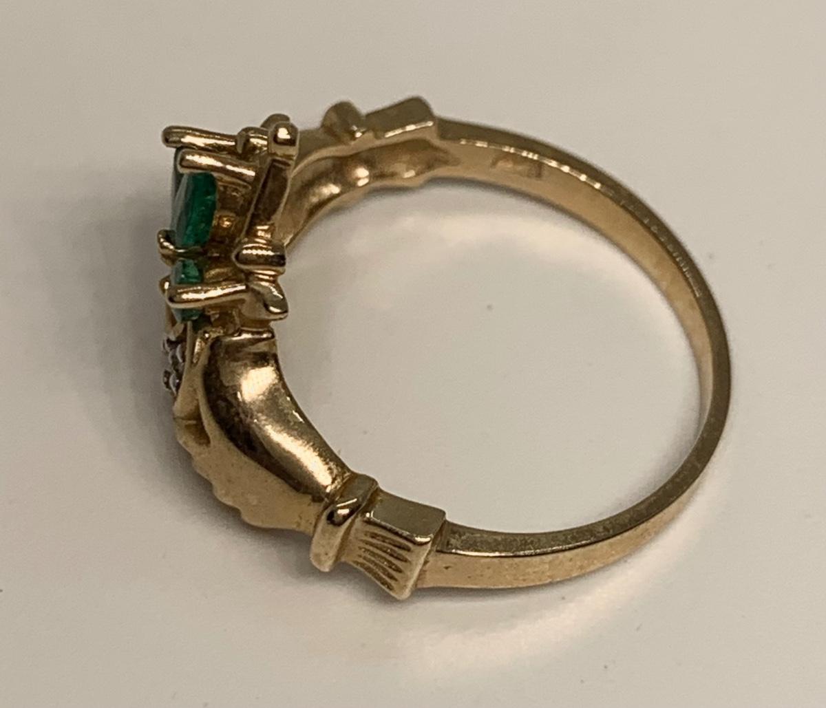 Tw 3.3g 14k Yellow Gold Emerald & Diamond Irish Claddagh Ring sz6.5
