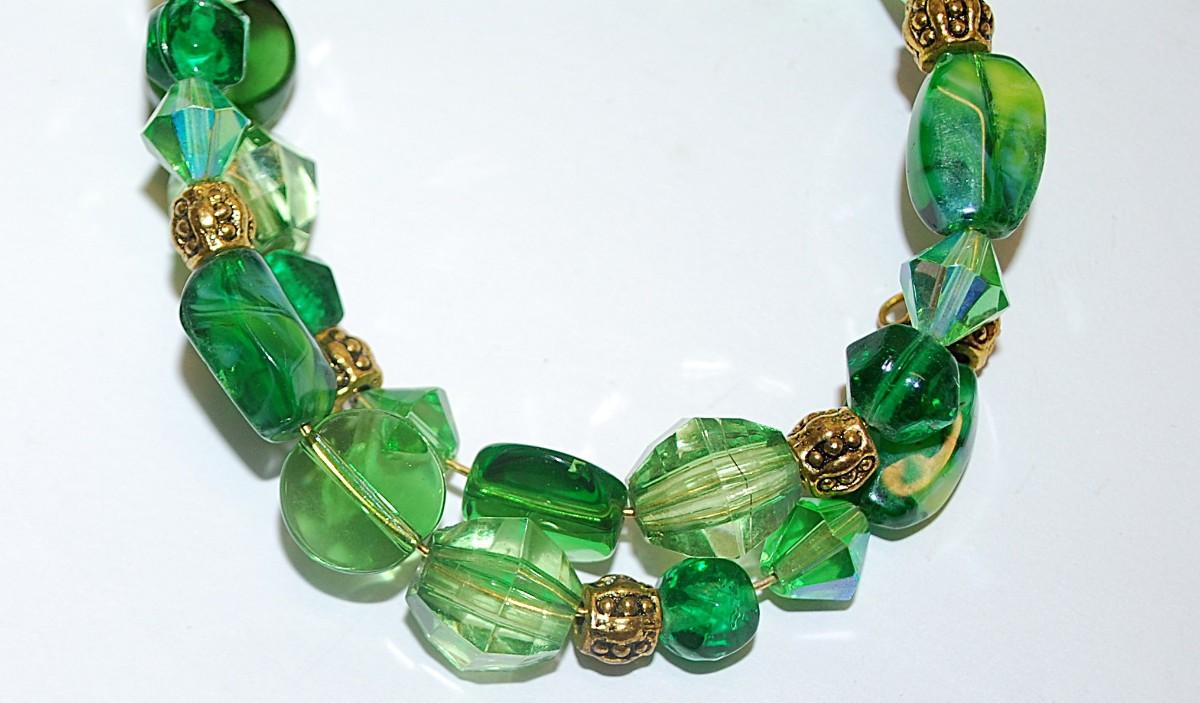 Emerald GREEN Beaded WRAP-AROUND BRACELET (2"+ Opening) with Gold Tone Barrel Spacers