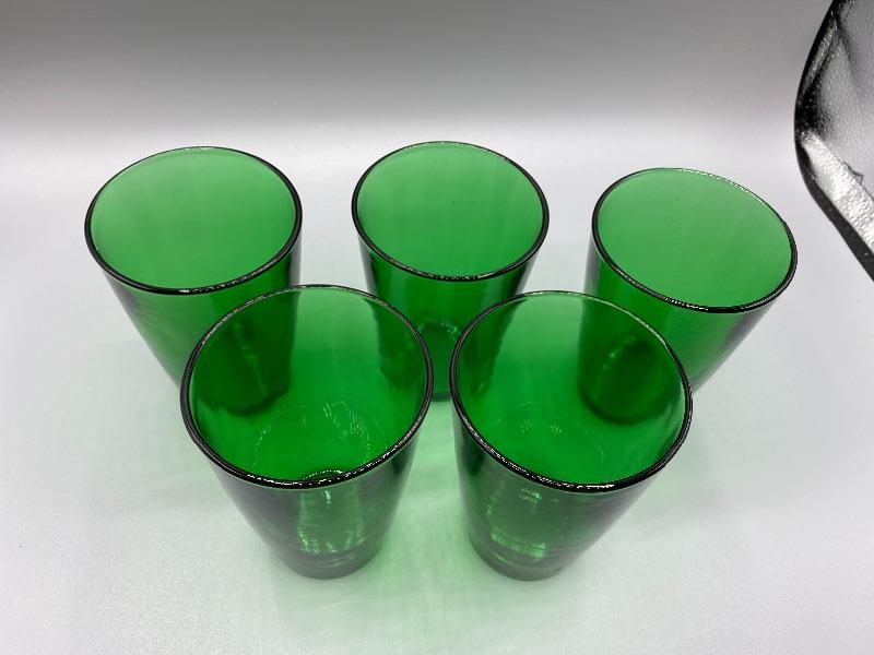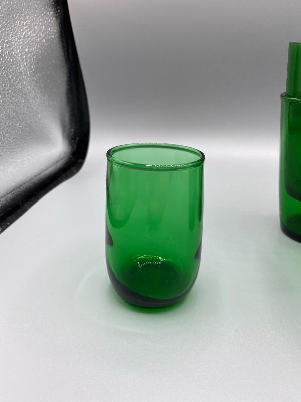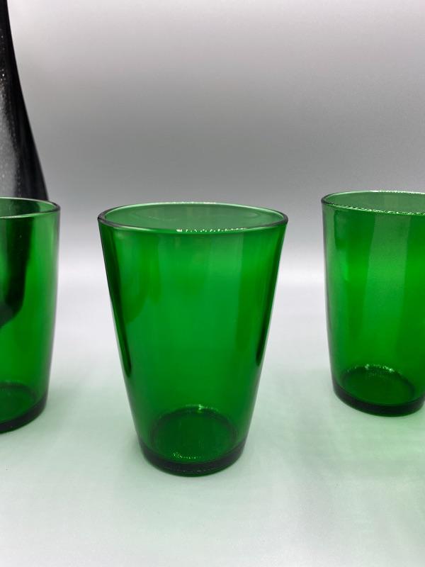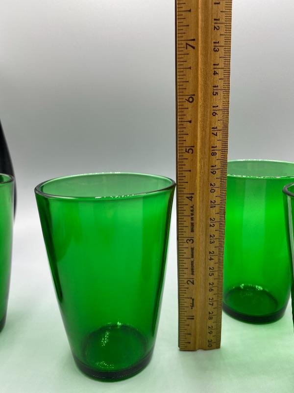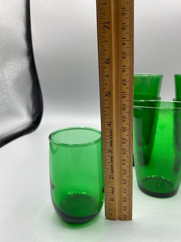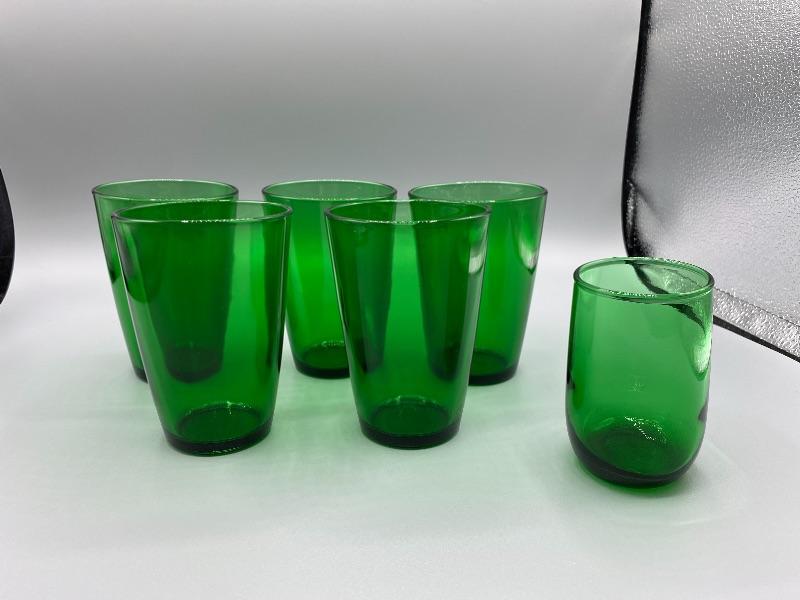 Set of 5 emerald green drink glasses and one juice glass. Great condition. Drink glasses are a little over 4” and juice glass about 3.5”.