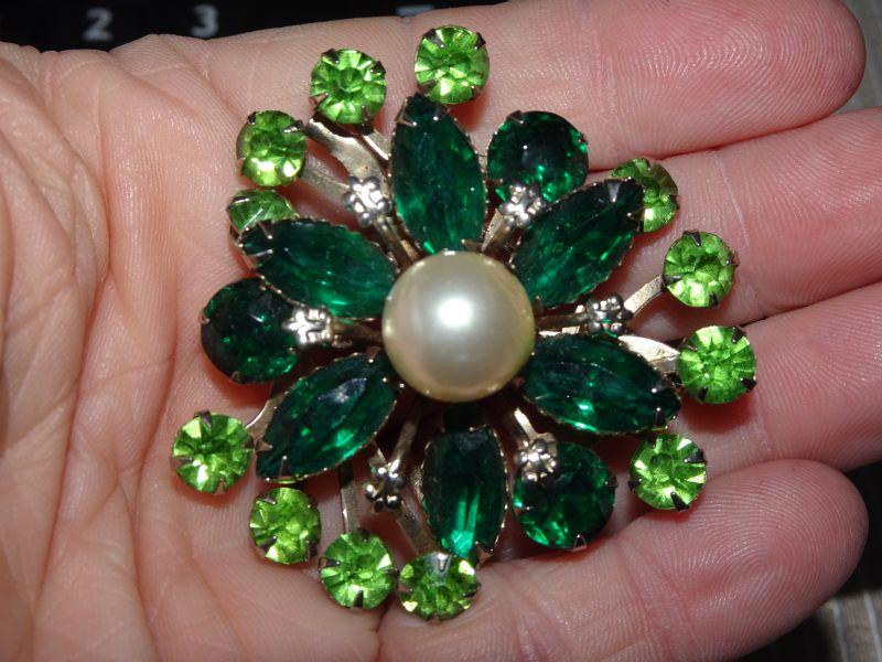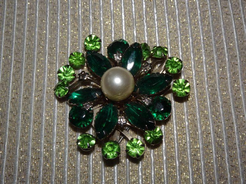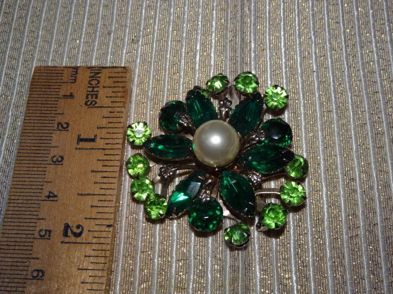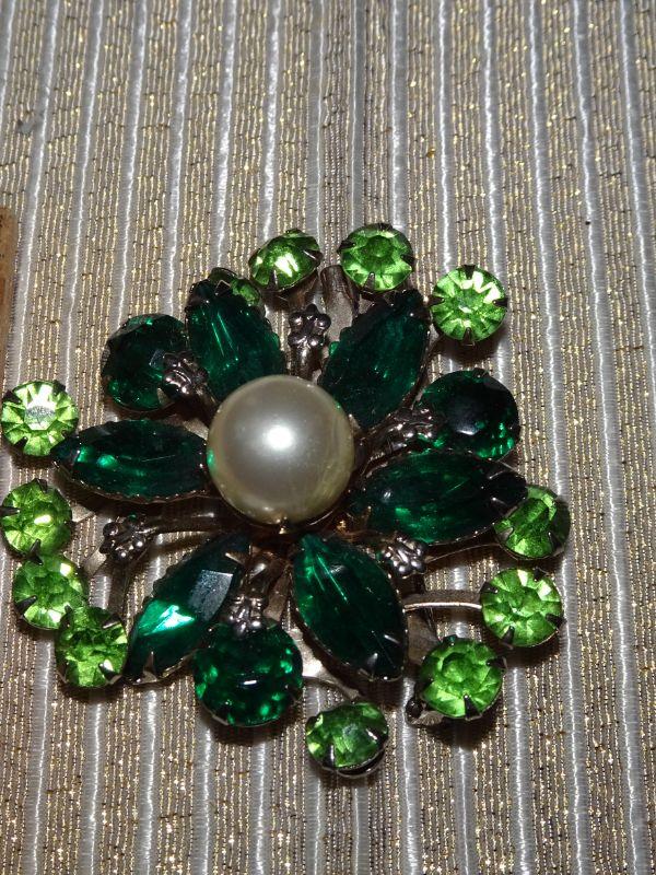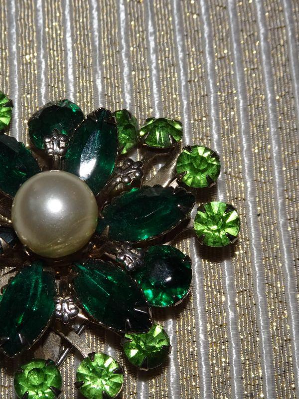 Emerald Green & Pearl Flower Rhinestone Brooch