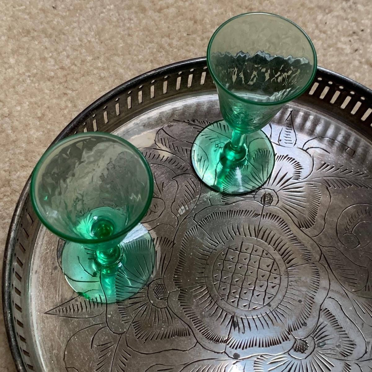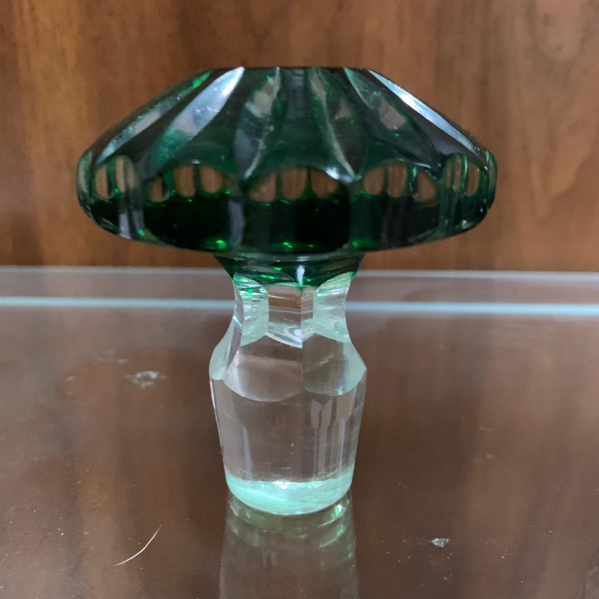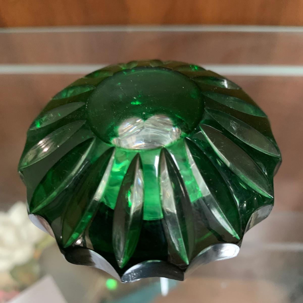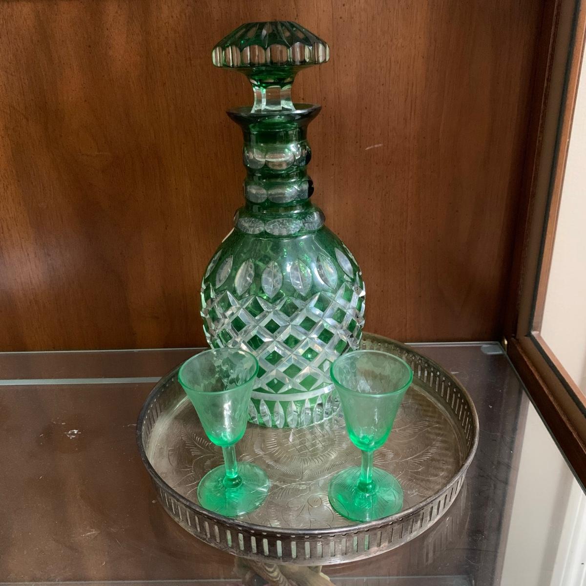Exquisite cut glass decanter with emerald green colored accents. Comes with two small green stemmed glasses and an ornate metal tray. The decanter is in excellent condition. There is one small chip on the base of one of the small glasses. The metal tray is tarnished, but sturdy. Tray is 8.5”D.