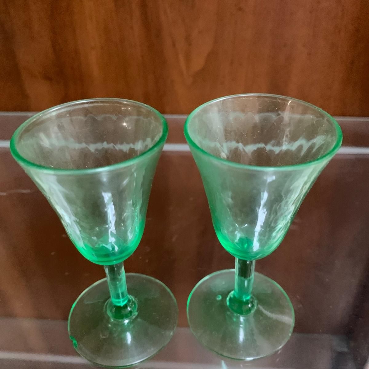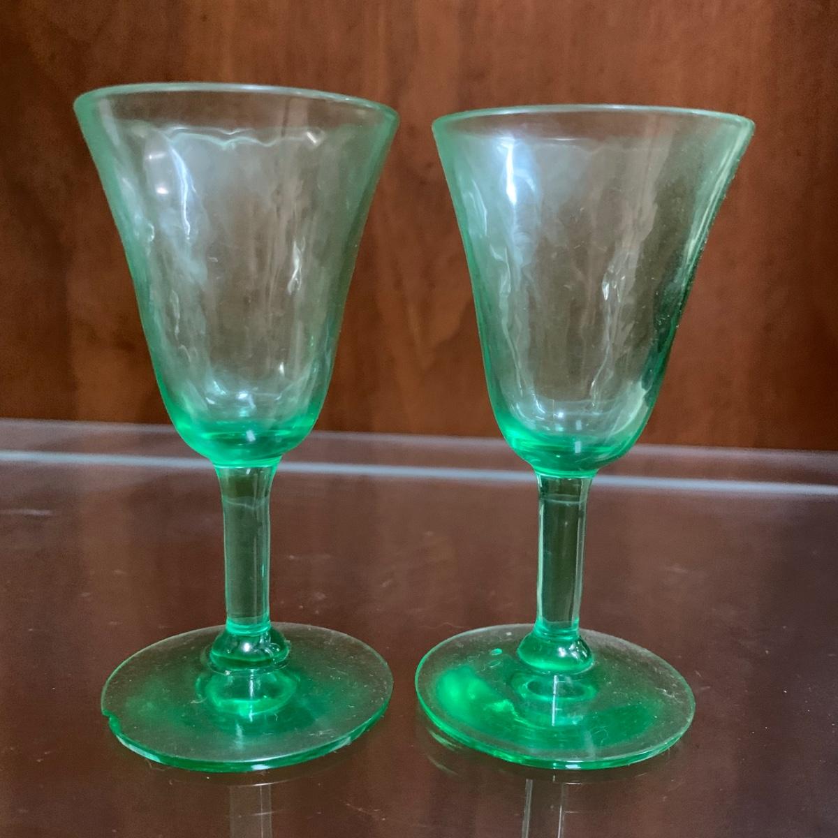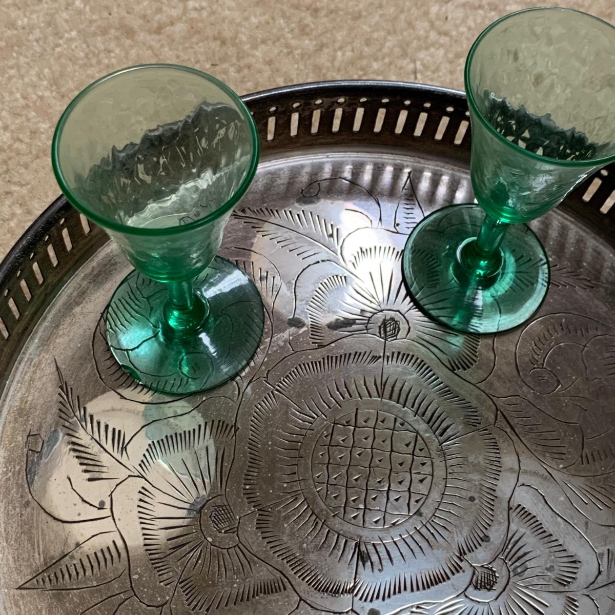 Exquisite cut glass decanter with emerald green colored accents. Comes with two small green stemmed glasses and an ornate metal tray. The decanter is in excellent condition. There is one small chip on the base of one of the small glasses. The metal tray is tarnished, but sturdy. Tray is 8.5”D.