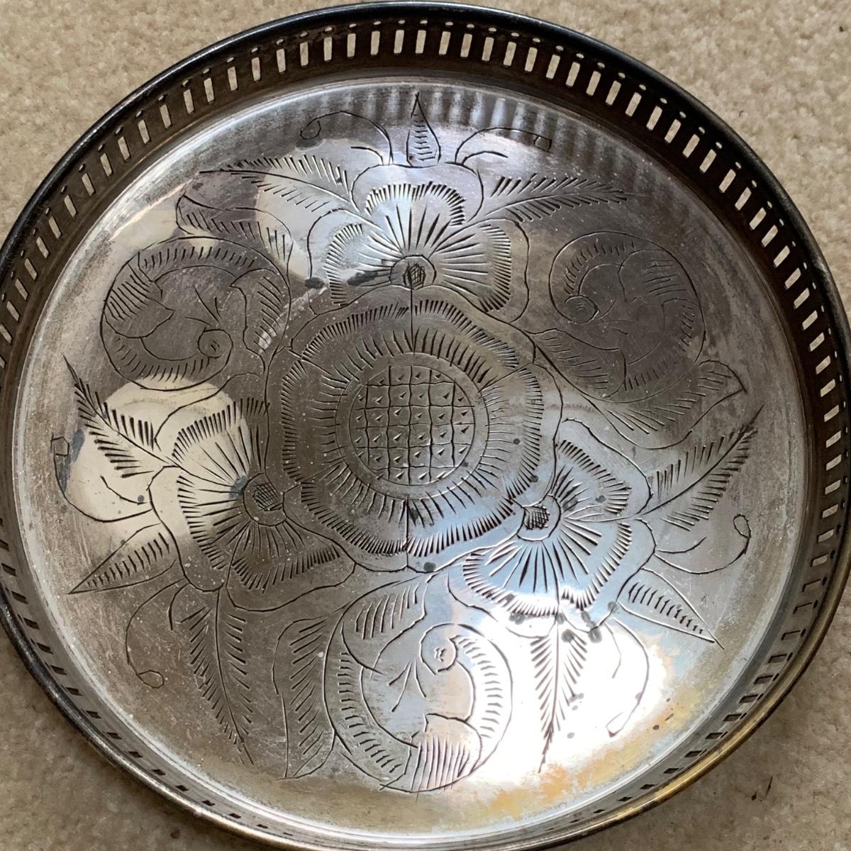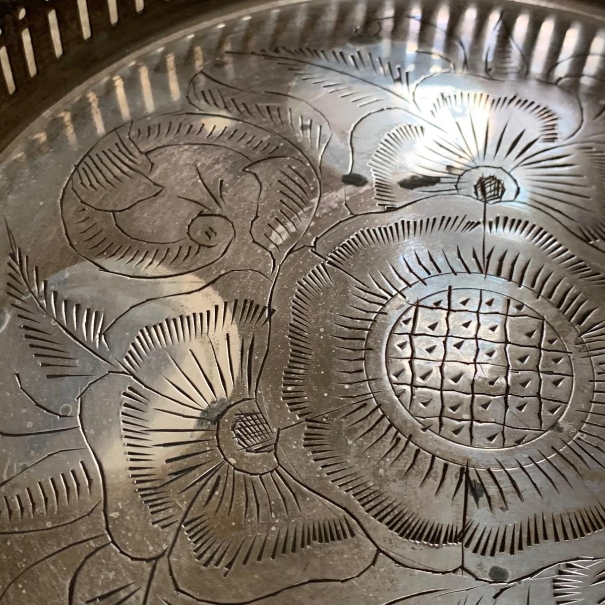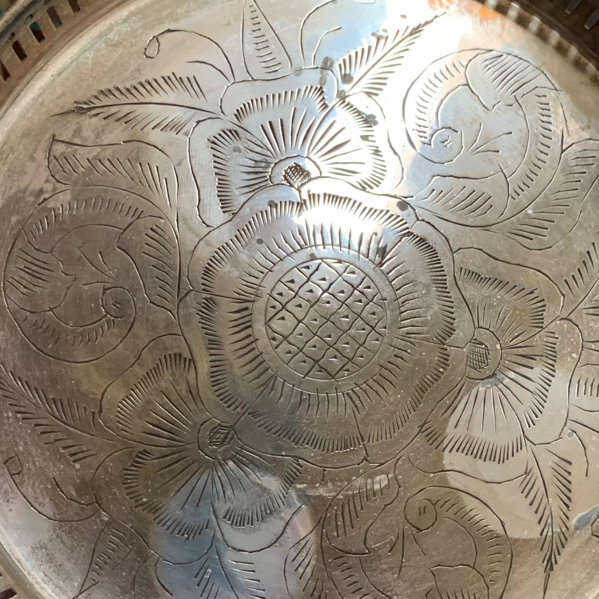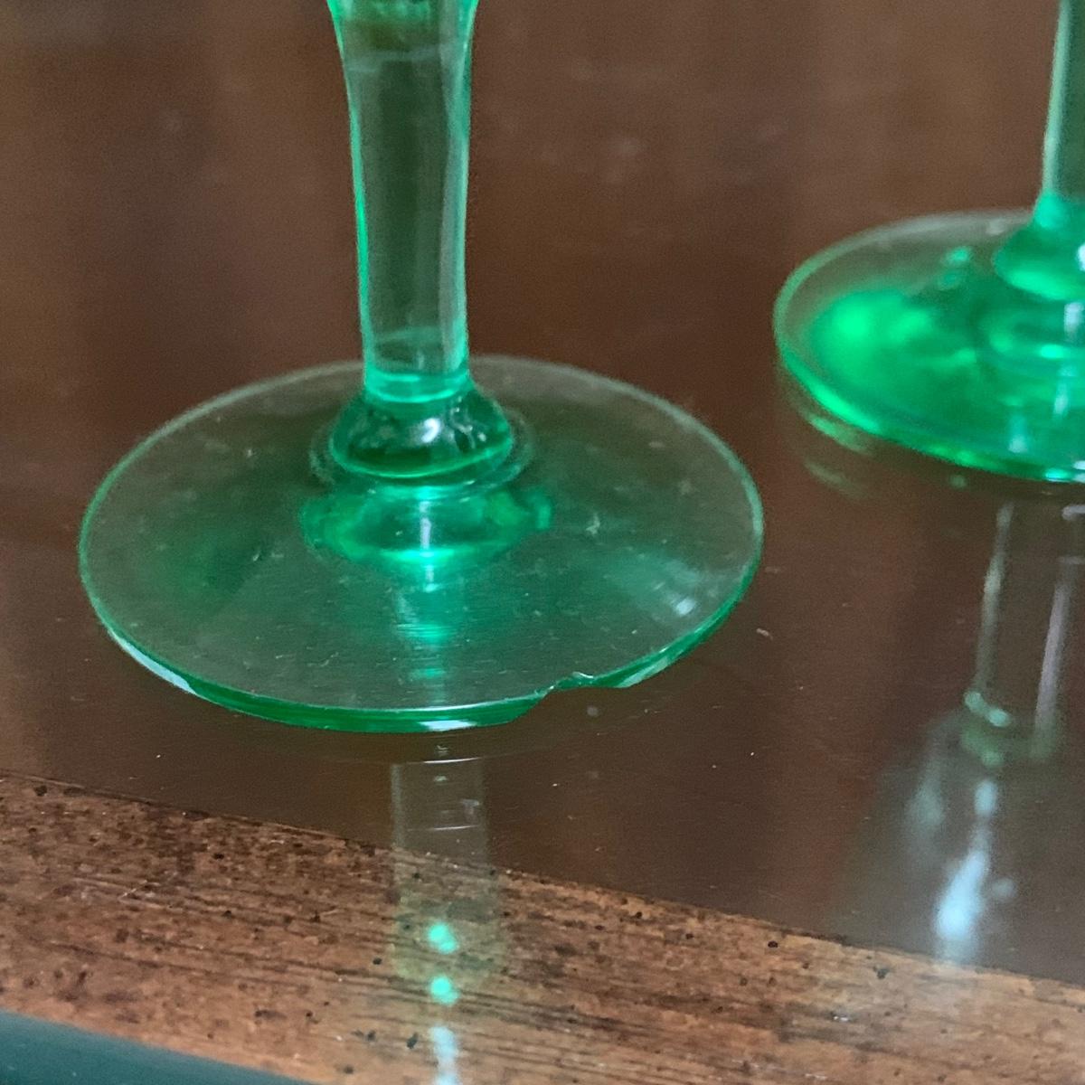 Exquisite cut glass decanter with emerald green colored accents. Comes with two small green stemmed glasses and an ornate metal tray. The decanter is in excellent condition. There is one small chip on the base of one of the small glasses. The metal tray is tarnished, but sturdy. Tray is 8.5”D.