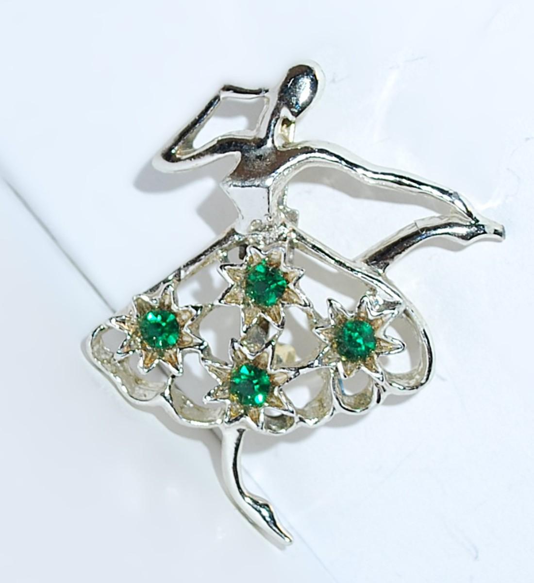 "Emerald Stars" BALLARINA BROOCH (1¾" x 1½") with 4 Green Stones on Skirt and Silver Tone Setting