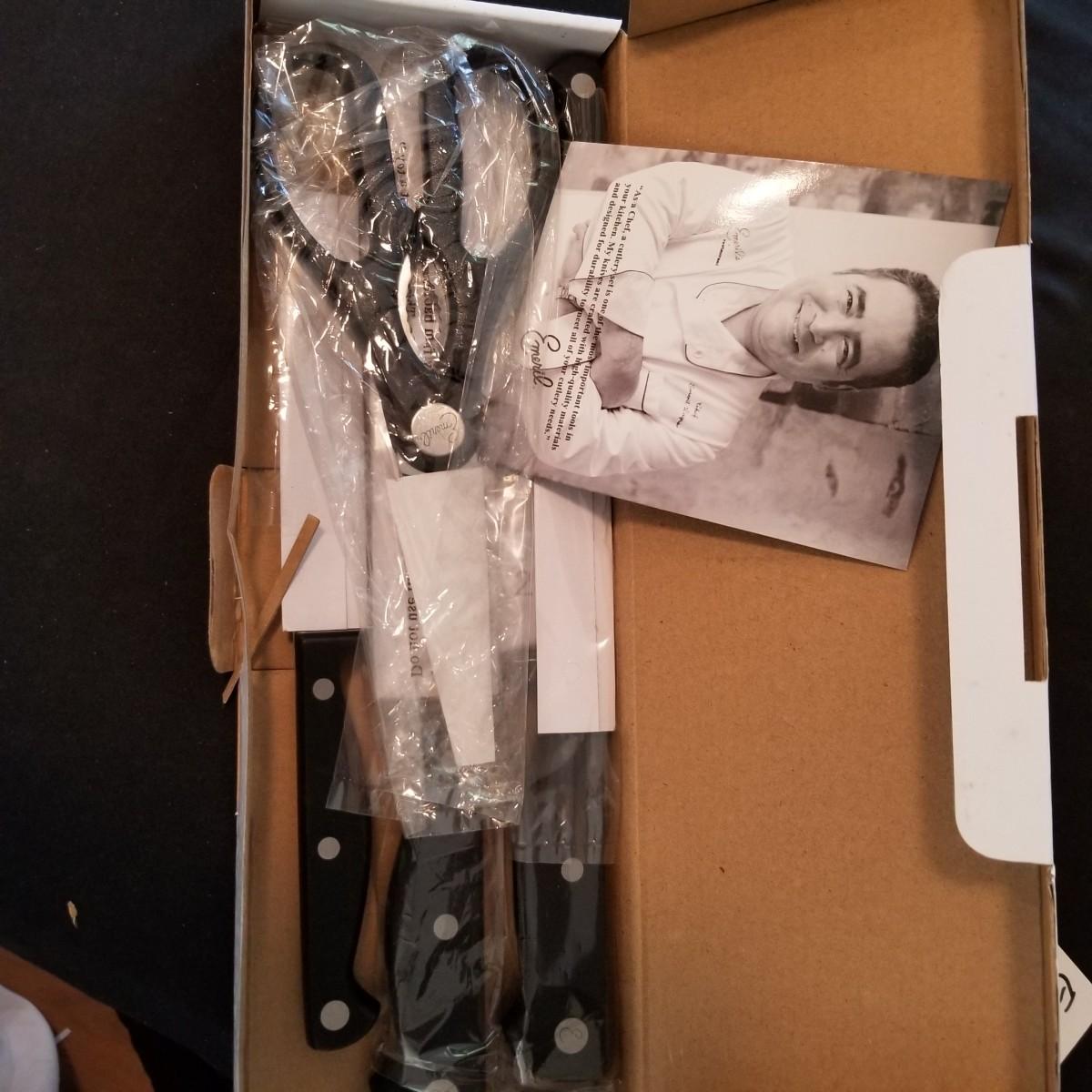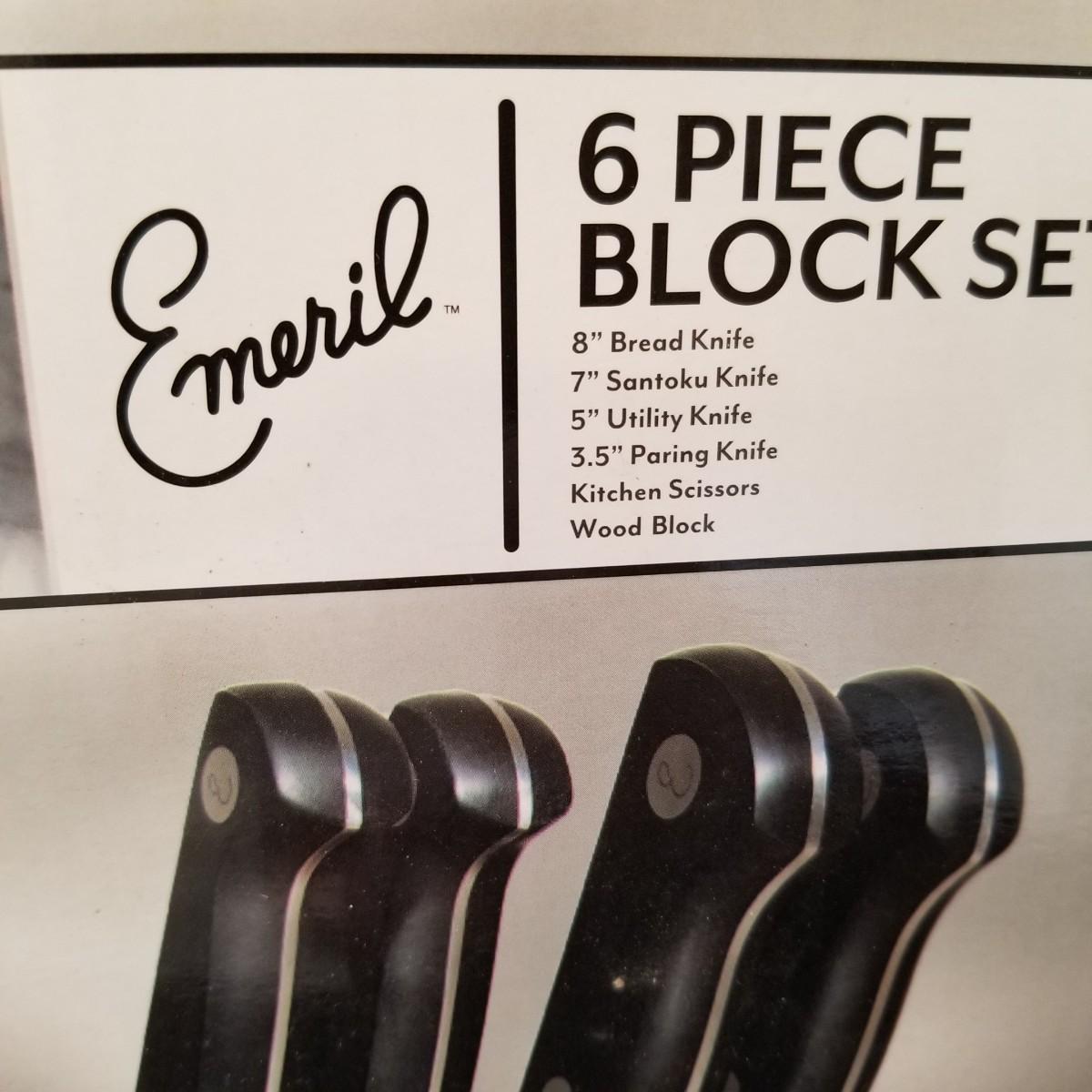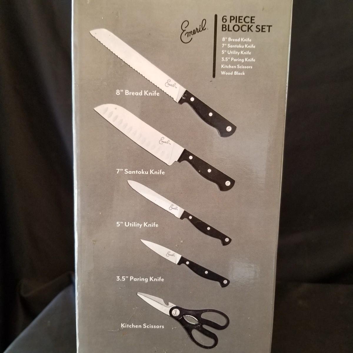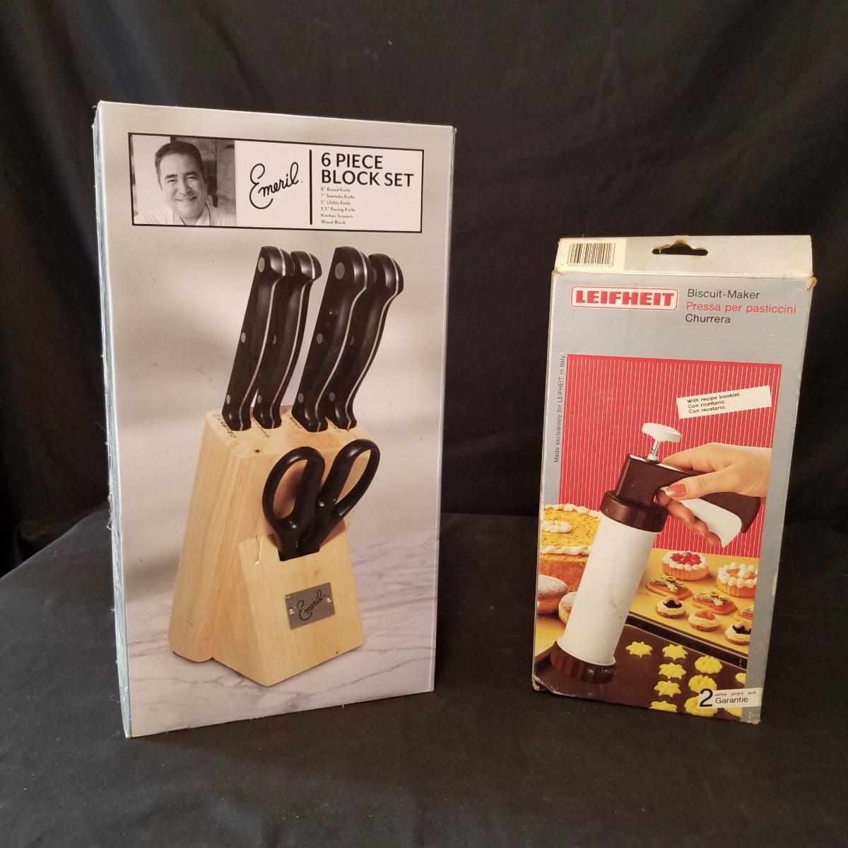 Six piece Emeril knife set with wooden block. NIB. Also a Leifheit biscuit maker with changeable disks. Lightly used. Shipping available.