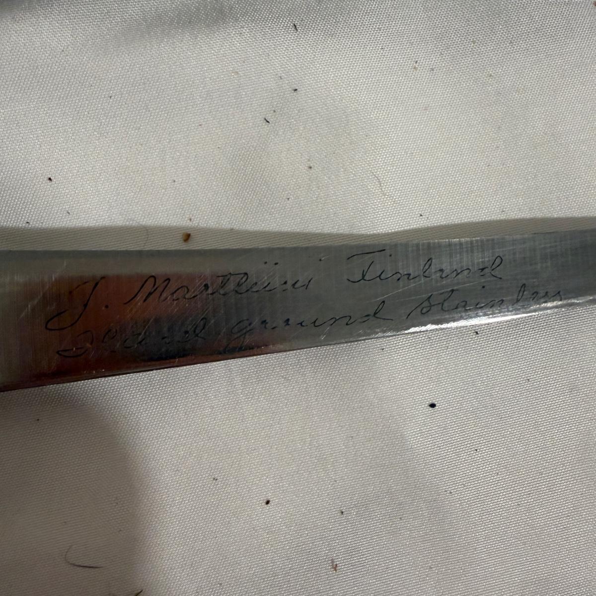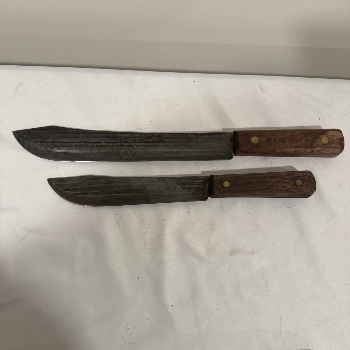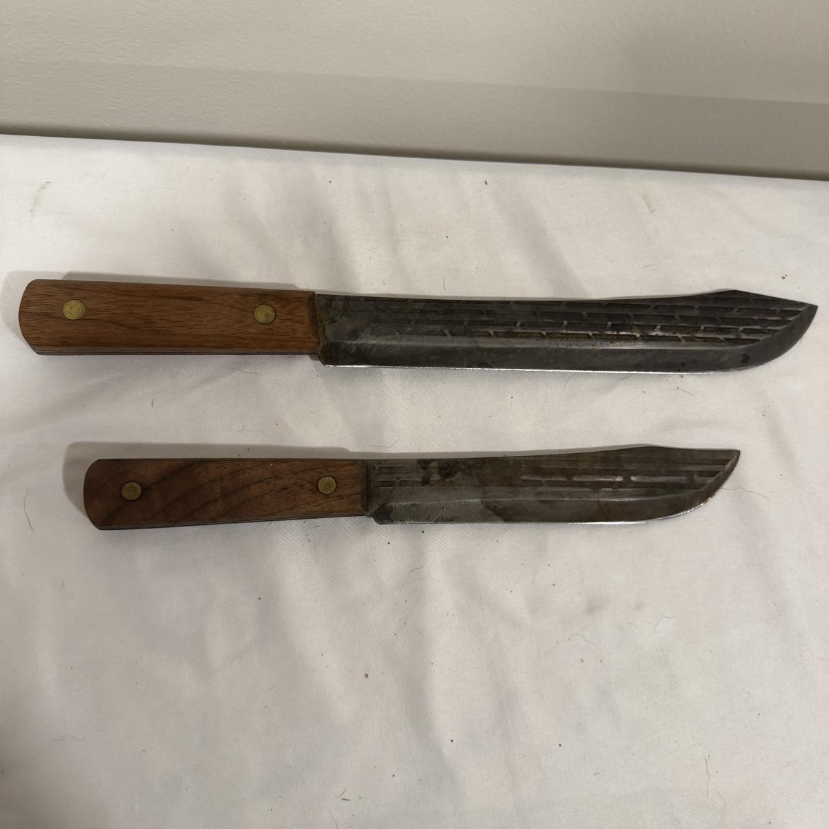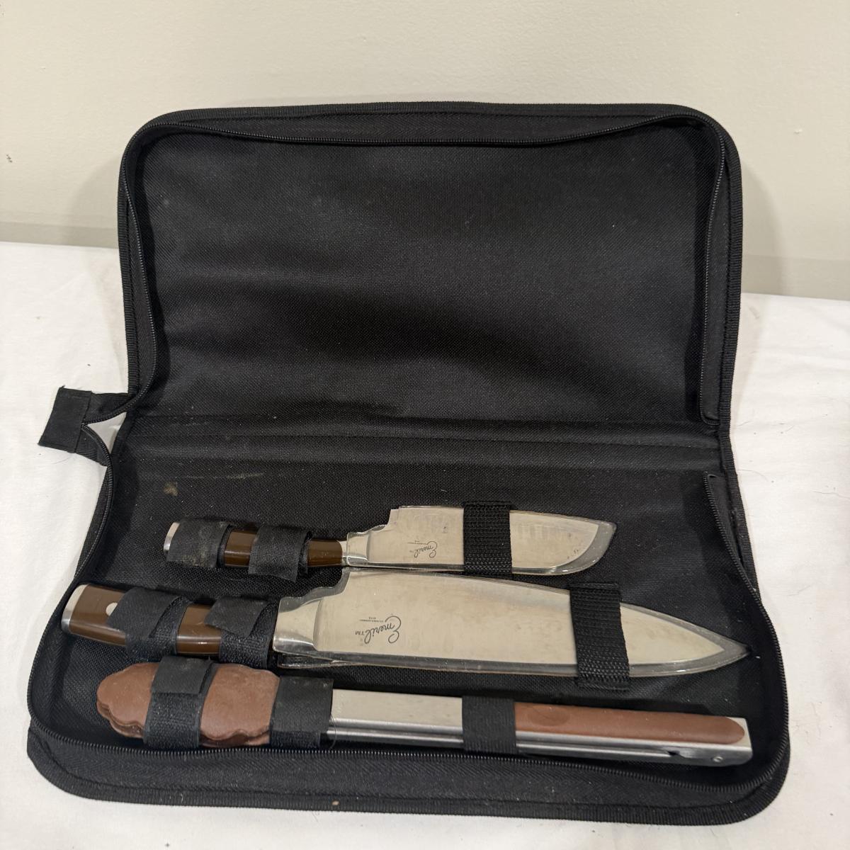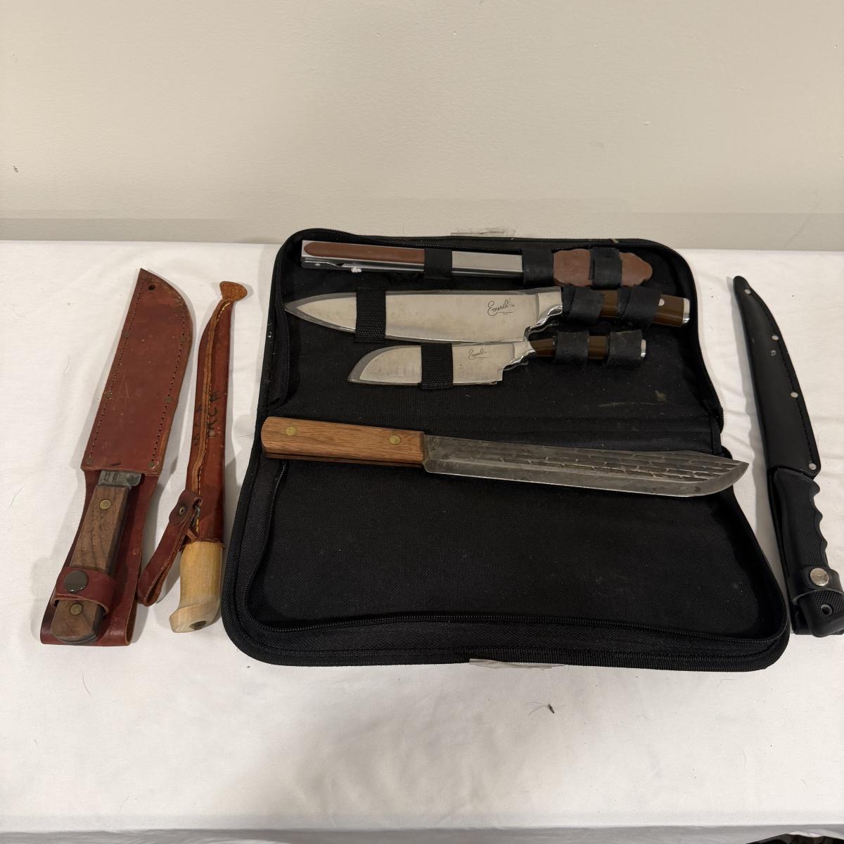 Lot includes a three piece set from Emeril with case, two Ontario Knife Company Rada Cutlery knife and a J. Marttiini knife. Longest knife measures 15” long. Emeril case has broken zipper.
