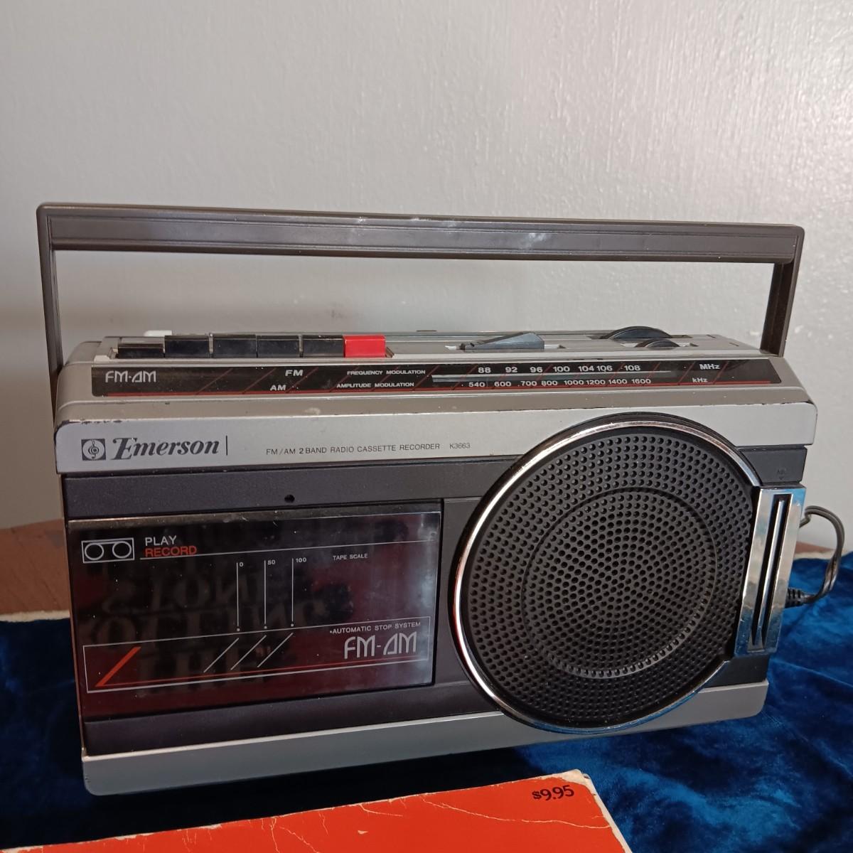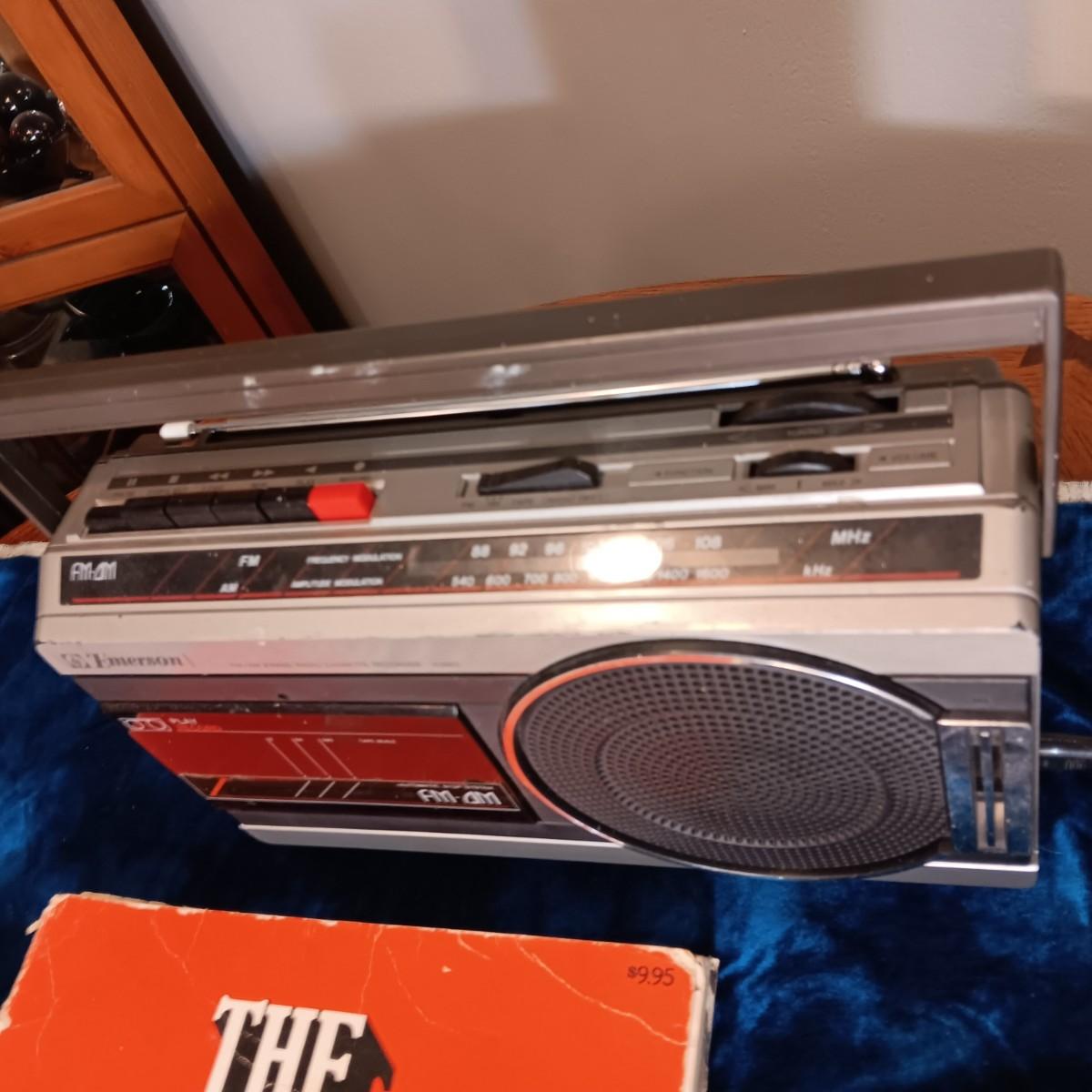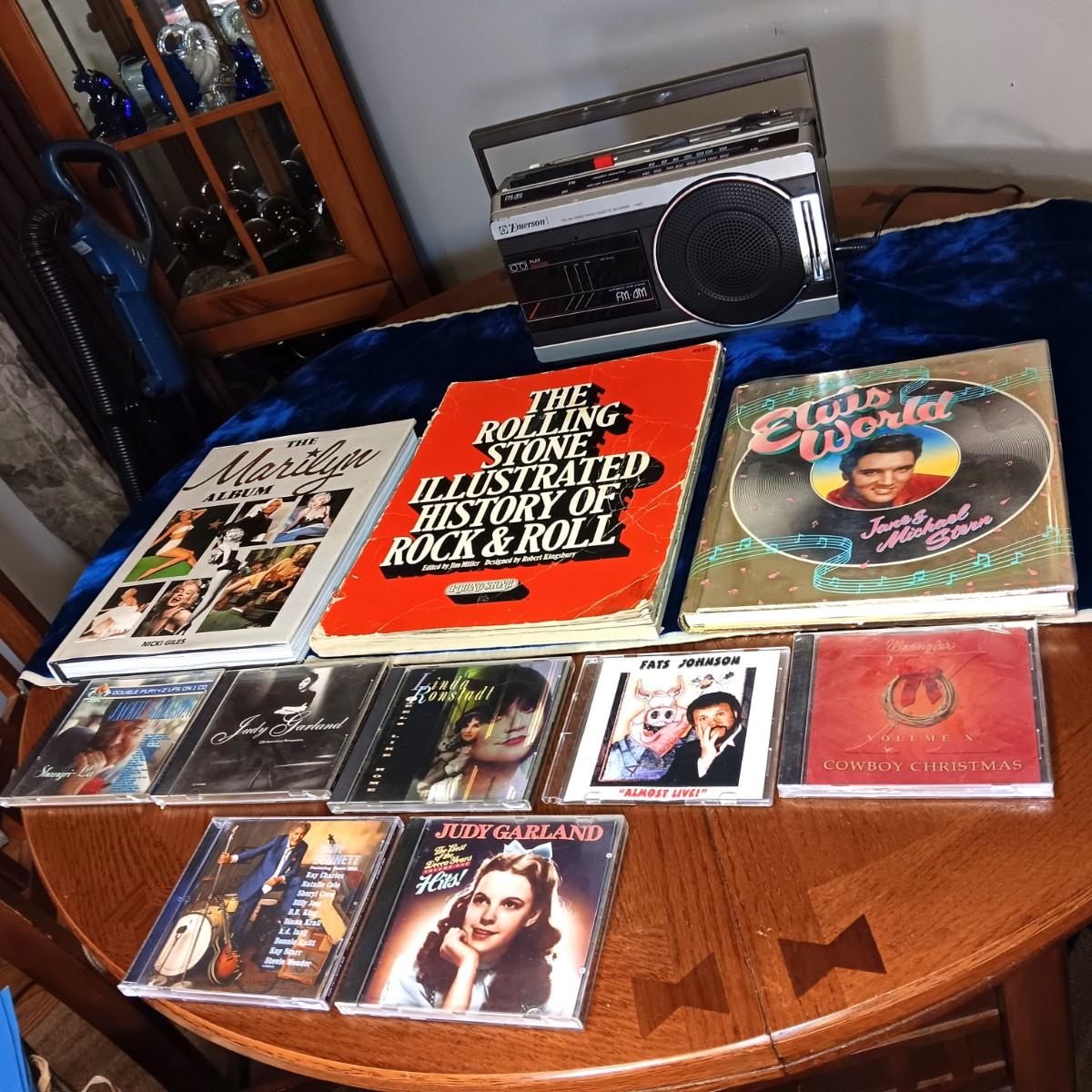 EMERSON AM/FM CASSETTE RADIO, MUSIC ON CD'S AND COFFEE TABLE BOOKS
