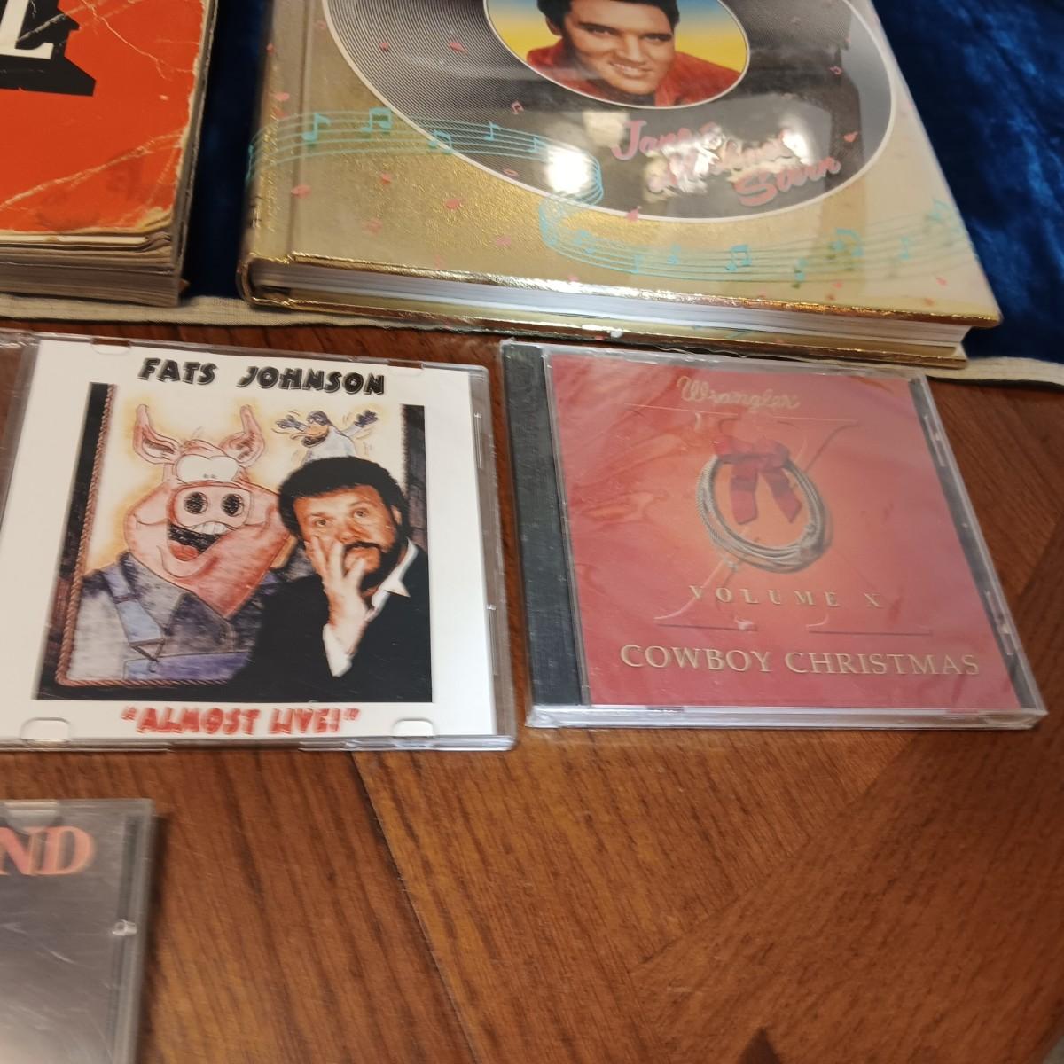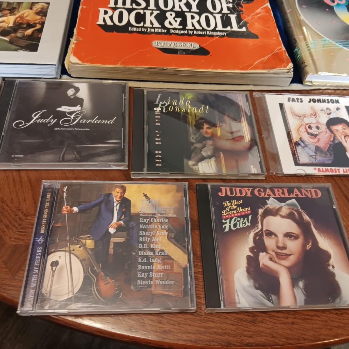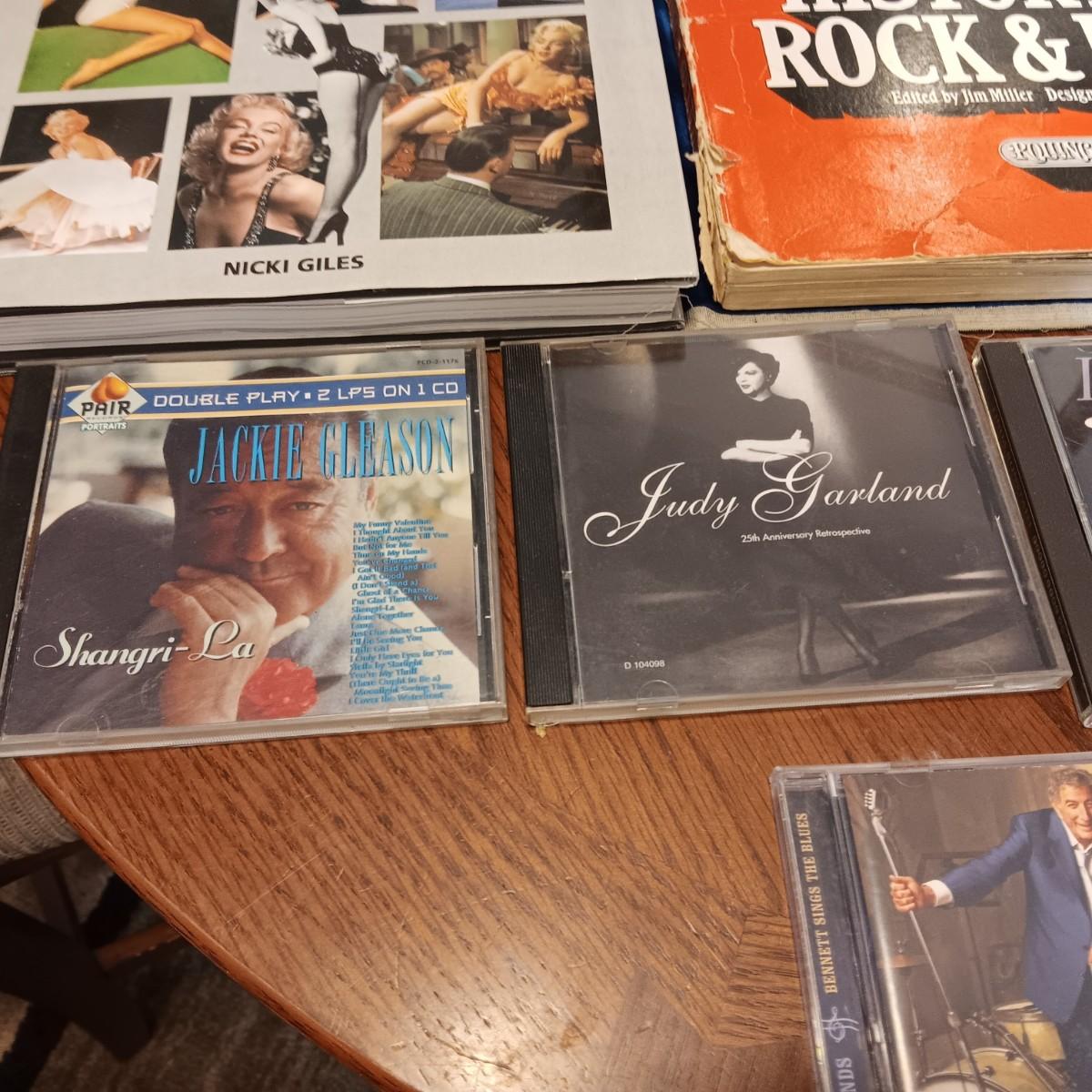 EMERSON AM/FM CASSETTE RADIO, MUSIC ON CD'S AND COFFEE TABLE BOOKS