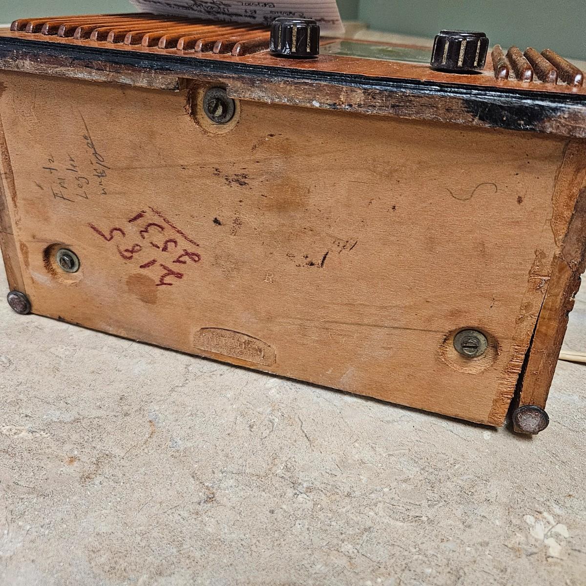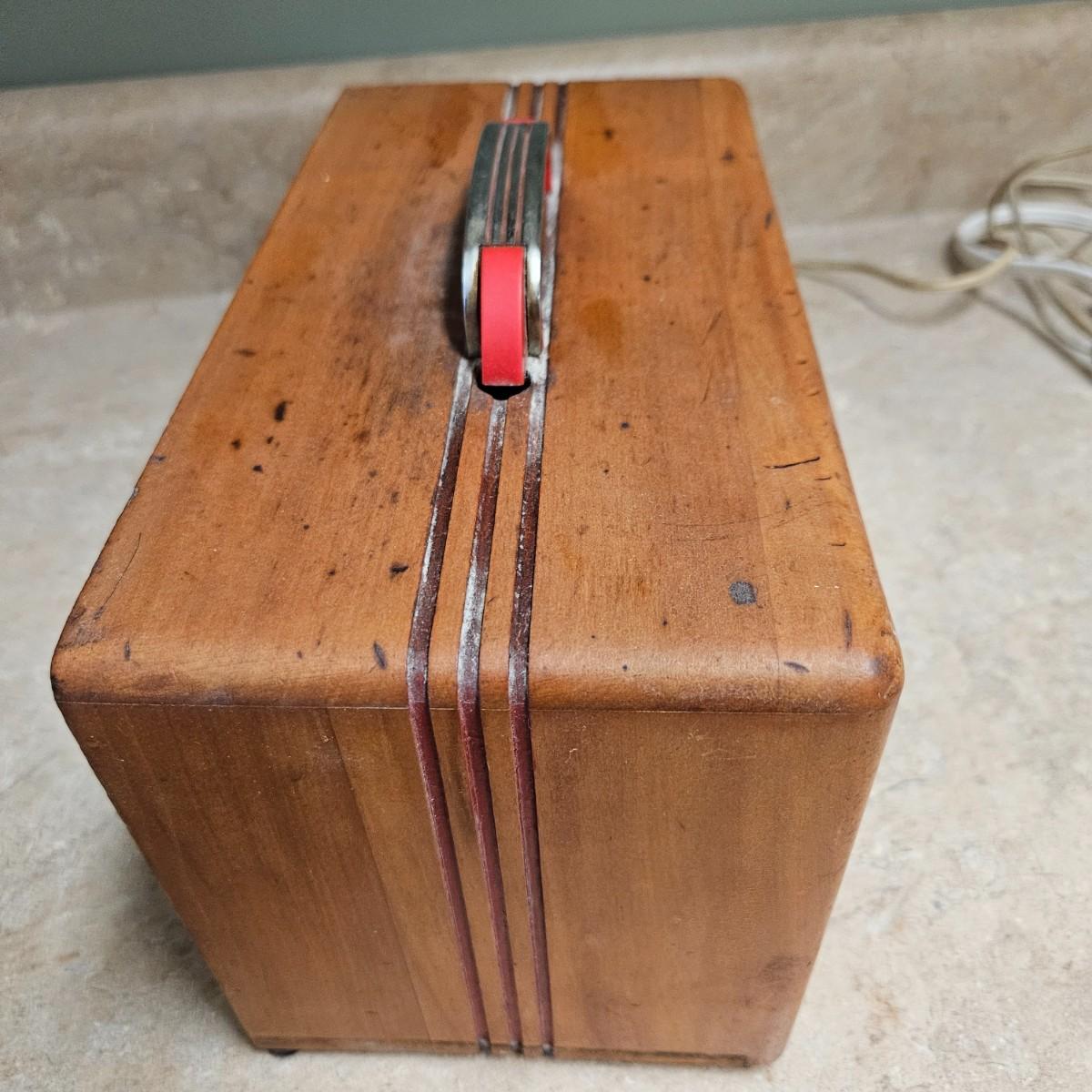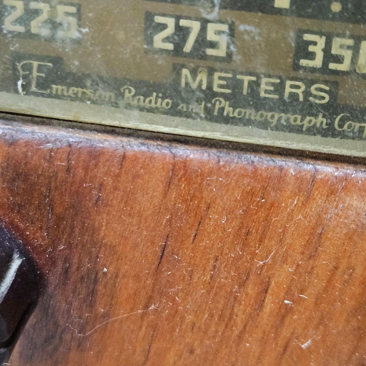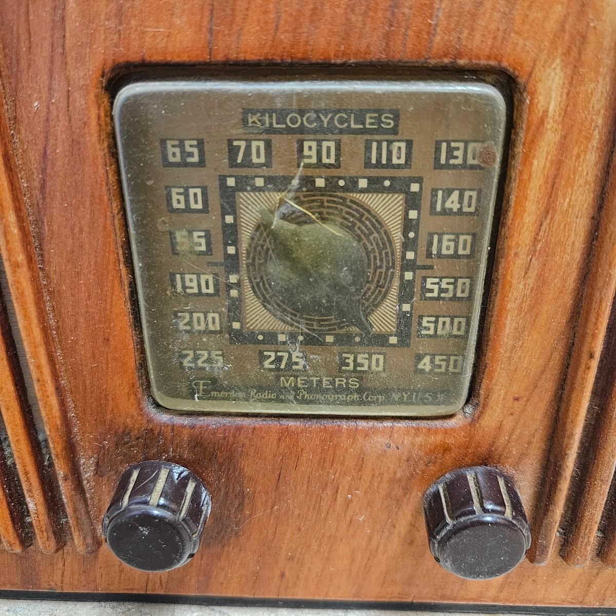 An Emerson Radio and Phonograph Corp Radio with a wooden case that powered on when plugged in. It measures approximately 10.5" x 6" x 8"H. There is a crack in the plastic screen for the station display and no back cover. Shipping available