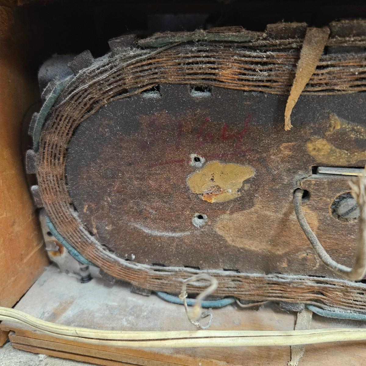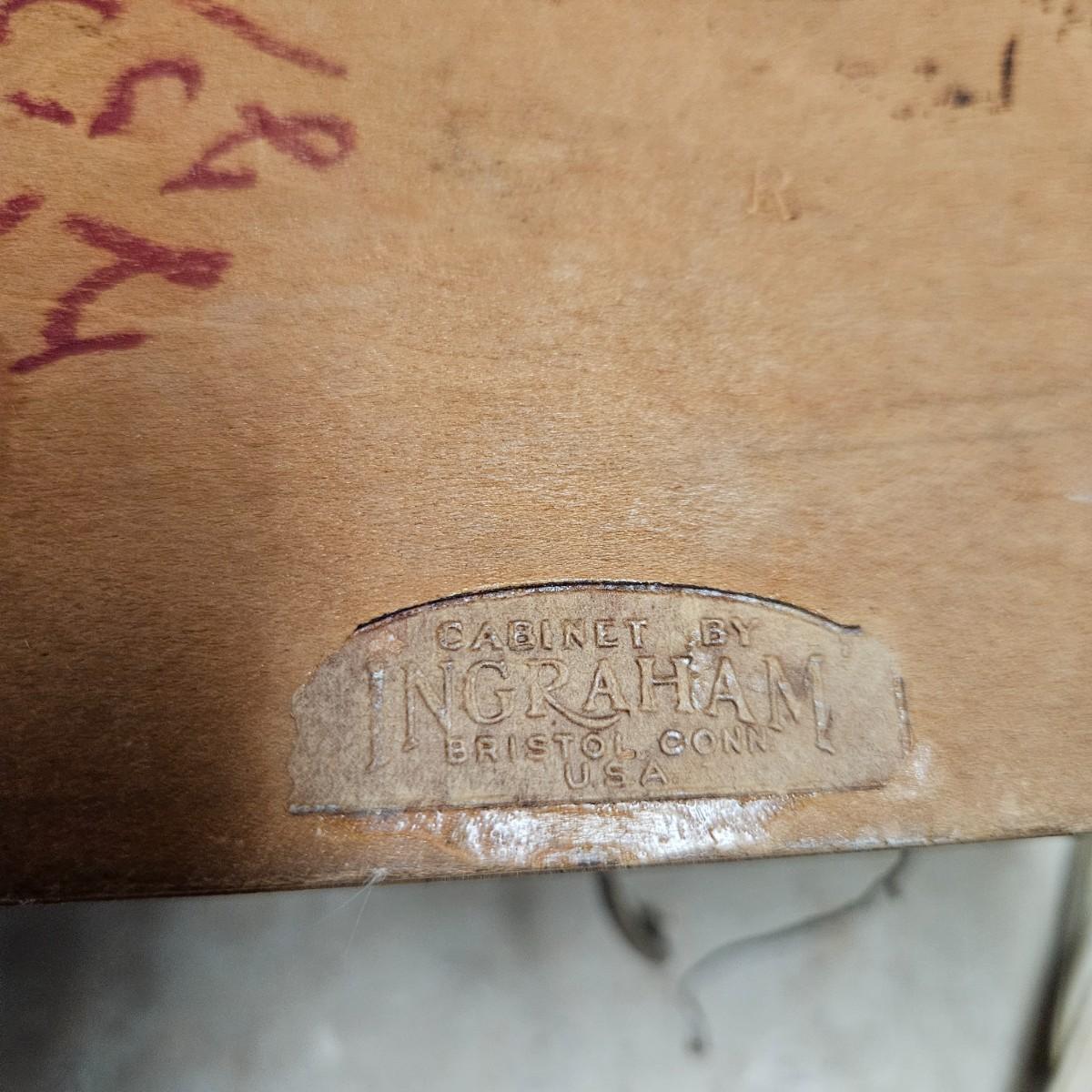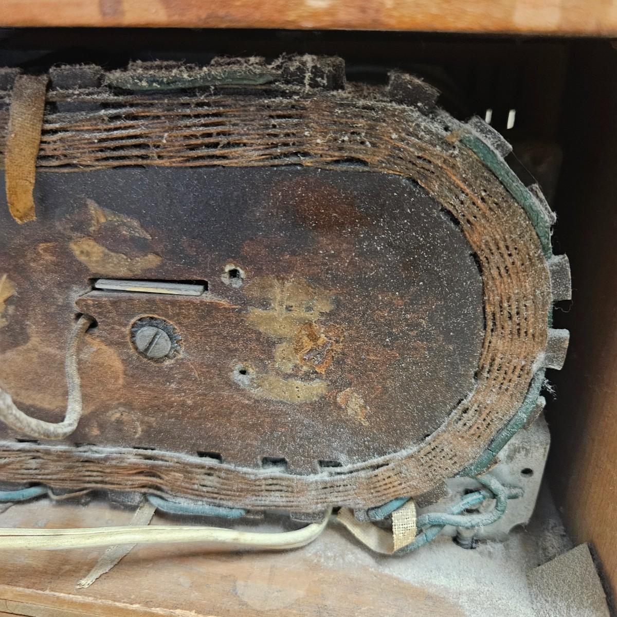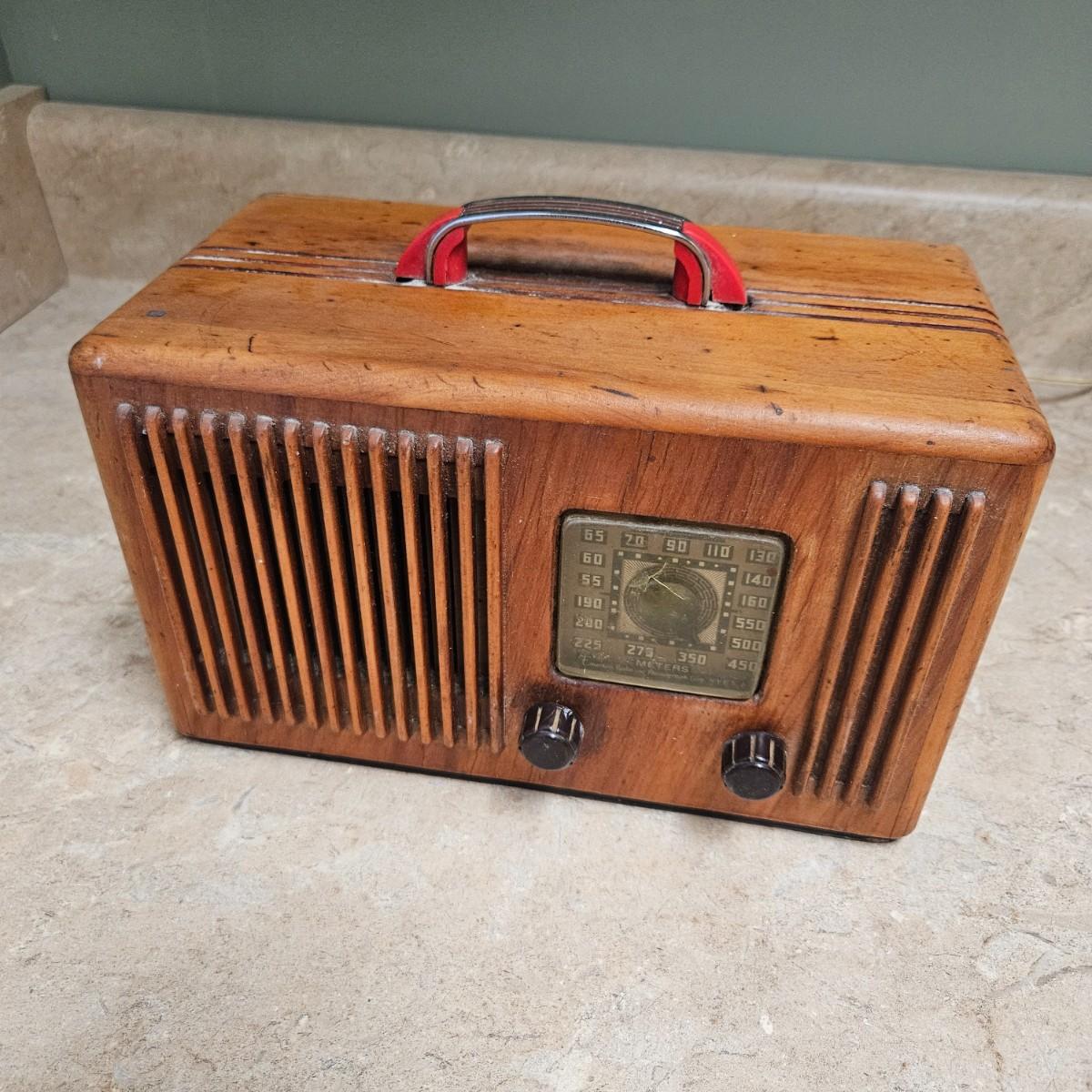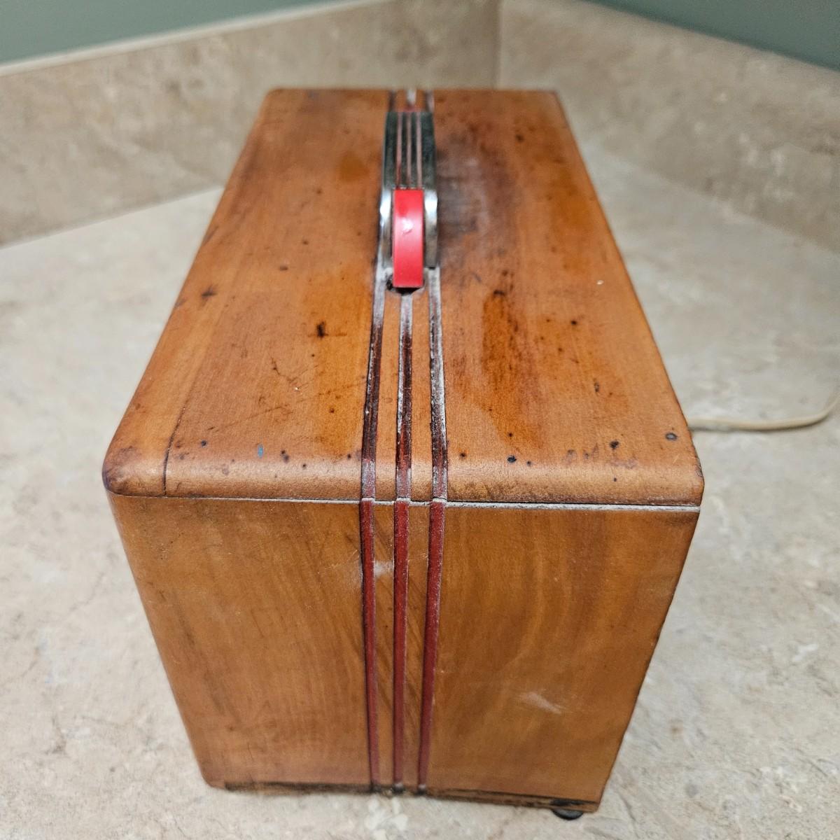 An Emerson Radio and Phonograph Corp Radio with a wooden case that powered on when plugged in. It measures approximately 10.5" x 6" x 8"H. There is a crack in the plastic screen for the station display and no back cover. Shipping available