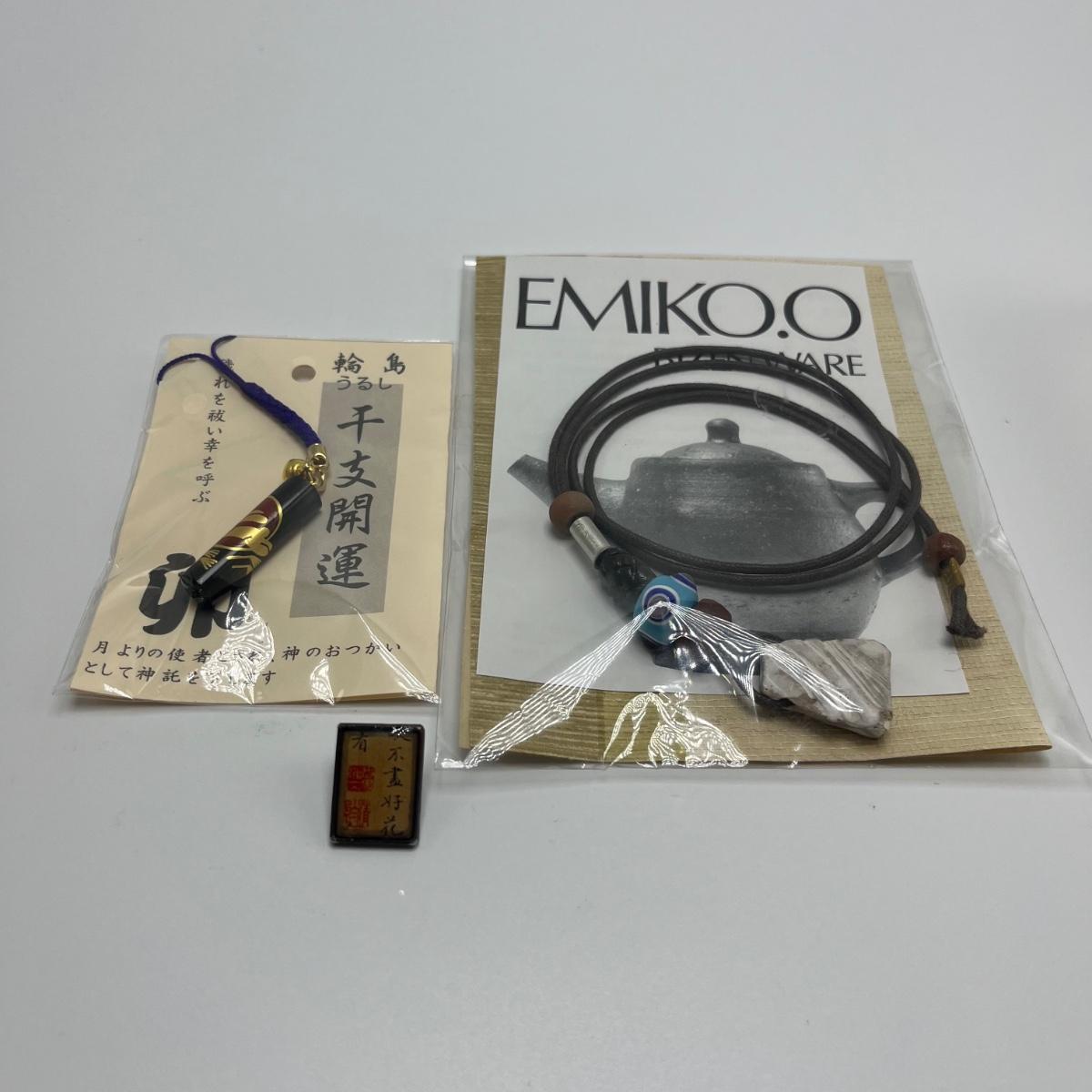 Lot includes NIB Emiko.O Bizen Ware necklace, Asian charm NIB and a pin with Asian writing. All sales are final. No returns or refunds. Please bid accordingly.
