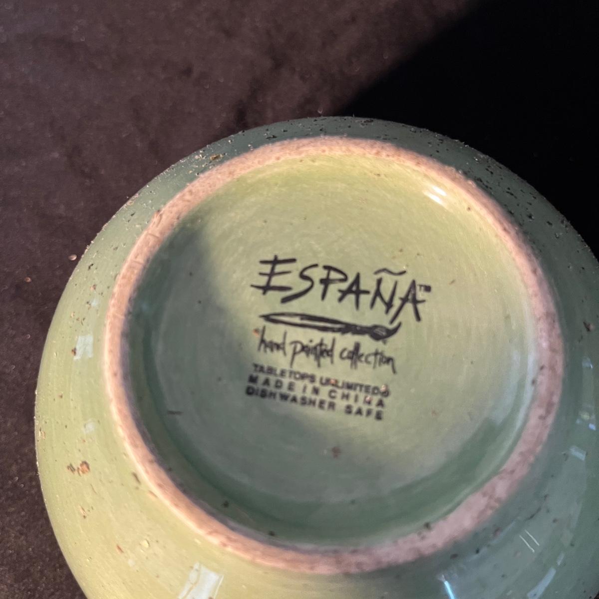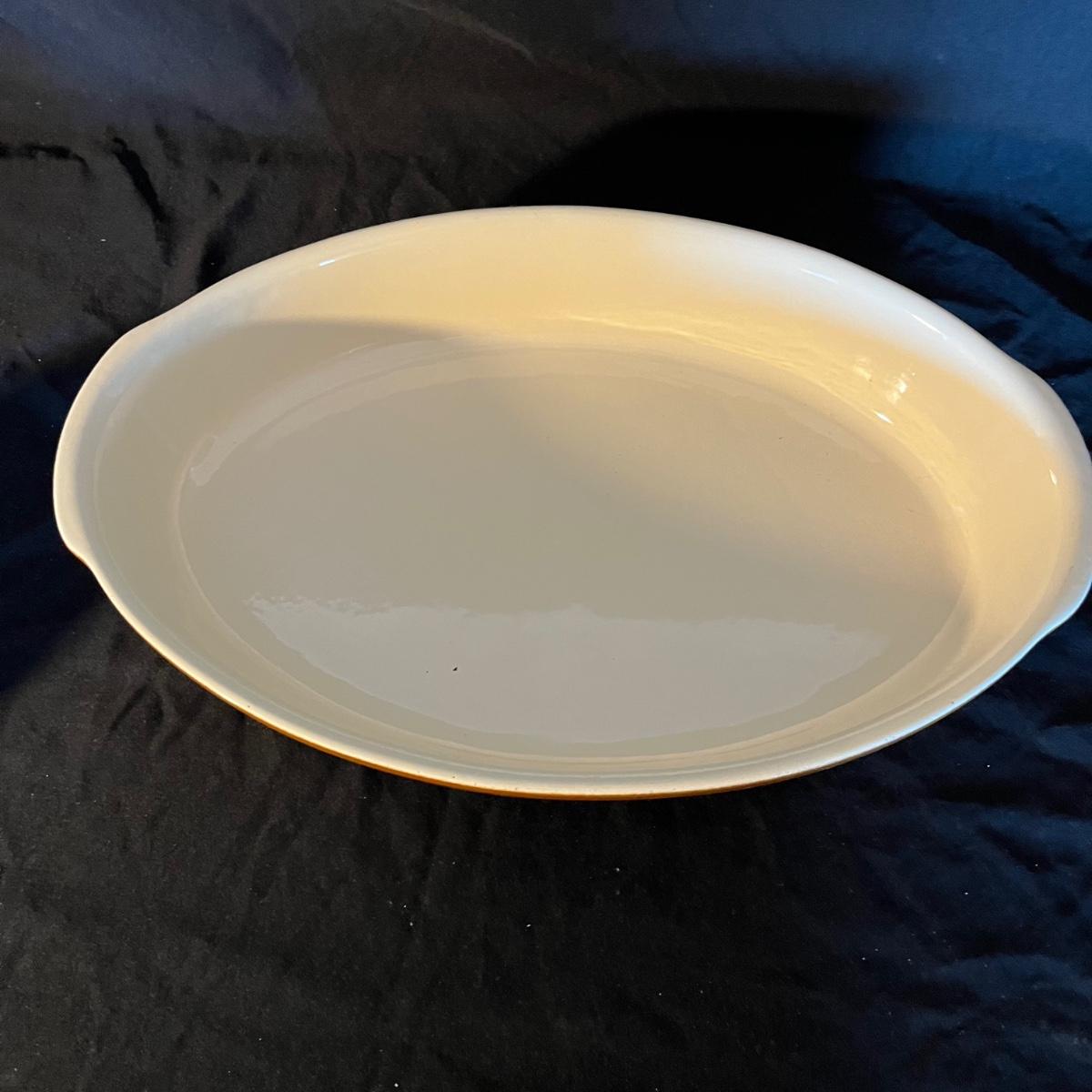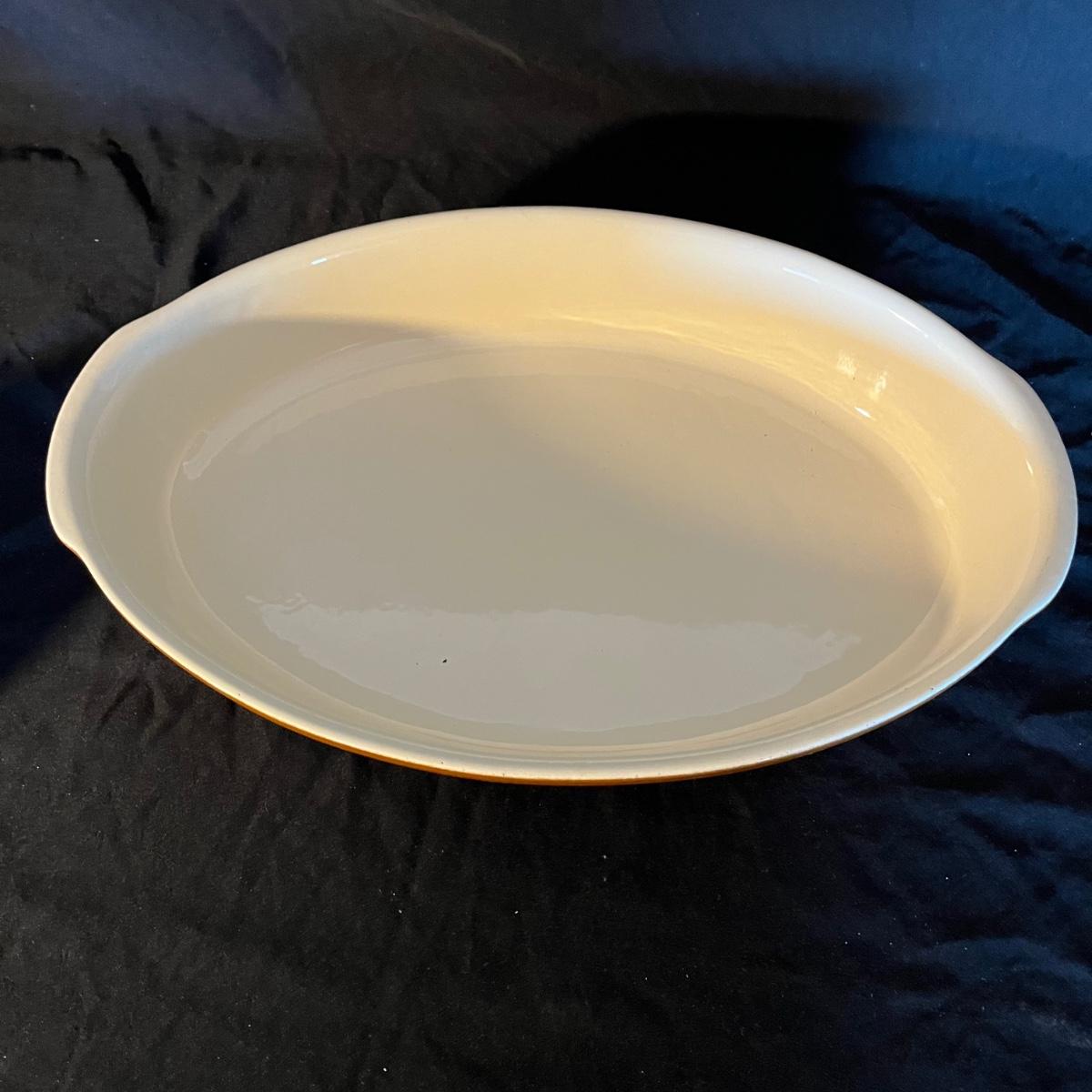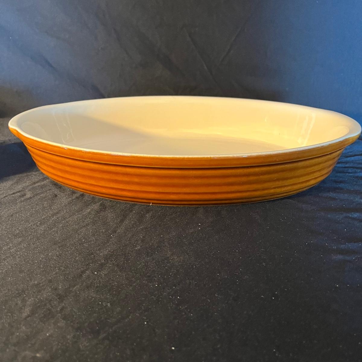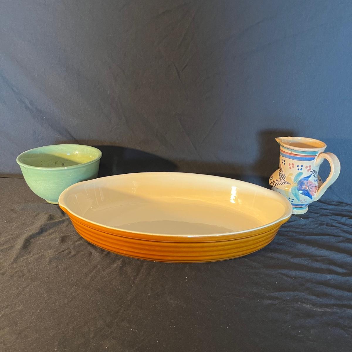Lot includes a large Emile Henry casserole dish, an España ceramic bowl, and an unmarked ceramic pitcher. Dish measures 9.5” x 14.5” x 2.25”.