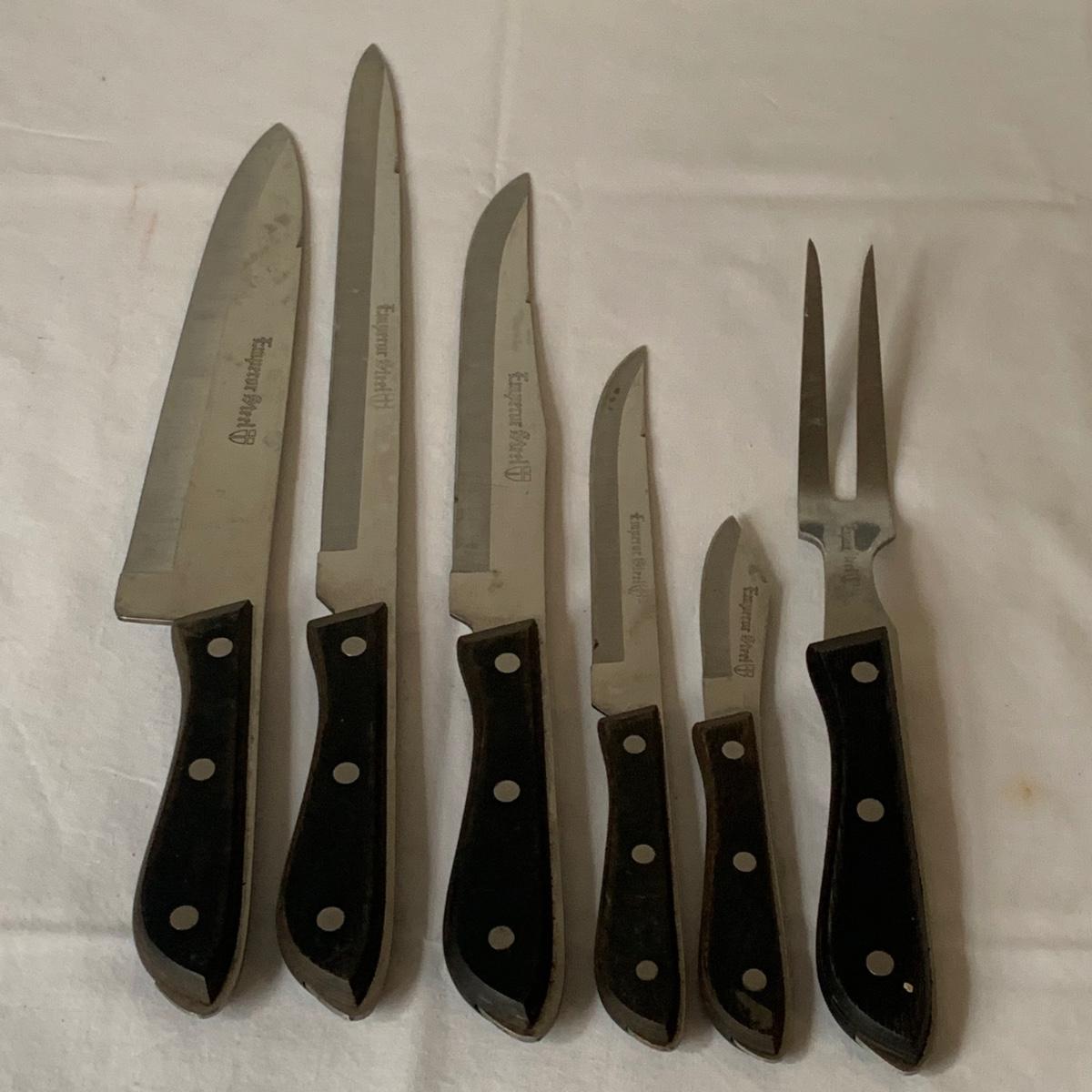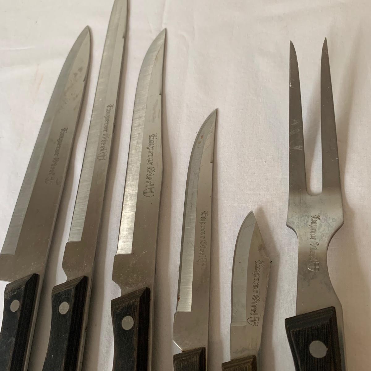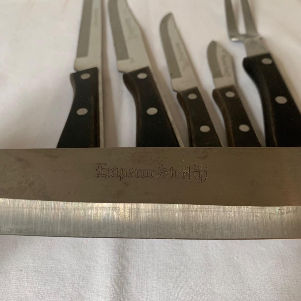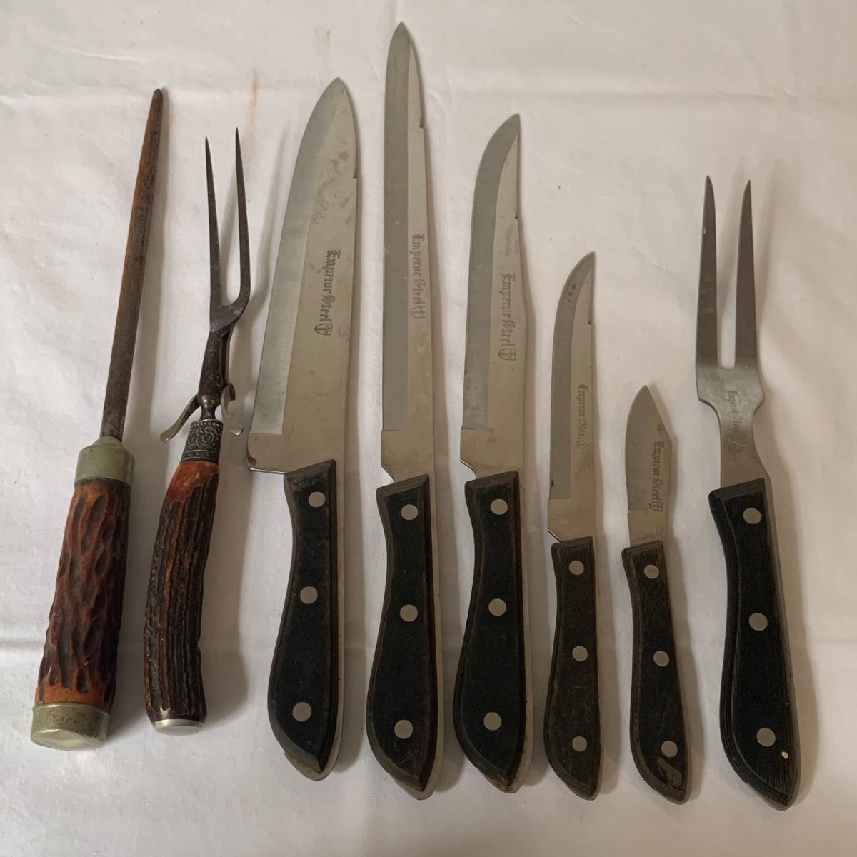 Emperor Steel knife set with five knives and one serving fork, as well as a unique serving fork and knife sharpener with horn or possibly faux horn handles. The Emperor knife set is in good condition and could just use a good cleaning. The carving utensils show minor wear with rust and tarnishing.