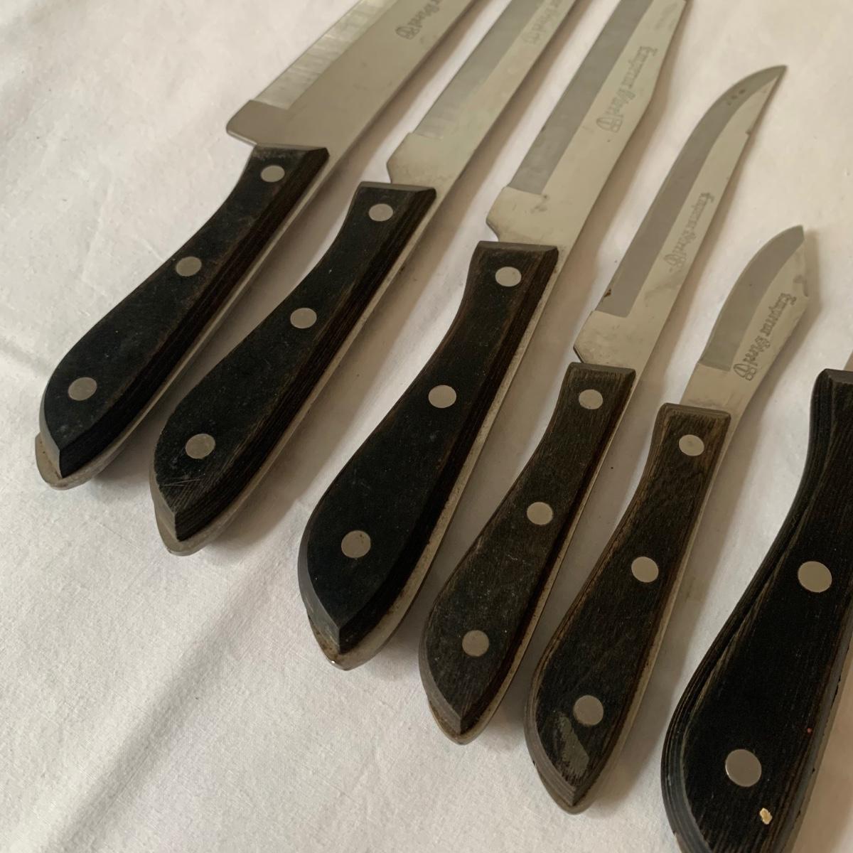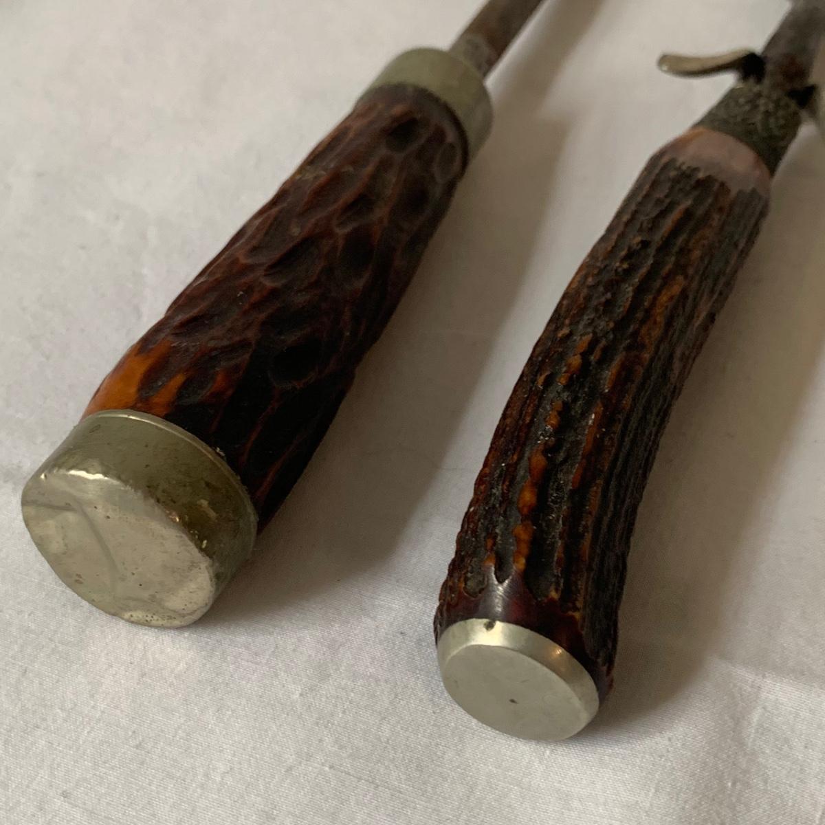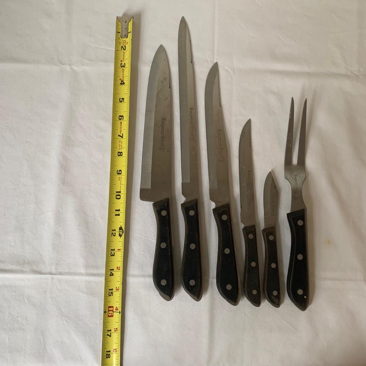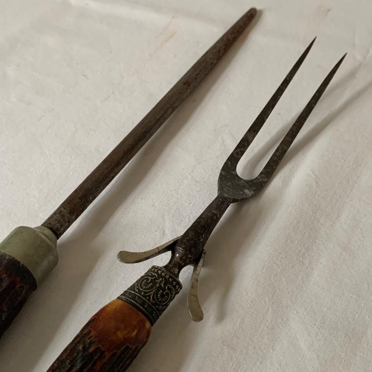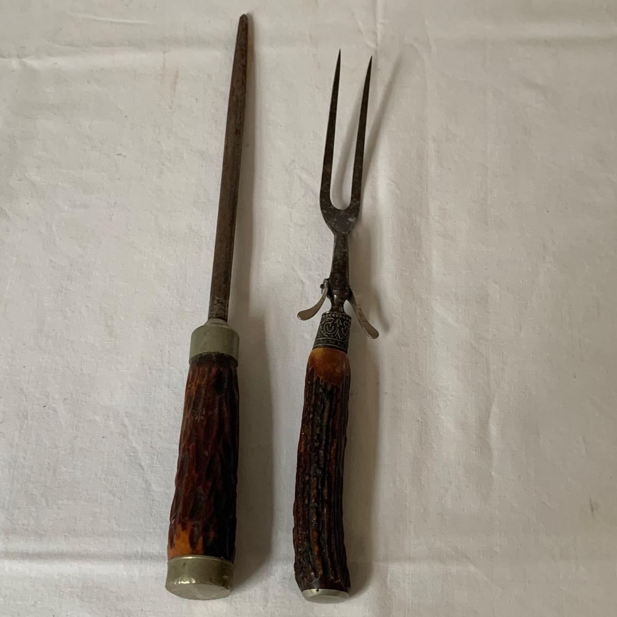 Emperor Steel knife set with five knives and one serving fork, as well as a unique serving fork and knife sharpener with horn or possibly faux horn handles. The Emperor knife set is in good condition and could just use a good cleaning. The carving utensils show minor wear with rust and tarnishing.