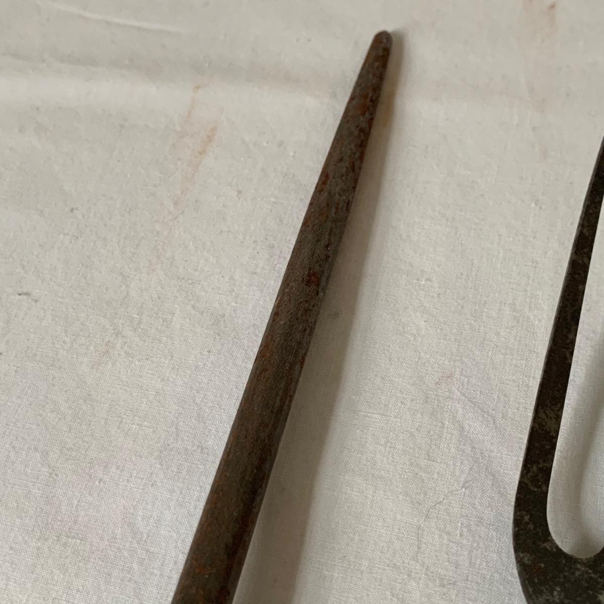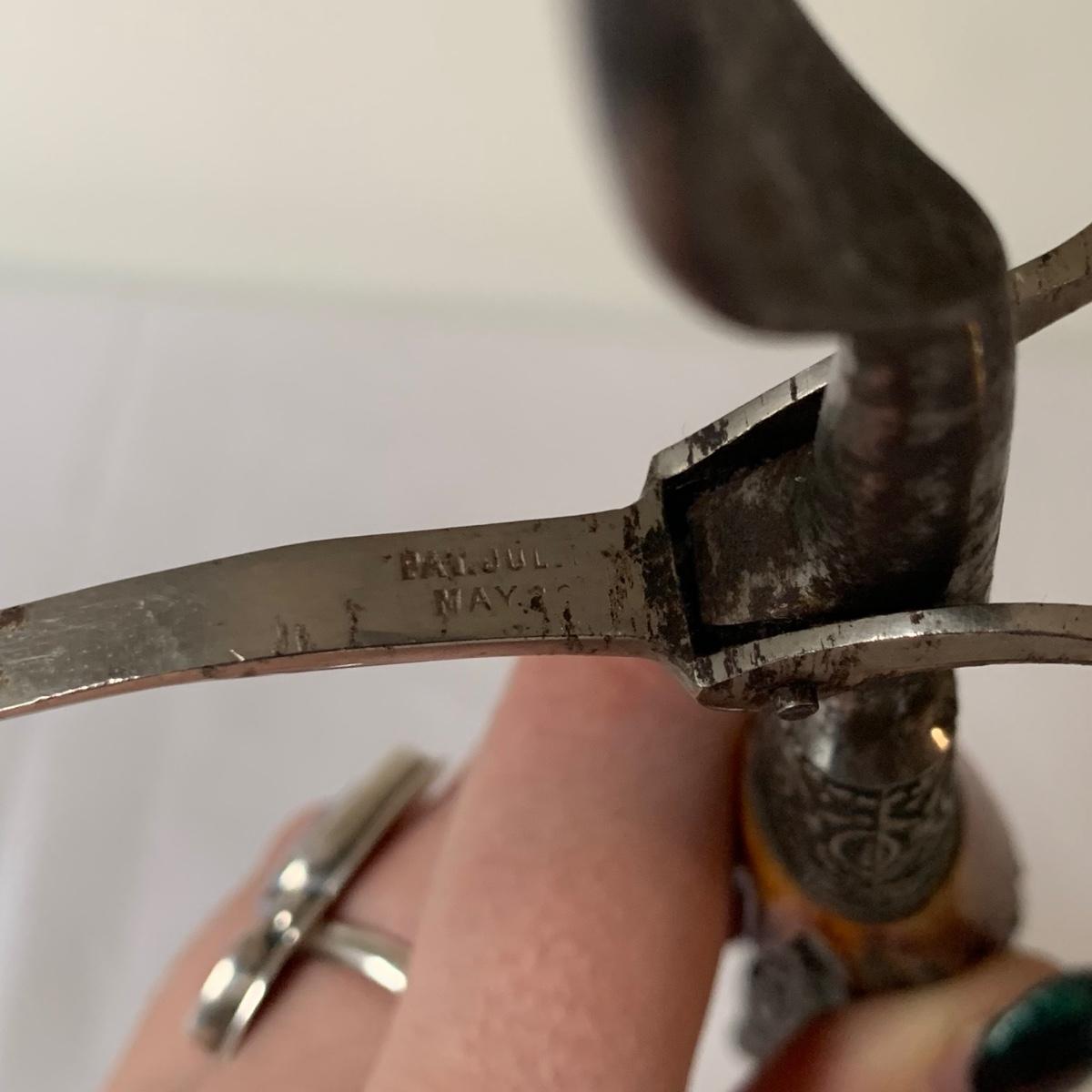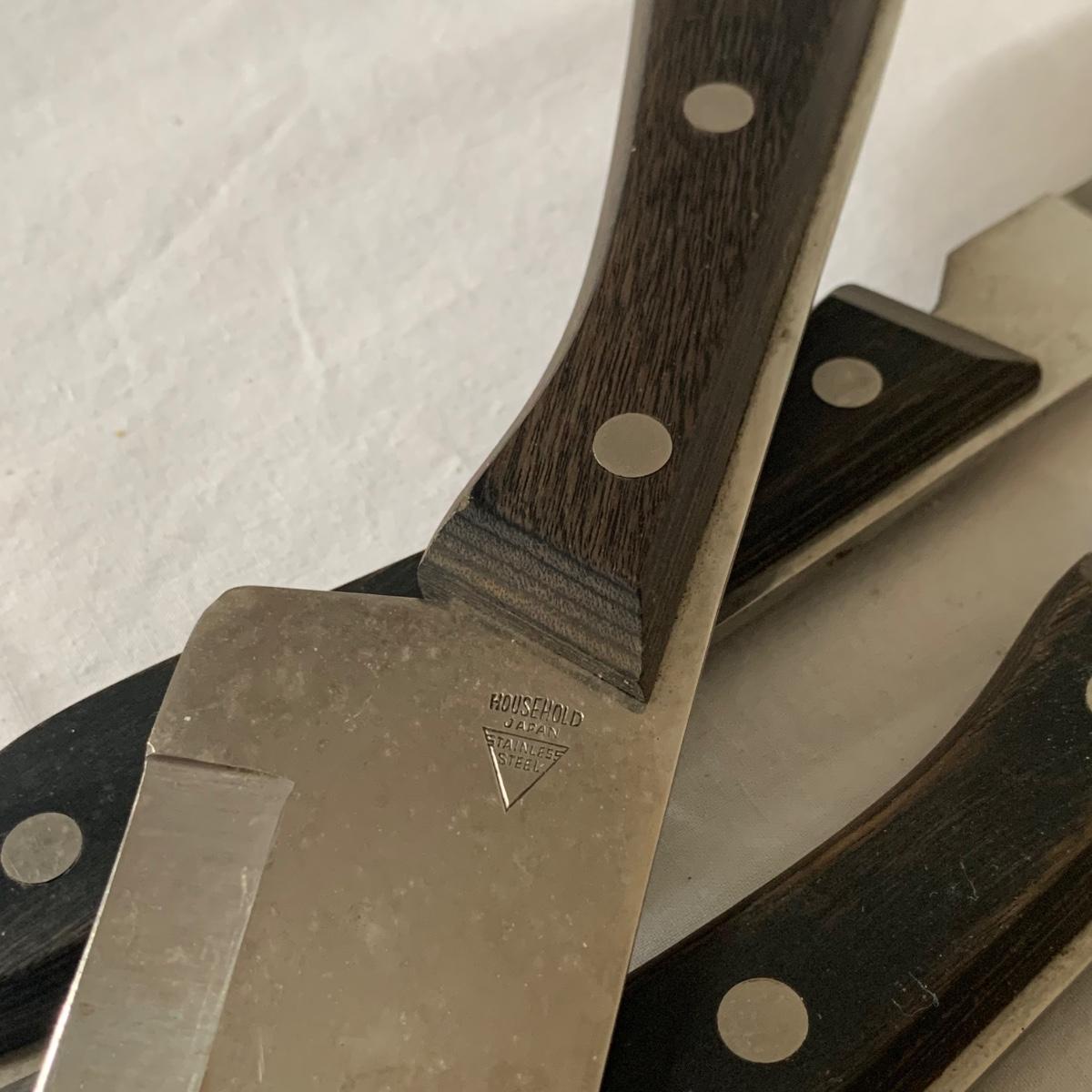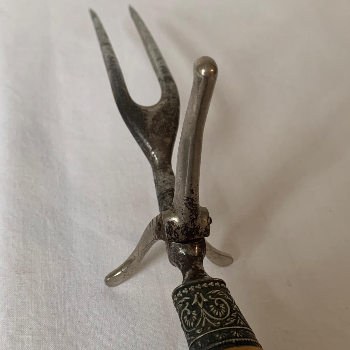 Emperor Steel knife set with five knives and one serving fork, as well as a unique serving fork and knife sharpener with horn or possibly faux horn handles. The Emperor knife set is in good condition and could just use a good cleaning. The carving utensils show minor wear with rust and tarnishing.
