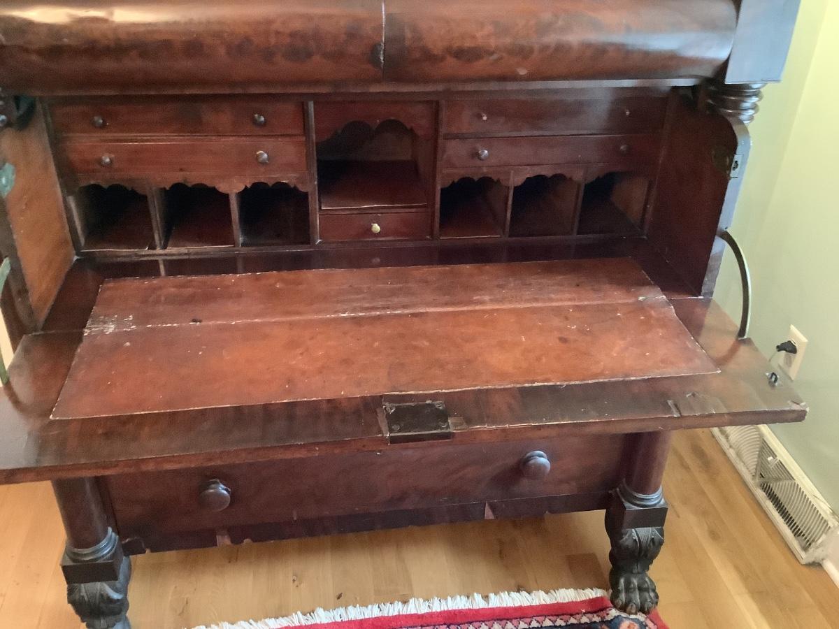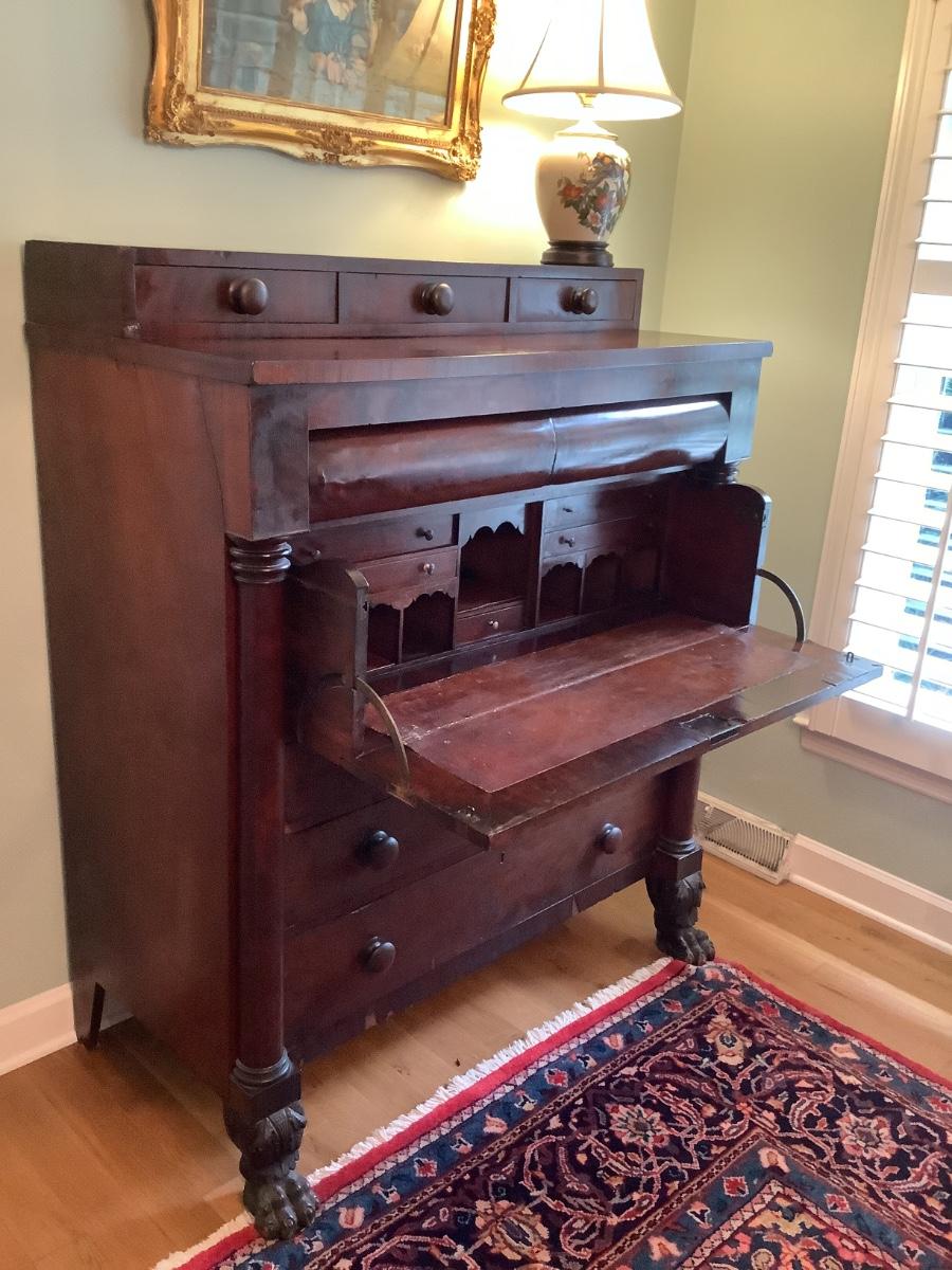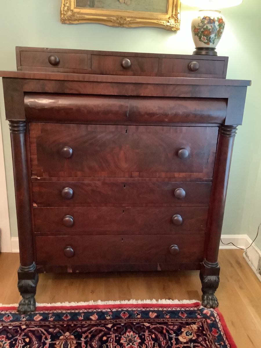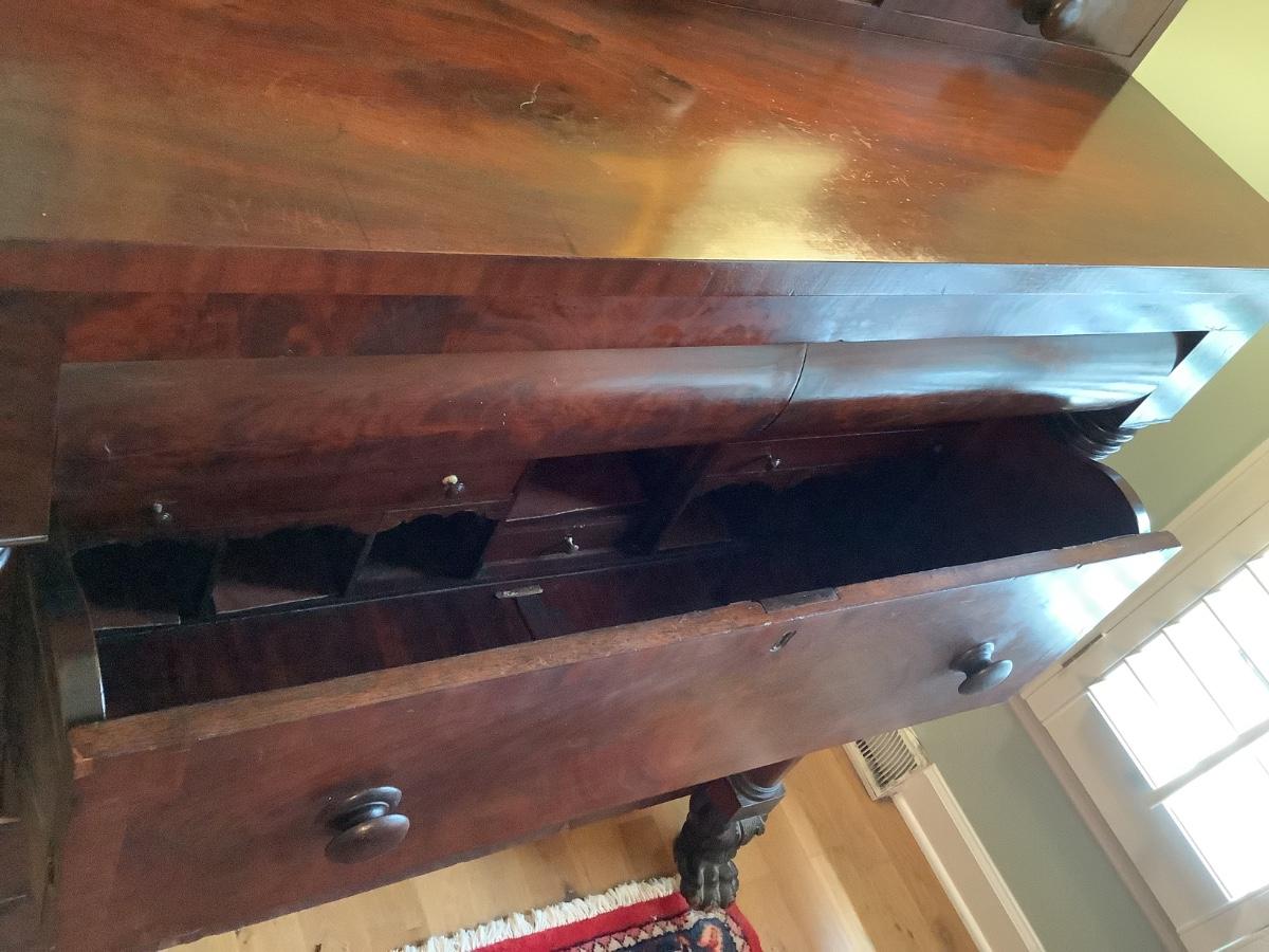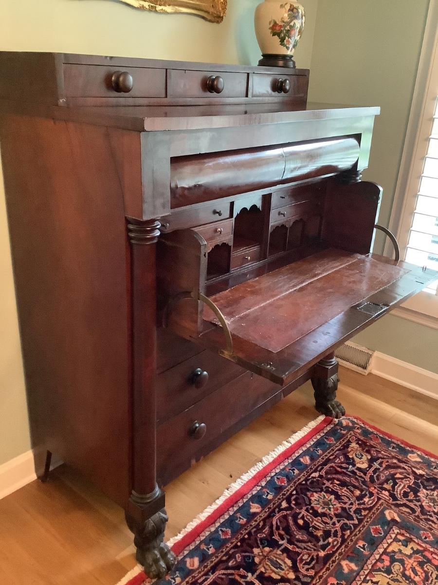 Empire chest & secretary - burl wood, claw carved feet, 3 top dovetail drawers and 4 drawers inside, 3 bottom drawers, leather on the drop down, 6 letter slots, secret drawer. This piece came from PA, no makers mark but obvious quality. Empire from the 1815 Napoleonic Empire.