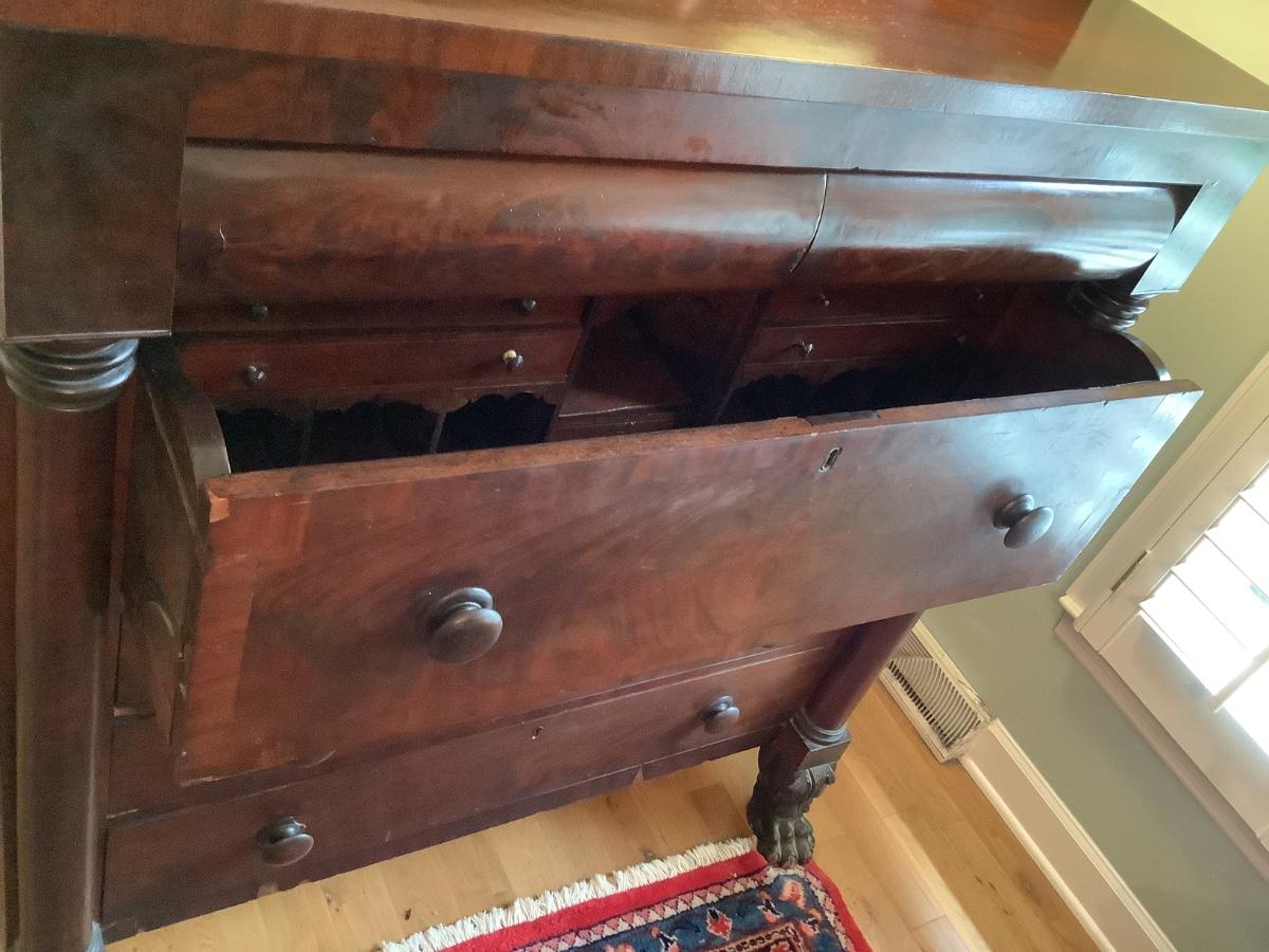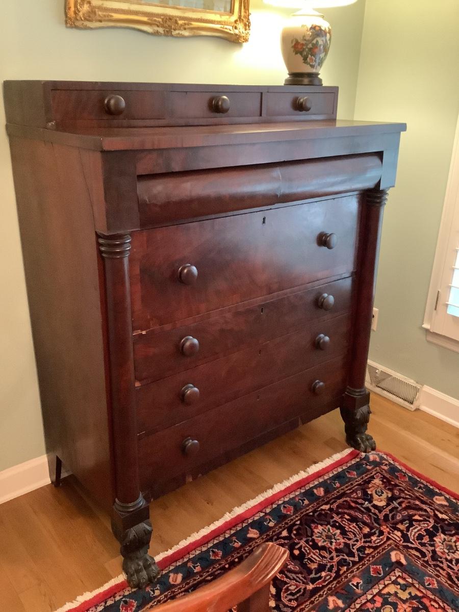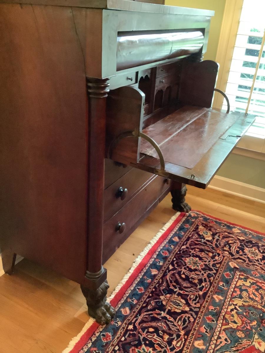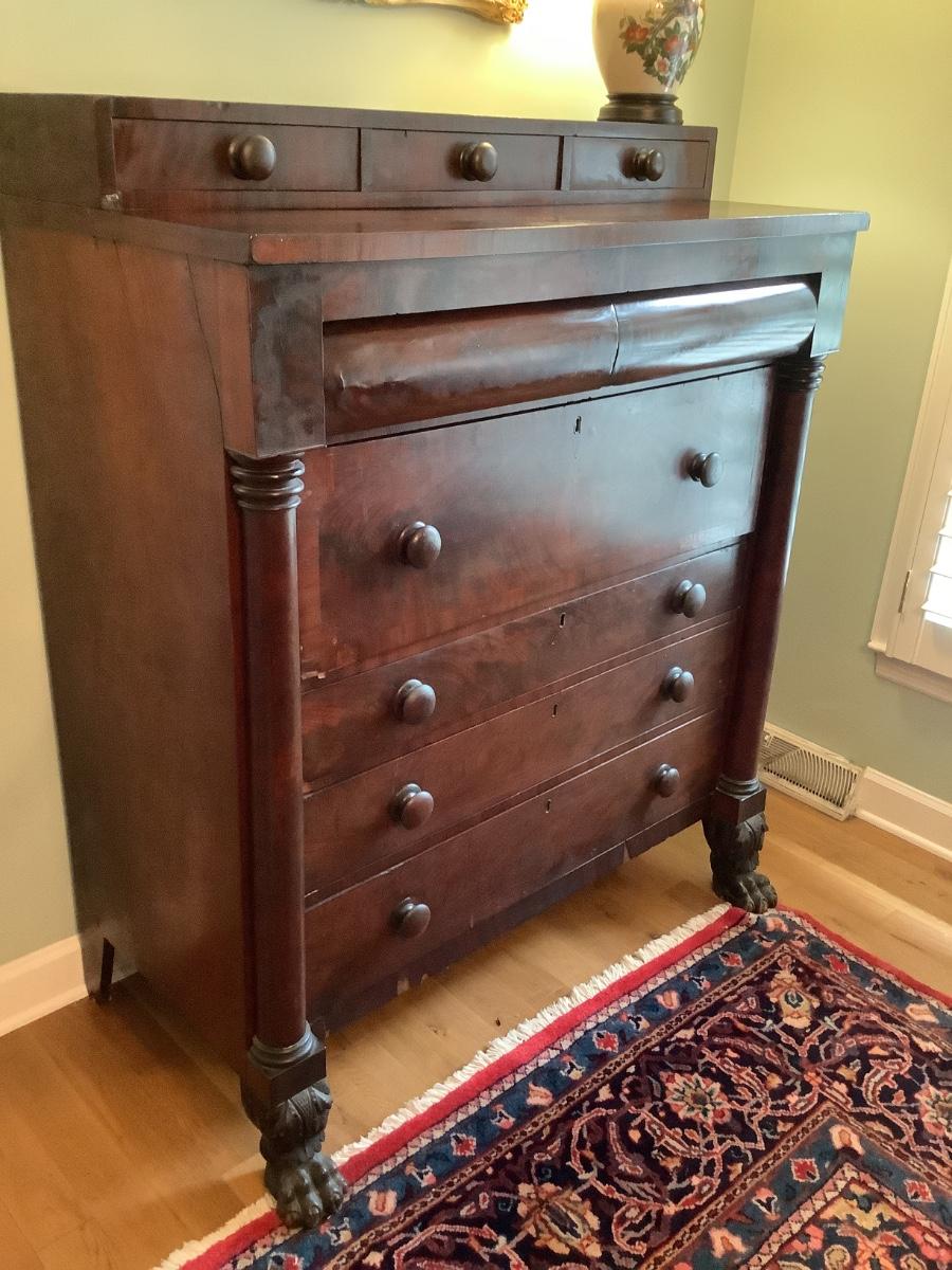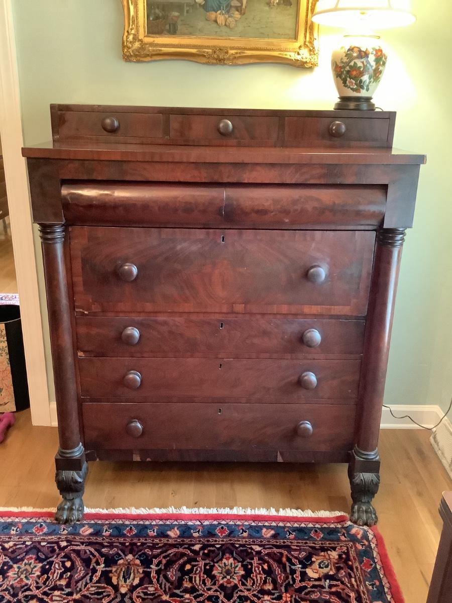 Empire chest & secretary - burl wood, claw carved feet, 3 top dovetail drawers and 4 drawers inside, 3 bottom drawers, leather on the drop down, 6 letter slots, secret drawer. This piece came from PA, no makers mark but obvious quality. Empire from the 1815 Napoleonic Empire.