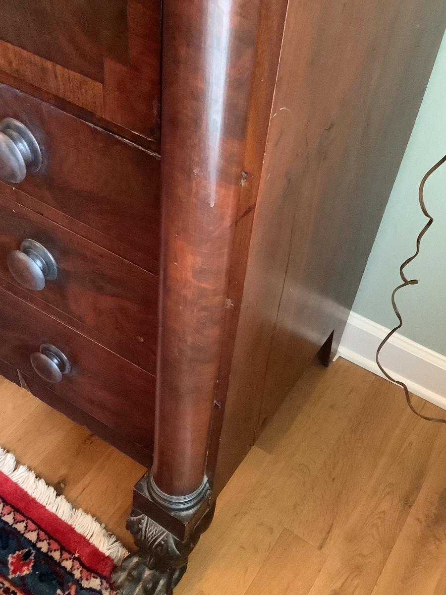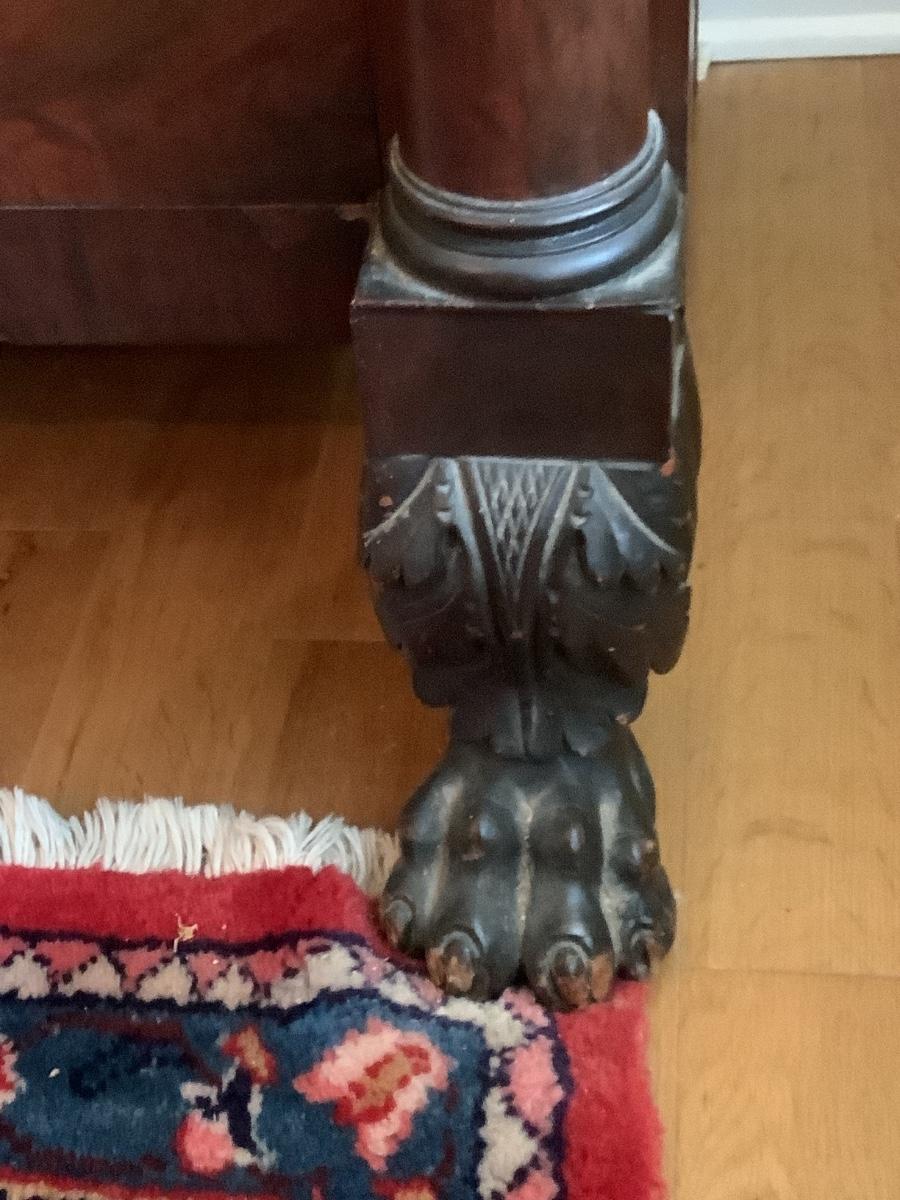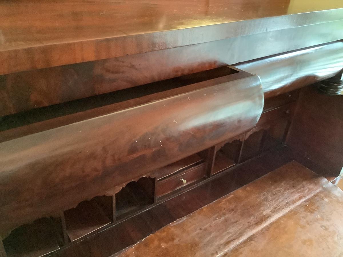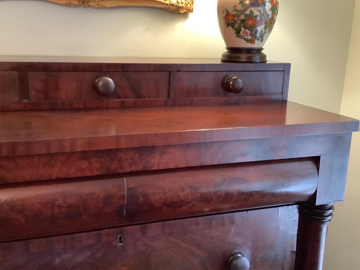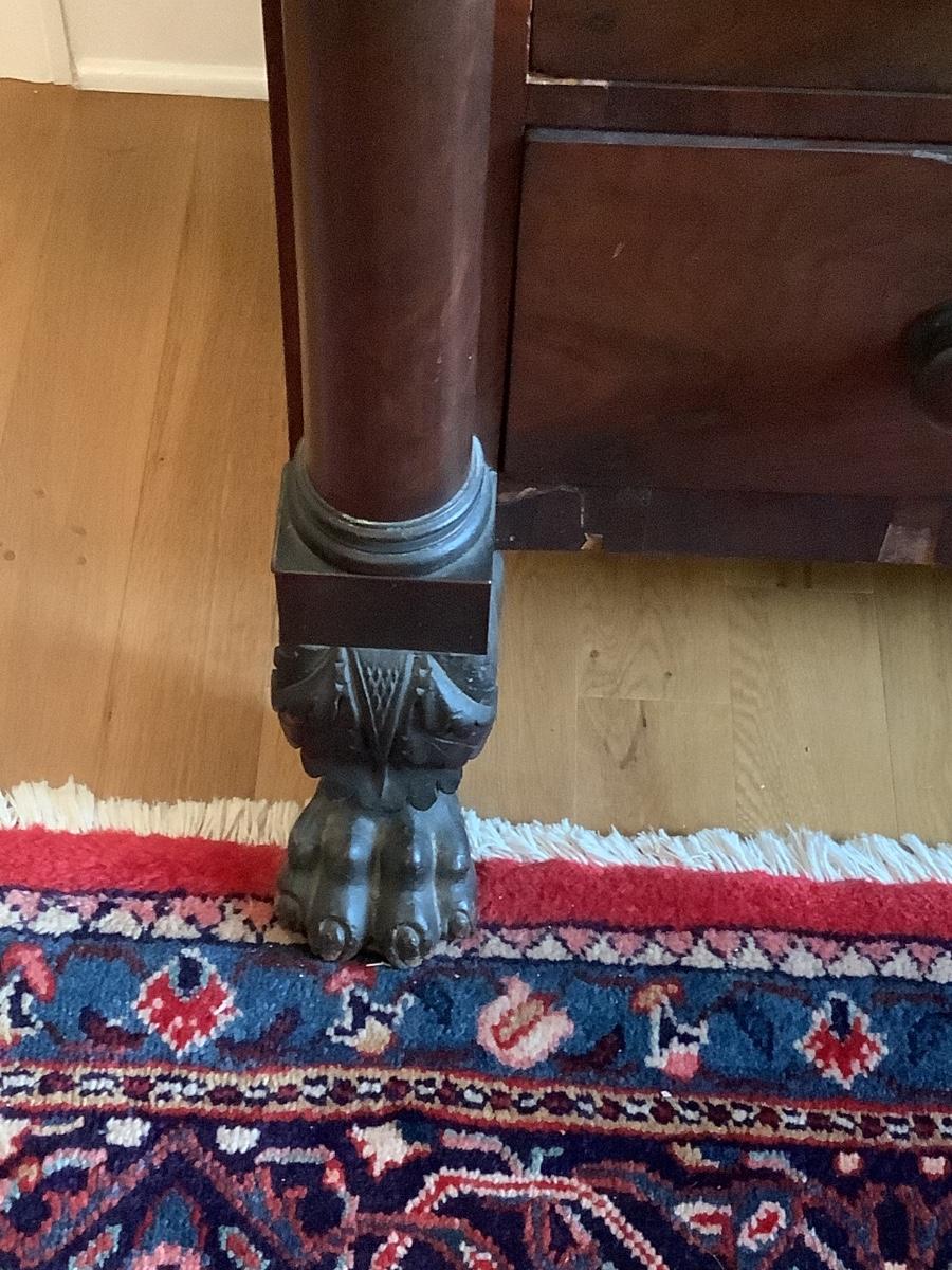 Empire chest & secretary - burl wood, claw carved feet, 3 top dovetail drawers and 4 drawers inside, 3 bottom drawers, leather on the drop down, 6 letter slots, secret drawer. This piece came from PA, no makers mark but obvious quality. Empire from the 1815 Napoleonic Empire.