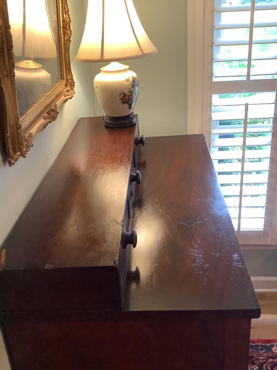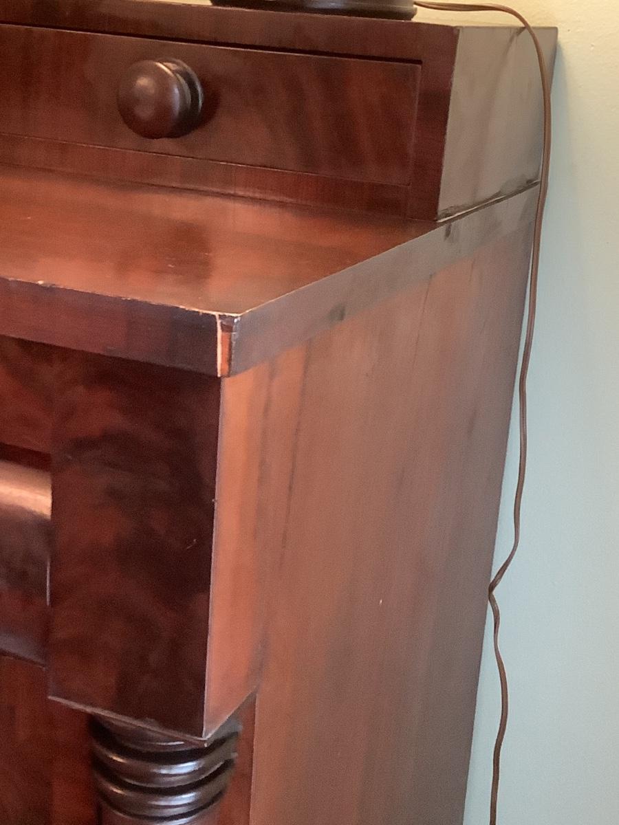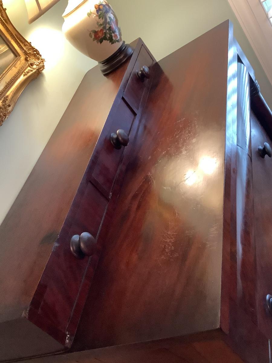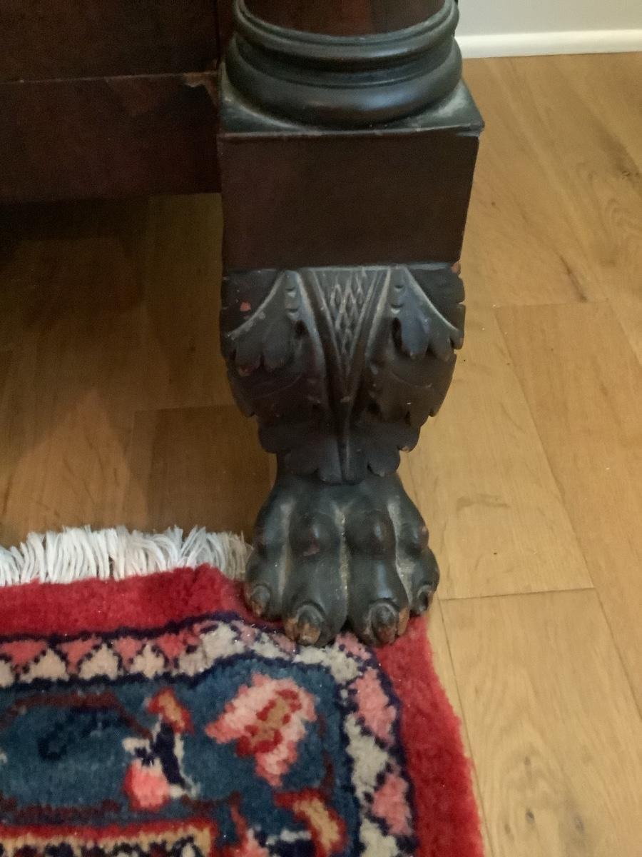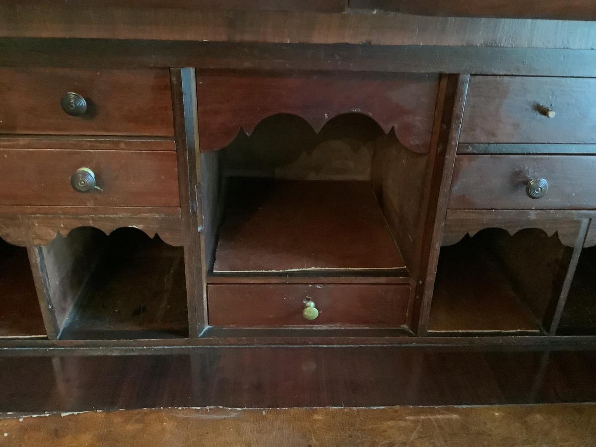 Empire chest & secretary - burl wood, claw carved feet, 3 top dovetail drawers and 4 drawers inside, 3 bottom drawers, leather on the drop down, 6 letter slots, secret drawer. This piece came from PA, no makers mark but obvious quality. Empire from the 1815 Napoleonic Empire.