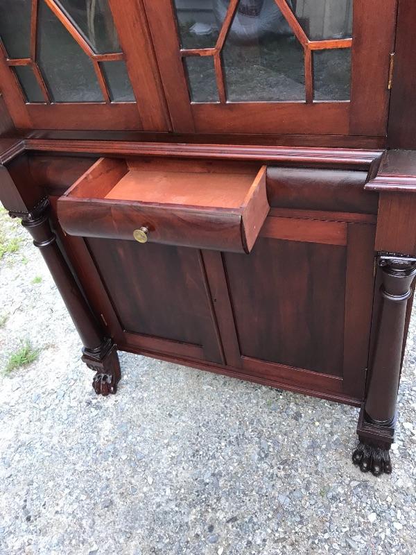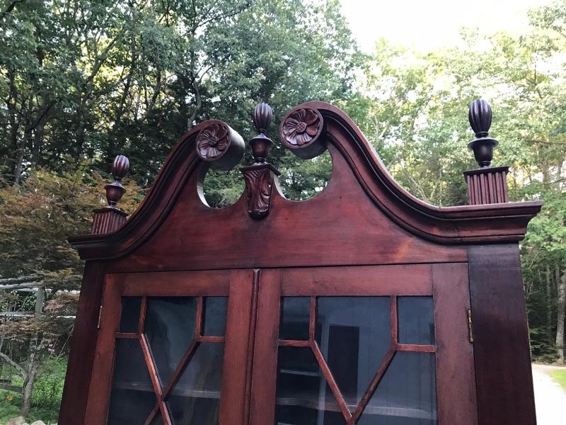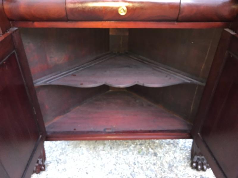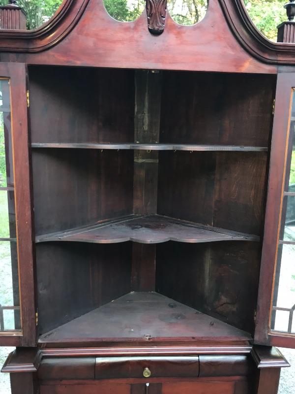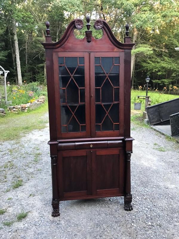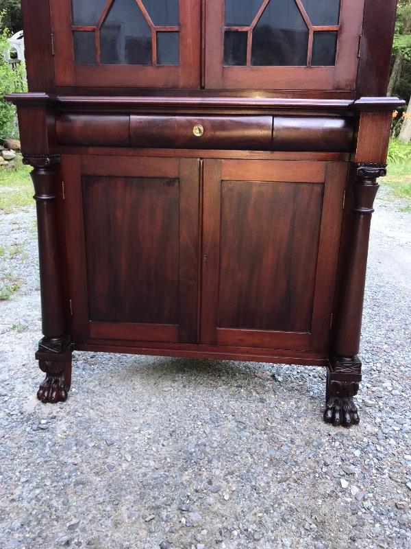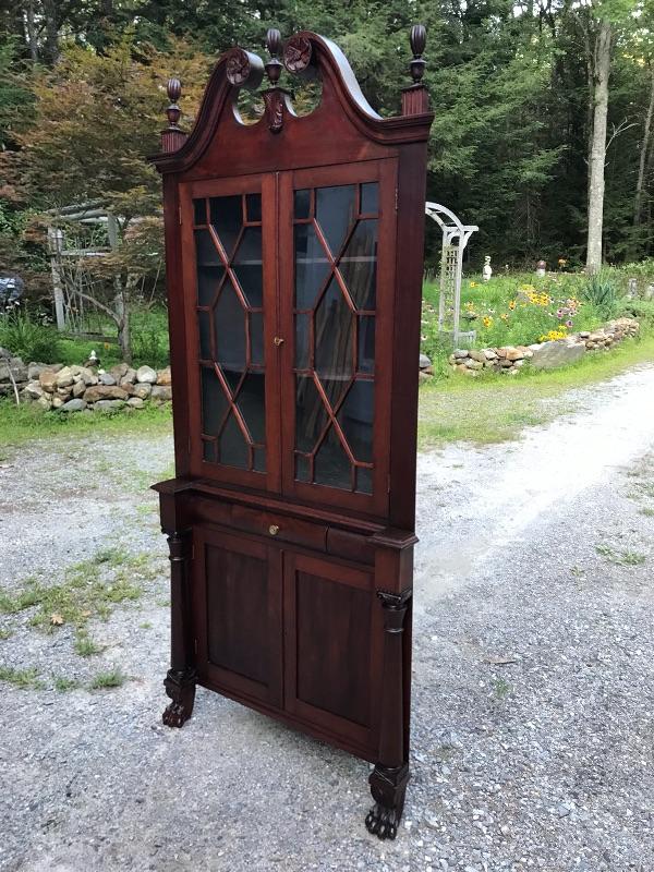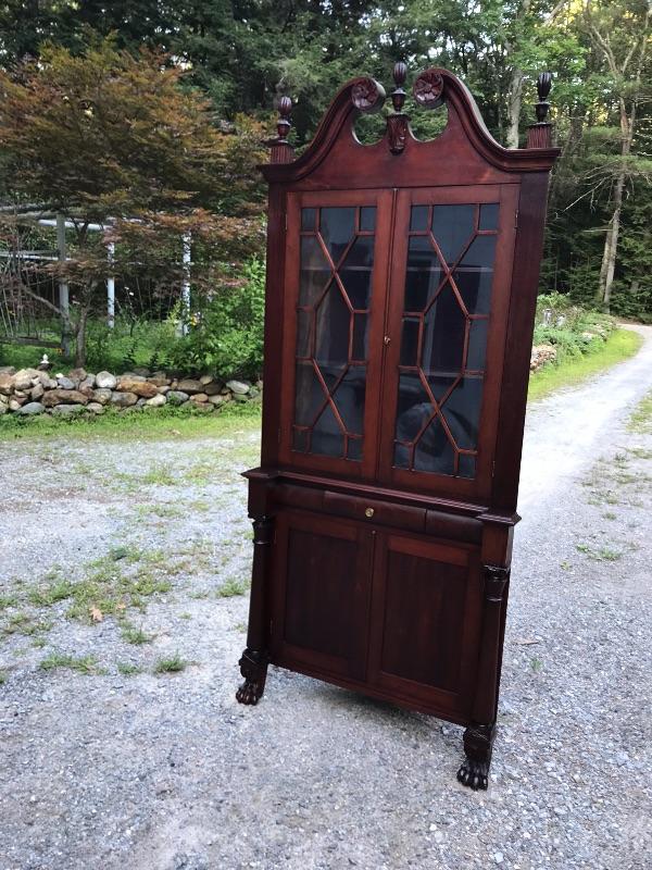 This is a beautiful Empire Classical mahogany corner cabinet. I do not know the age of the piece. It has a broken arch pediment with three finials. The finials are removable. It has two glass doors that lock above a single small drawer and a cabinet below that also locks. There are two shelves in the bottom cabinet. The cabinet is flanked by two columns that sit on top of hairy paw feet. Overall, it is in excellent condition. The dimensions are: 87" tall by 38 3/4" wide by 20" deep.