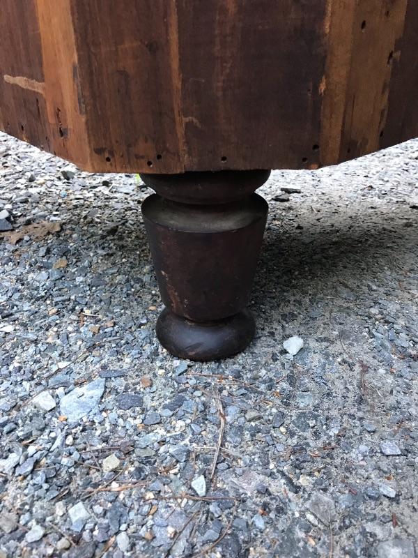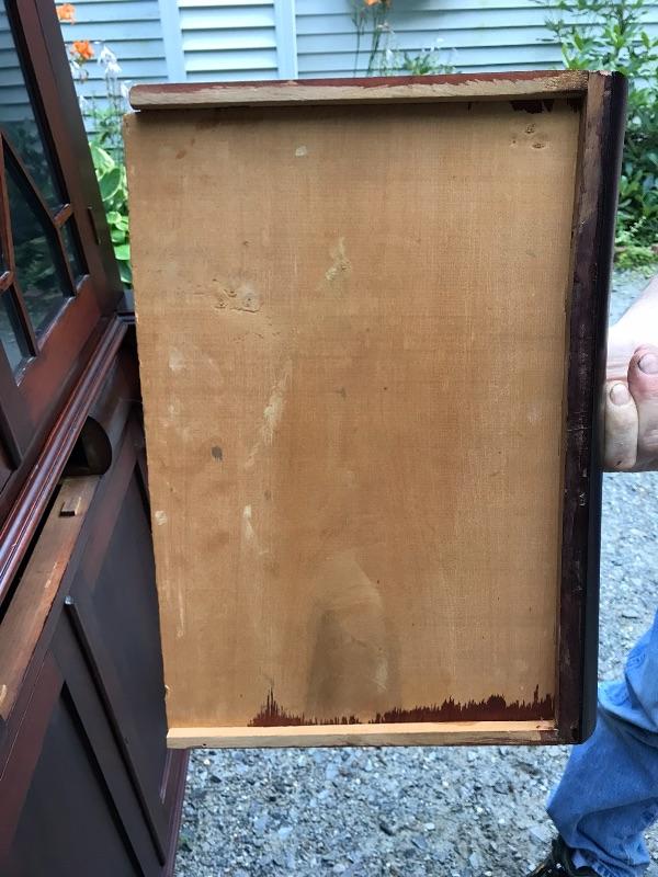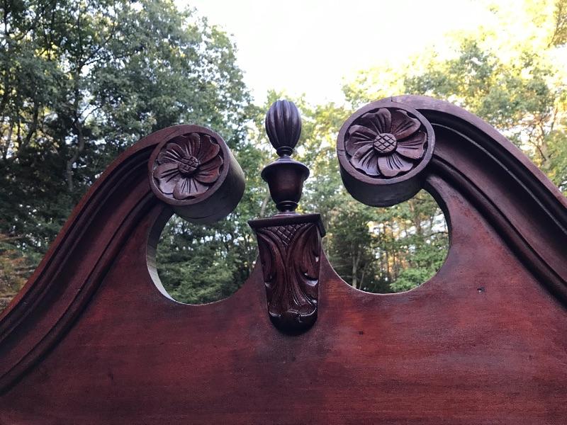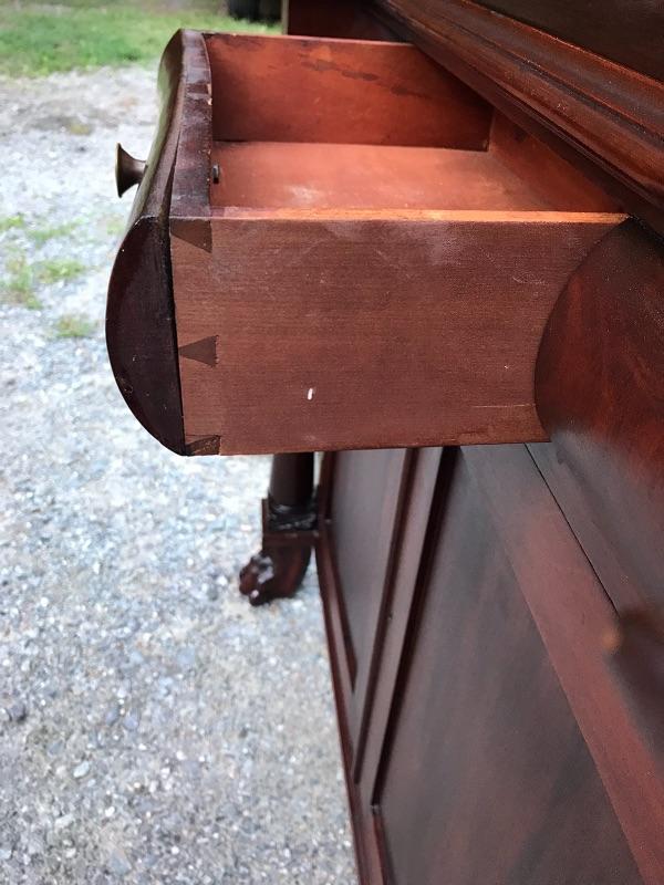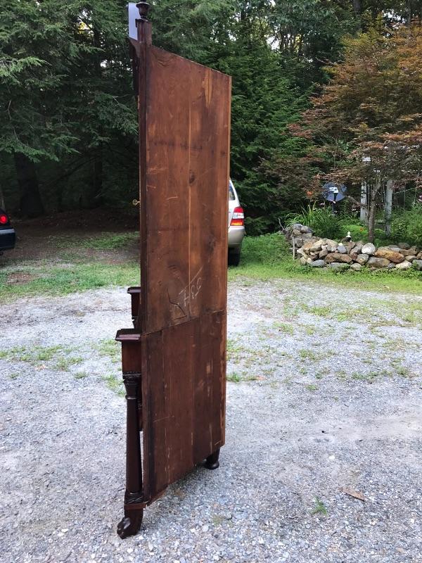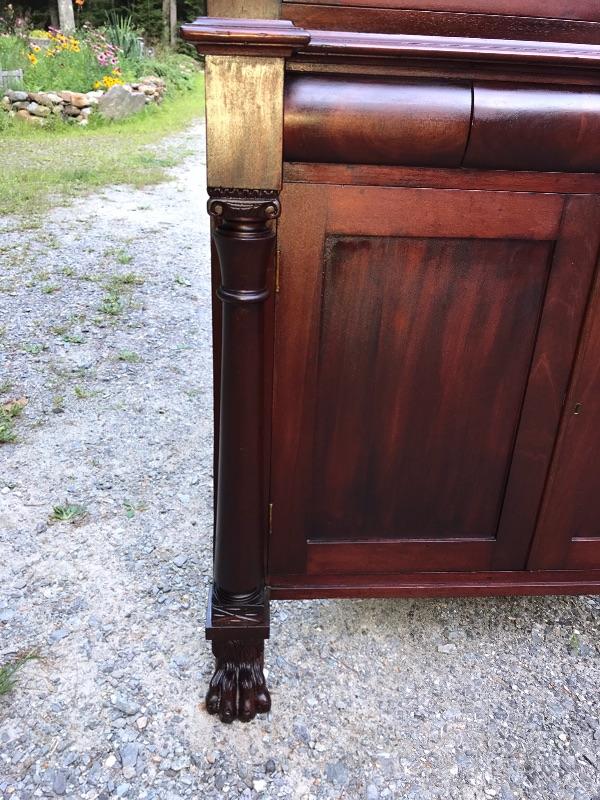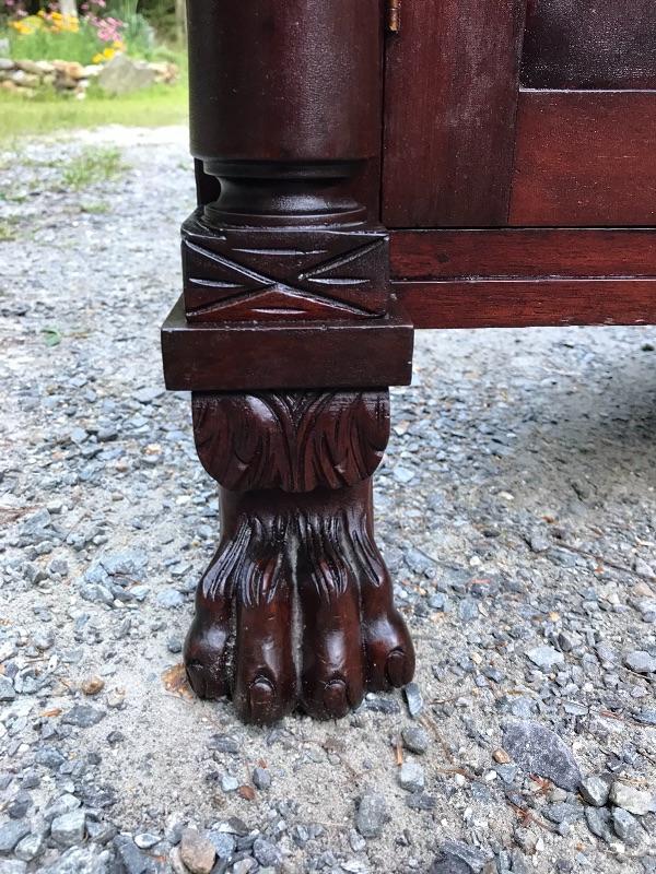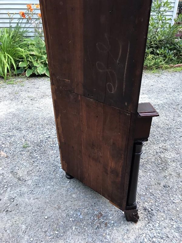 This is a beautiful Empire Classical mahogany corner cabinet. I do not know the age of the piece. It has a broken arch pediment with three finials. The finials are removable. It has two glass doors that lock above a single small drawer and a cabinet below that also locks. There are two shelves in the bottom cabinet. The cabinet is flanked by two columns that sit on top of hairy paw feet. Overall, it is in excellent condition. The dimensions are: 87" tall by 38 3/4" wide by 20" deep.