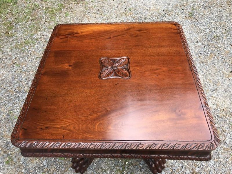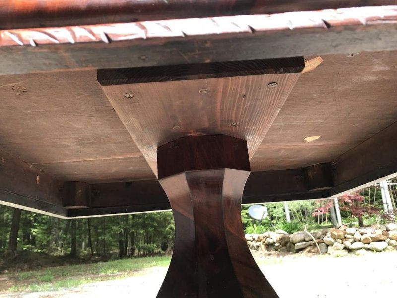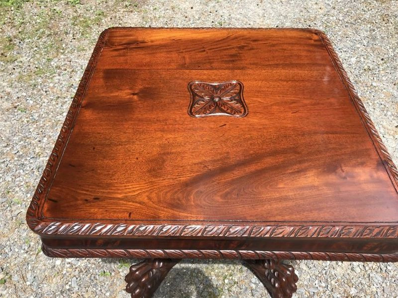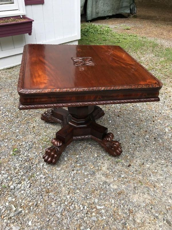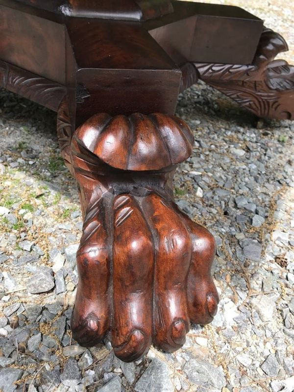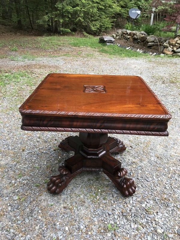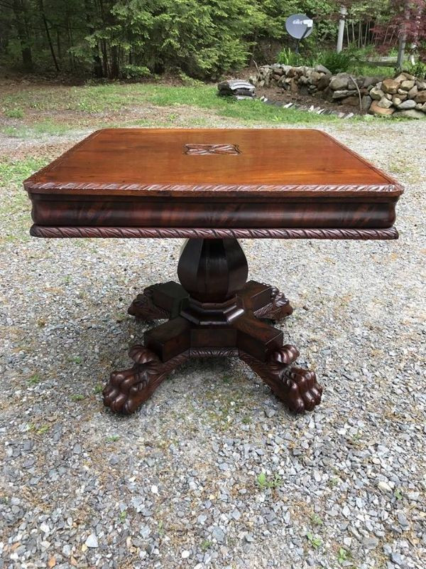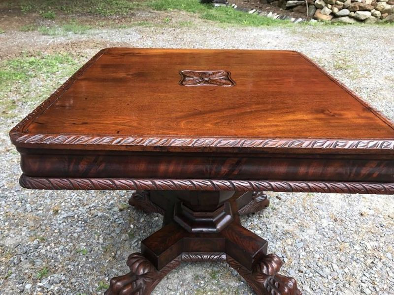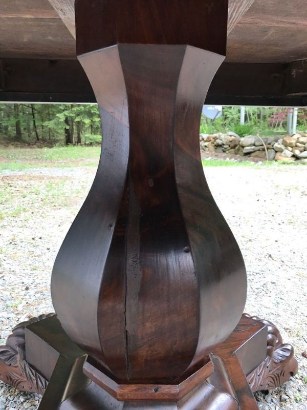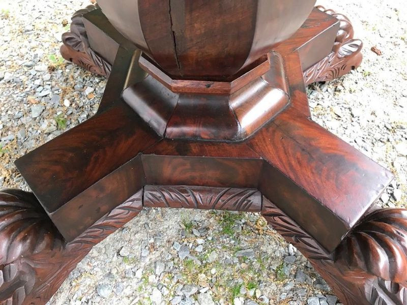 This is a beautiful Empire mahogany table. It is made of solid mahogany top with flame veneers and pine underlayment. The top has a foliate carved center with a carved edge design. The top sits on a flame ogee skirt that also has similar trim. The column is a New York classical urn shaped pedestal that sits on a plinth that is supported by four lion paw feet. The center column has a crack. The casters have been replaced. It has normal wear and tear for an antique of this age. Overall, it is in excellent condition. The dimensions are: 30" tall by 34 1/4" wide by 35 1/4" deep.