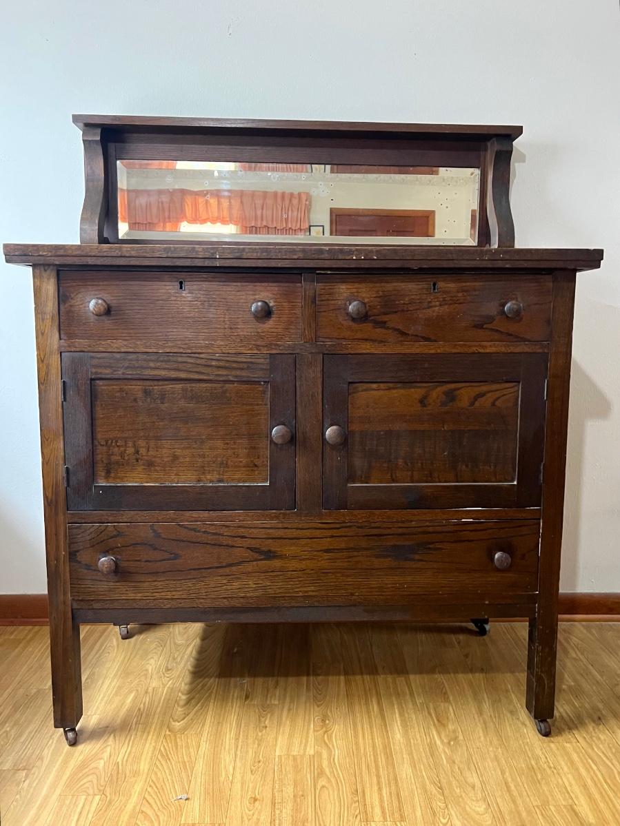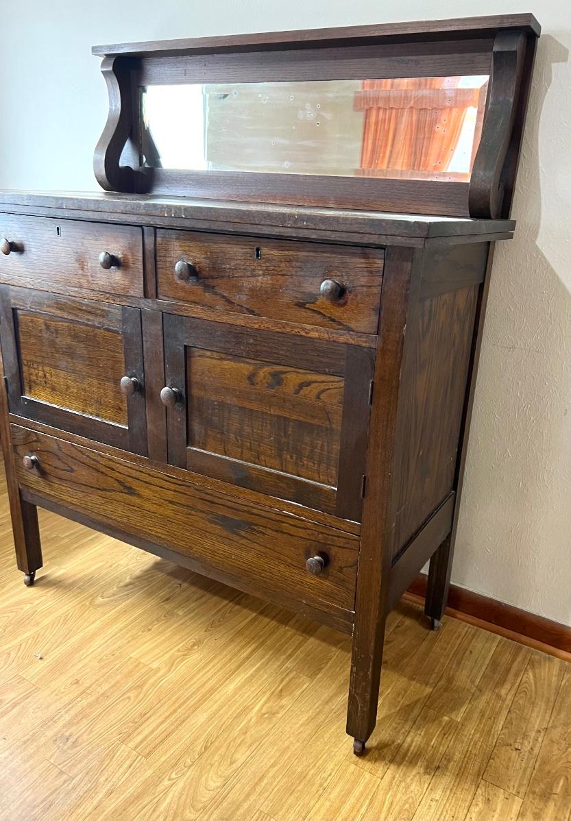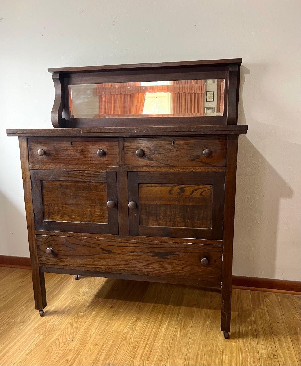 Empire Oak Antique Buffet with a mirror on top. This beauty Has been in the family a long time! Solid wood possibly tiger oak. Has plenty of storage Measures 51 inches tall, 42 inches long and 20 inches wide.