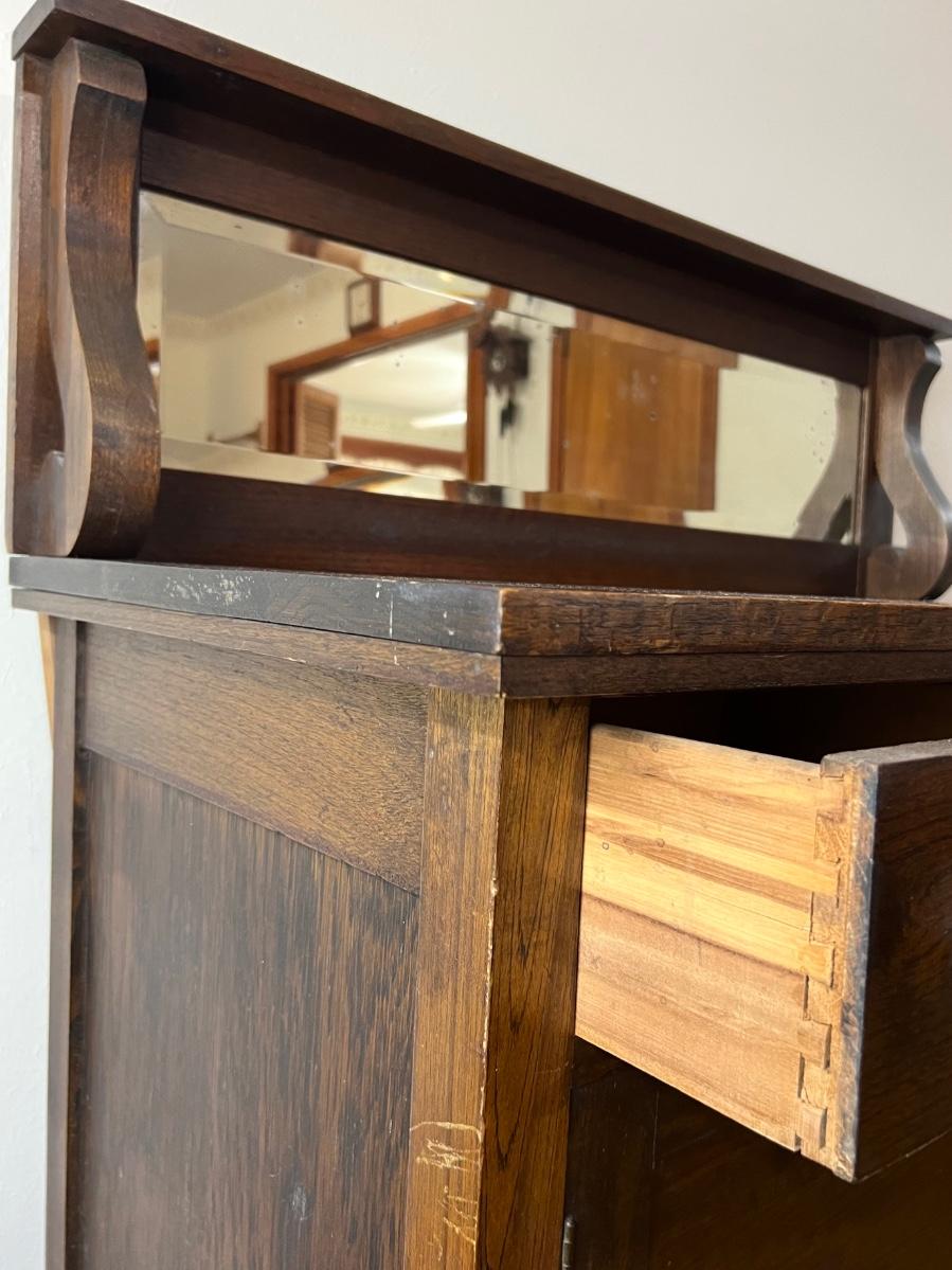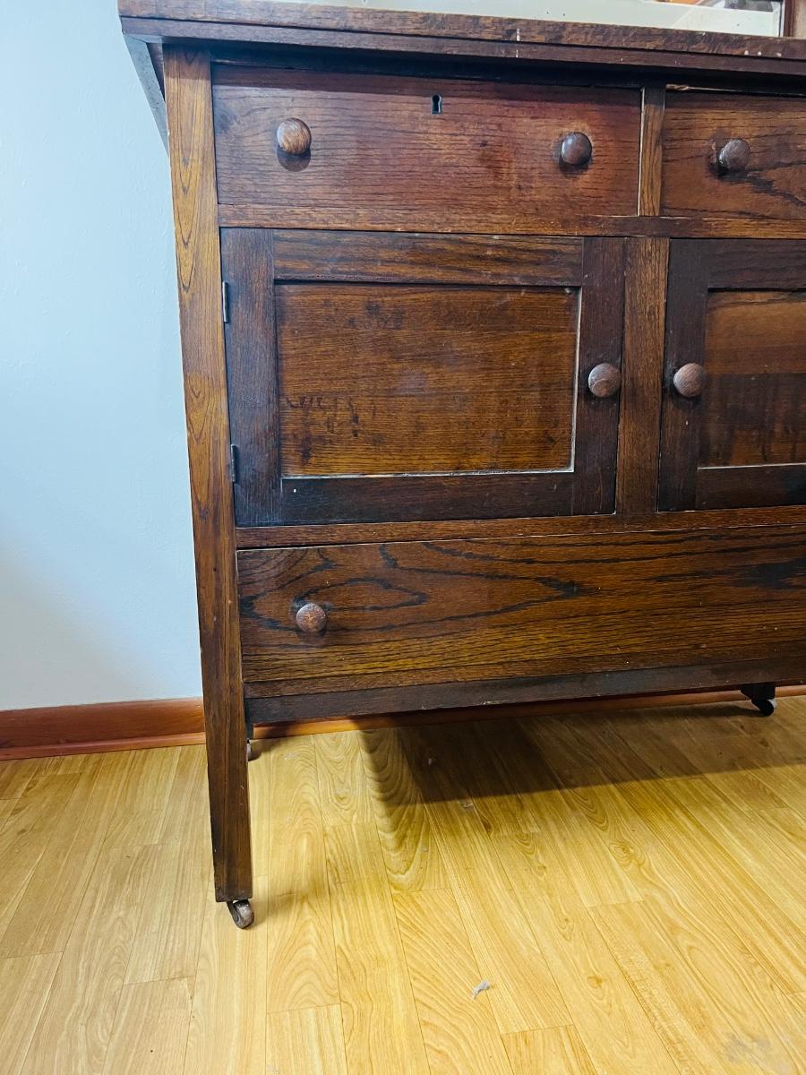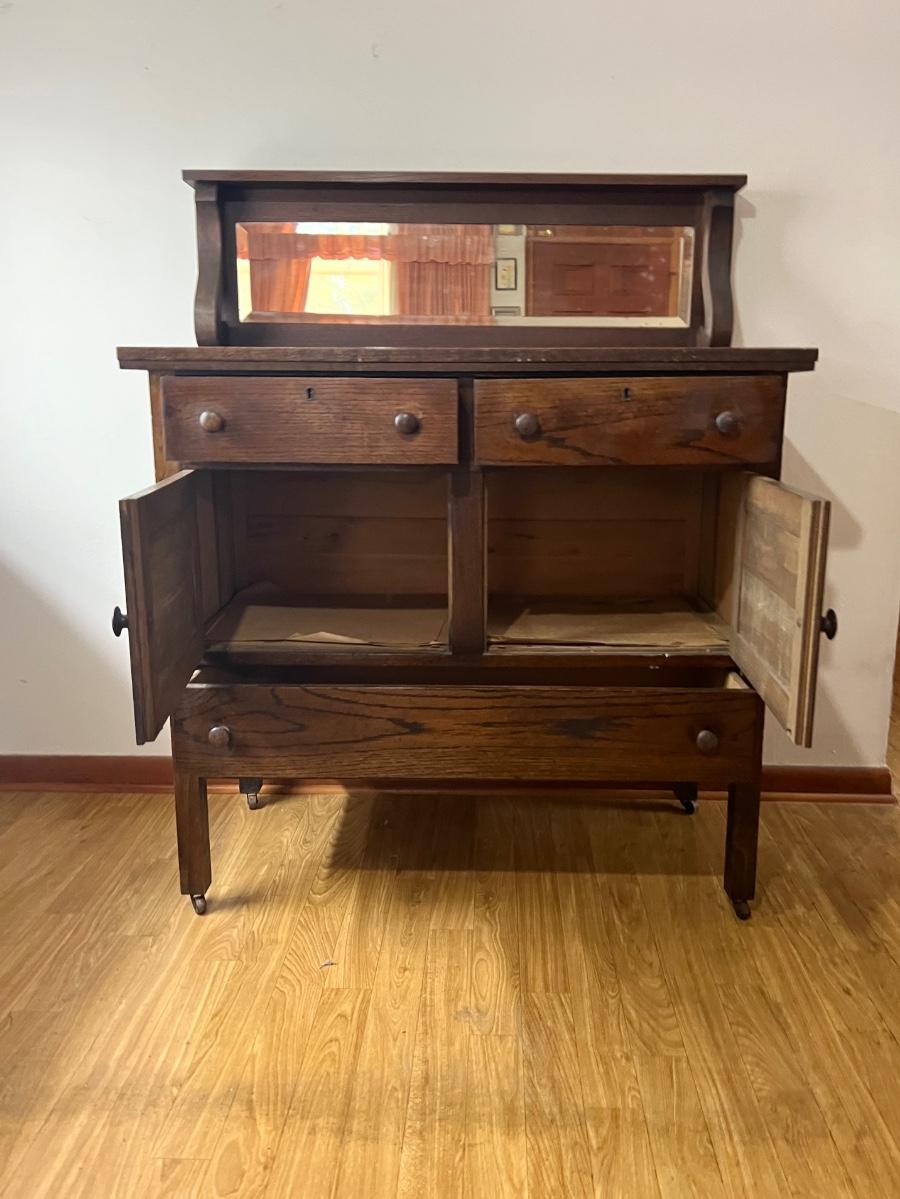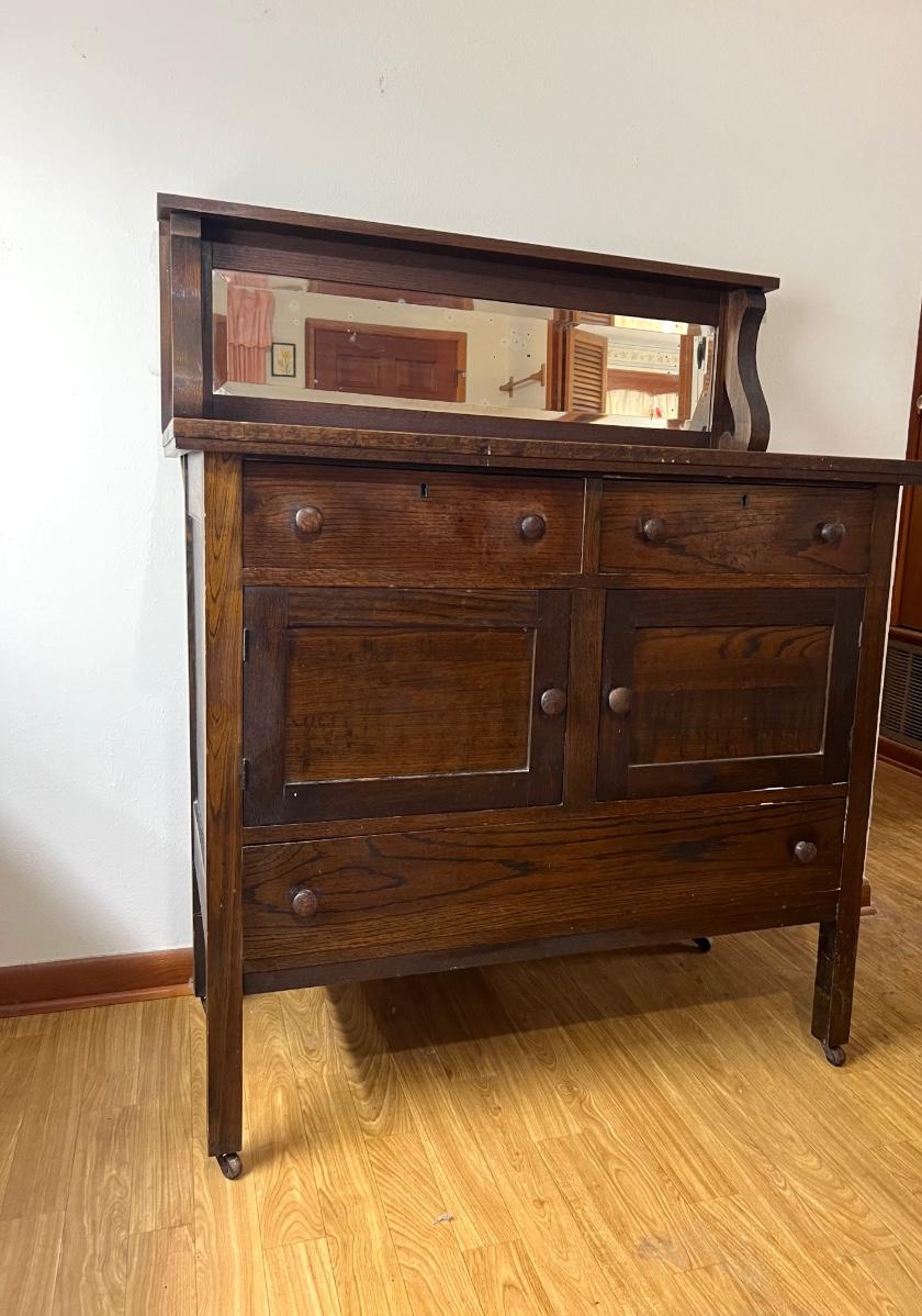Empire Oak Antique Buffet with a mirror on top. This beauty Has been in the family a long time! Solid wood possibly tiger oak. Has plenty of storage Measures 51 inches tall, 42 inches long and 20 inches wide.